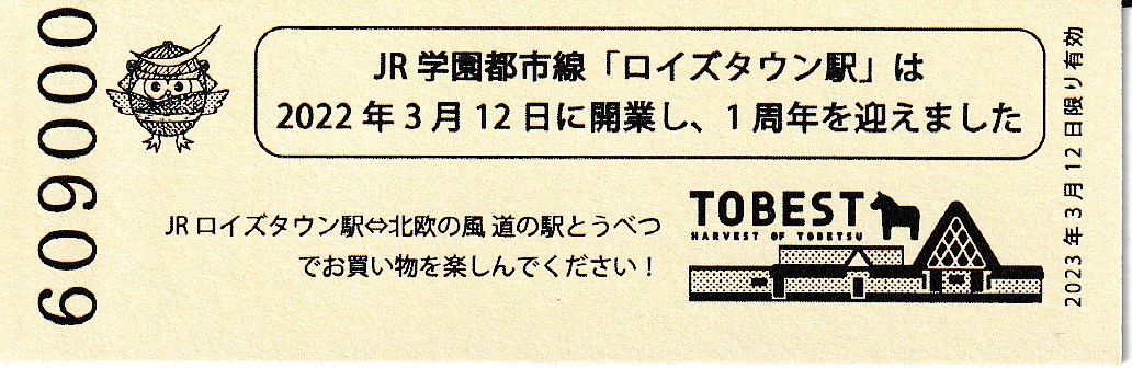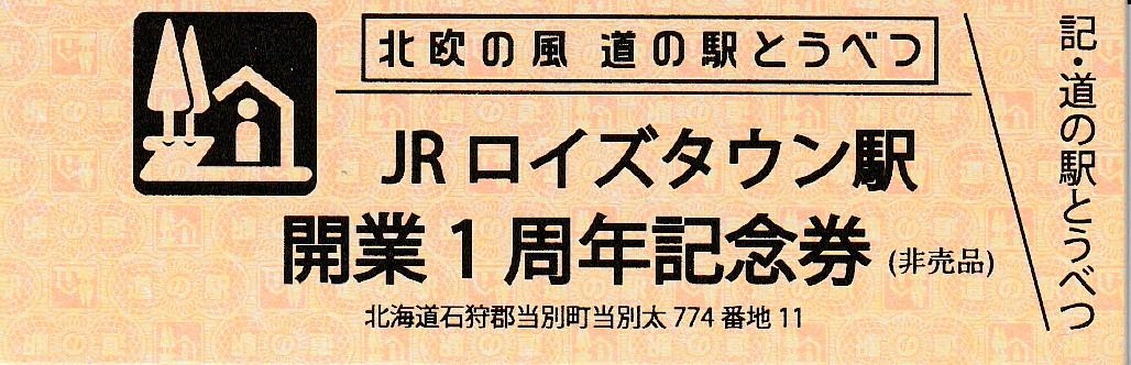 000001-000300:3周年記念きっぷ(配布終了) 000301-000600:JRロイズタウン駅開業記念券(配布終了) 000601-000900:JRロイズタウン駅開業1周年記念券(配布終了) 000901-001200:開業7周年記念券(配布終了) 001201-001500:開業8周年記念券(配布中)