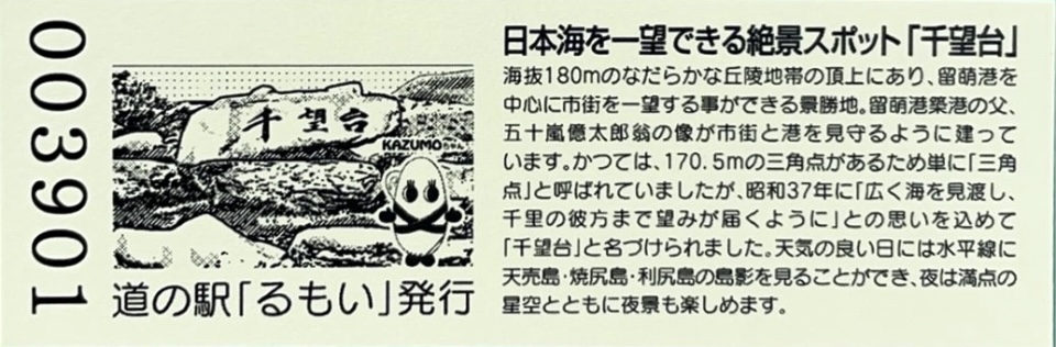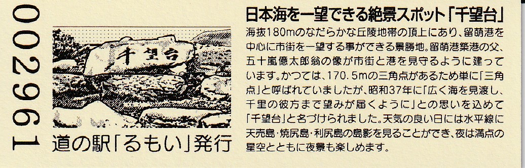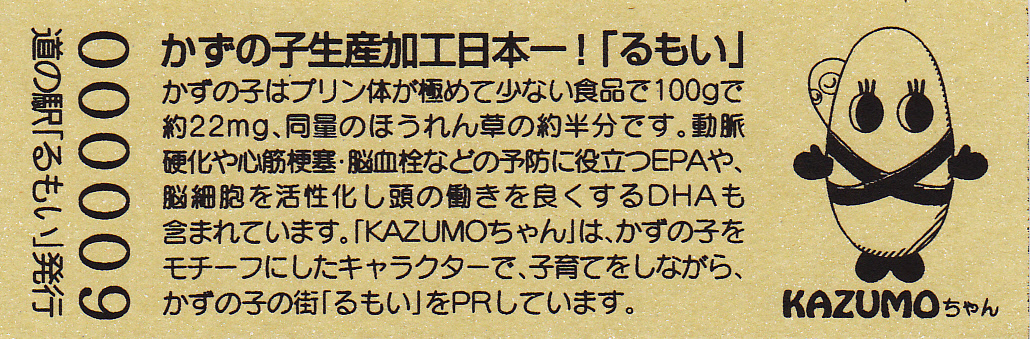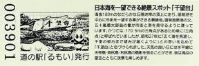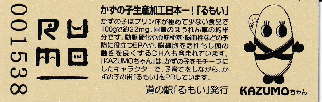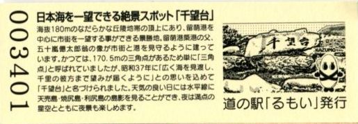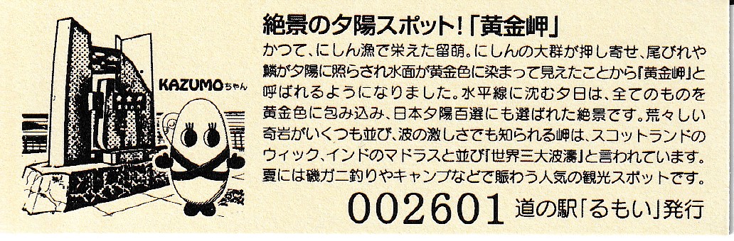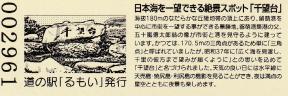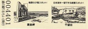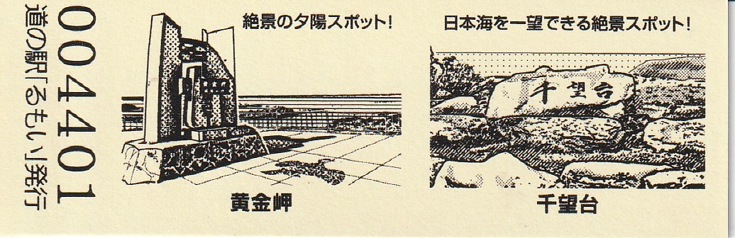 000001-000900:180円きっぷ(KAZUMOちゃん右) 000901-001200:180円きっぷ(KAZUMOちゃん左) 001201-001500:180円きっぷ(KAZUMOちゃん上) 001501-002000:180円きっぷ(KAZUMOちゃん右・道の駅ロゴ左) 002001-002300:180円きっぷ(「黄金岬」・イラスト左) 002301-002600:180円きっぷ(「黄金岬」・イラスト右) 002601-002900:180円きっぷ(「黄金岬」・イラスト左KAZUMOあり) 002901-003400:200円きっぷ(千望台・イラスト左) 003401-003900:200円きっぷ(千望台・イラスト右・KAZUMOちゃんあり) 003901-004400:200円きっぷ(千望台・イラスト左・KAZUMOちゃんあり) 004401- :200円きっぷ(黄金岬・千望台)