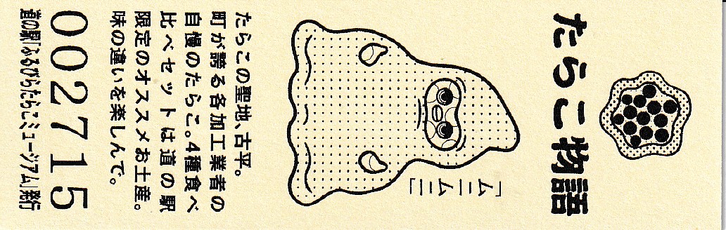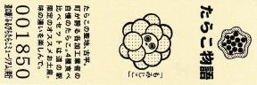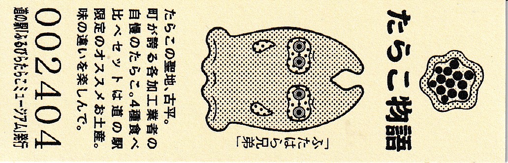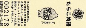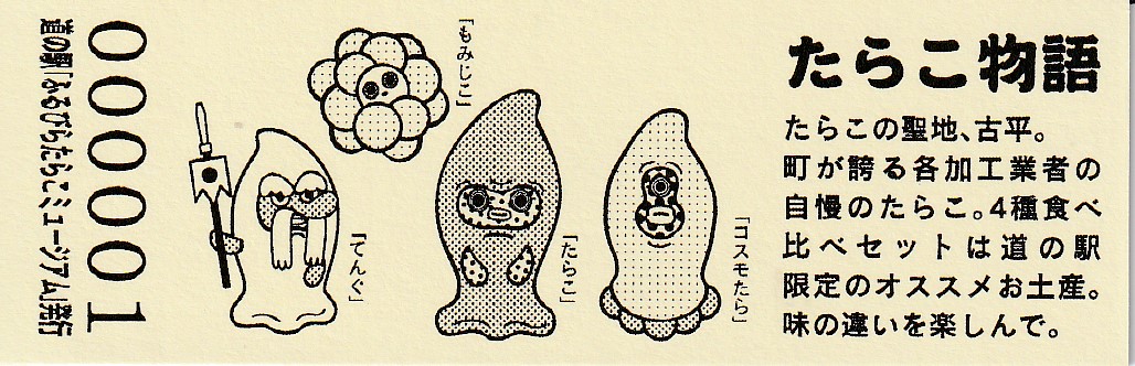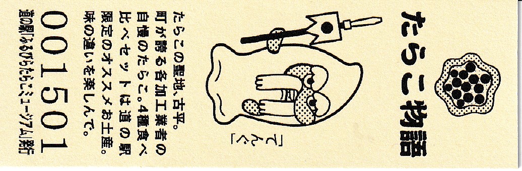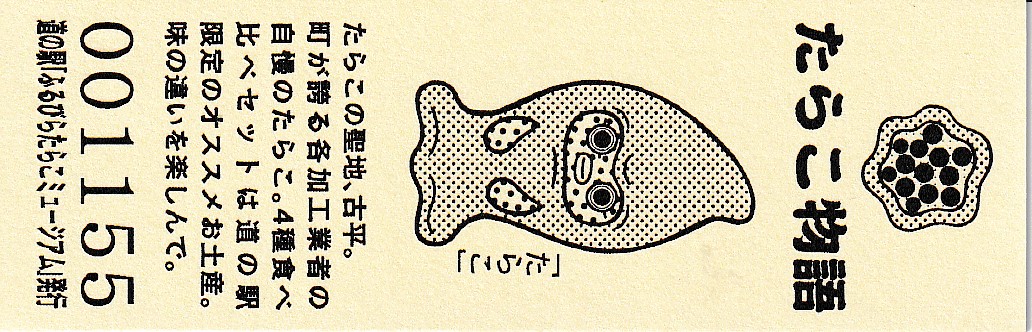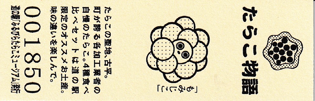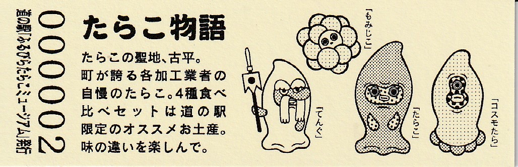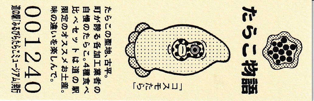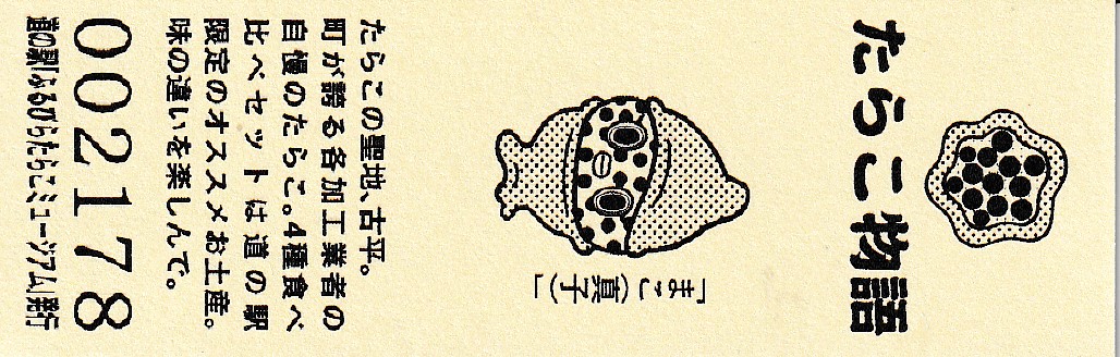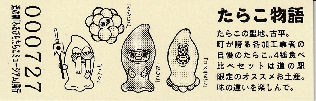 000001-000600:200円きっぷ(イラスト右) 000601-000900:200円きっぷ(イラスト左) 000901-001200:200円きっぷ(たらこ) 001201-001500:200円きっぷ(コスモたら) 001501-001800:200円きっぷ(てんぐ) 001801-002100:200円きっぷ(もみじこ) 002101-002400:200円きっぷ(まこ(真子)) 002401-002700:200円きっぷ(ふたはら兄弟) 002701- :200円きっぷ(ムニムニ)