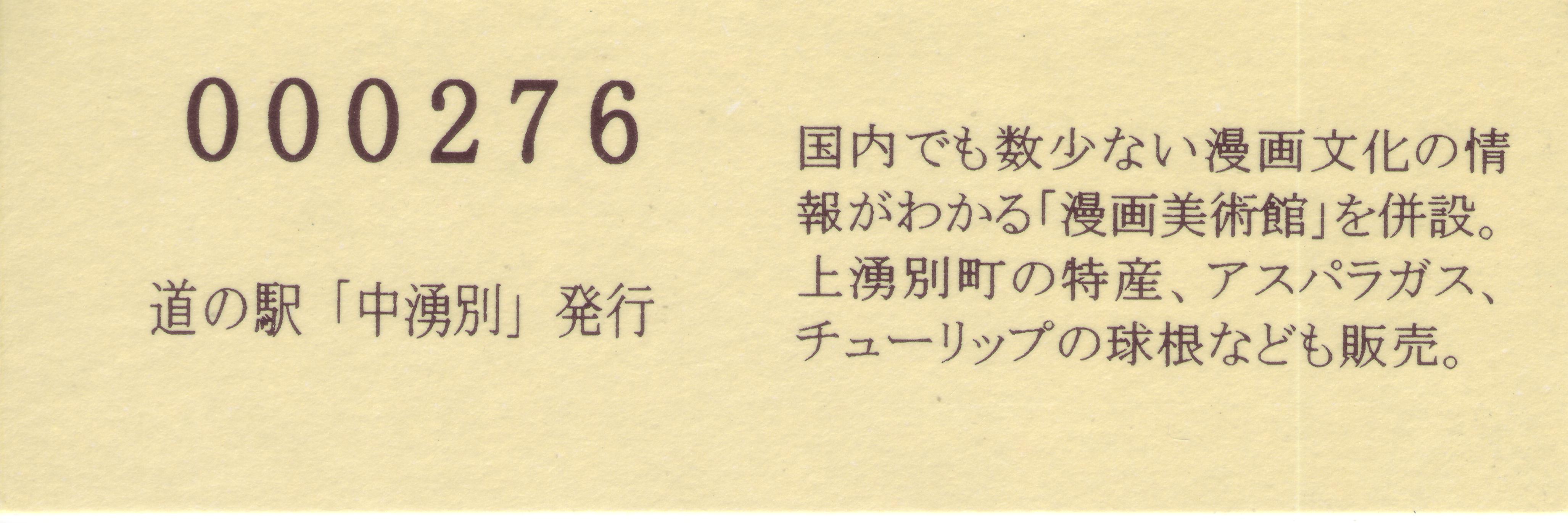0001-0300:記念入場券(通常券) ※駅名は「中湧別」 0301-1200:記念きっぷ(入) 1201-2700:記念きっぷ(記) 2701-3600:デザインきっぷ(チューピットとチューリップ) 3601-4000:デザインきっぷ(チューリップの湯・牛なし・上湧別町) 4001-4800:デザインきっぷ(チューリップの湯・牛なし・湧別町) 4801-5900:デザインきっぷ(チューリップの湯・牛あり) 5901-9700:180円きっぷ 9701- :200円きっぷ