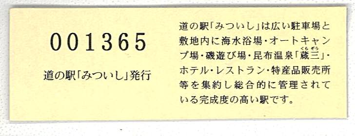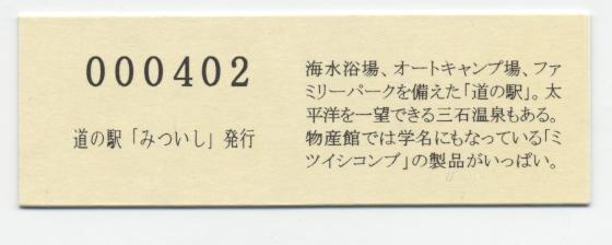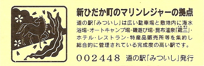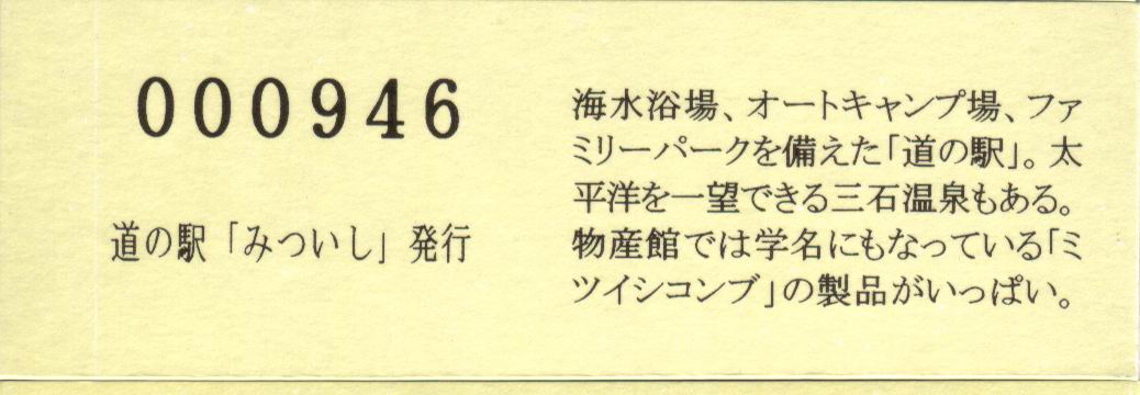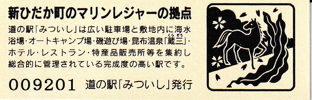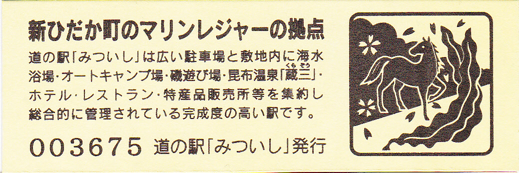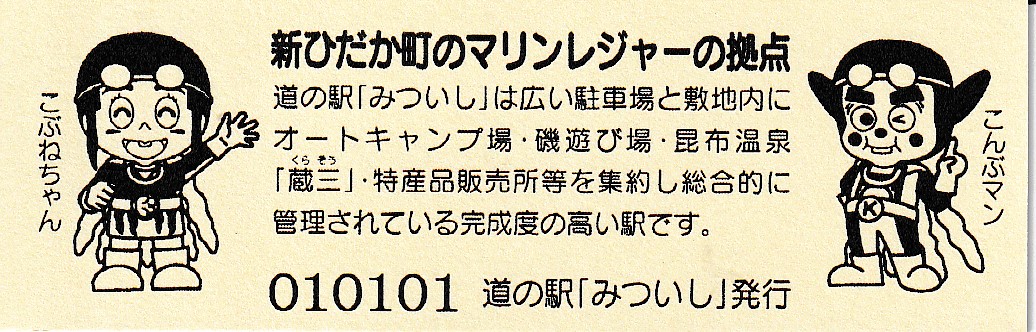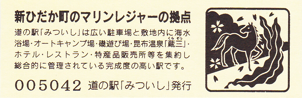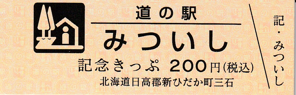 000001-000300:記念入場券(通常券) 000301-000900:記念きっぷ(入) 000901-001353:記念きっぷ(記・三石町) 001354-002400:記念きっぷ(記・新ひだか町) 002401-003600:デザインきっぷ(イラスト左) 003601-005000:デザインきっぷ(イラスト右) 005001-009200:180円きっぷ 009201-010100:200円きっぷ(イラスト右) 010101- :200円きっぷ(こぶねちゃん、こんぶマン)