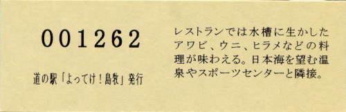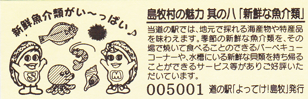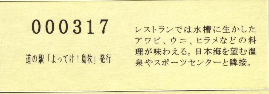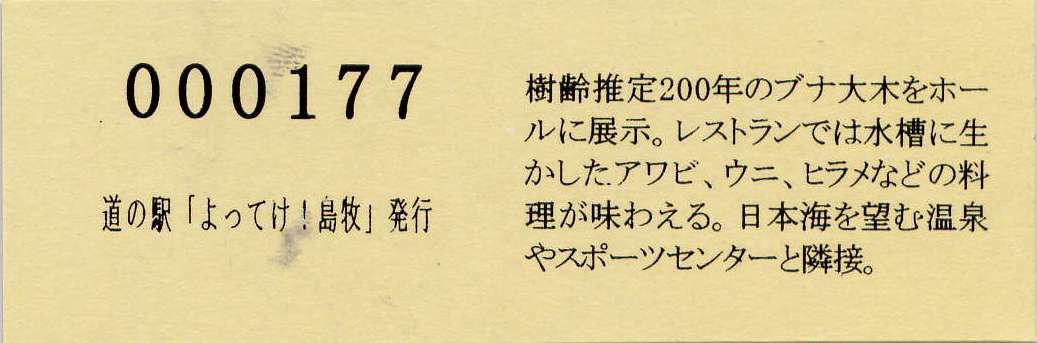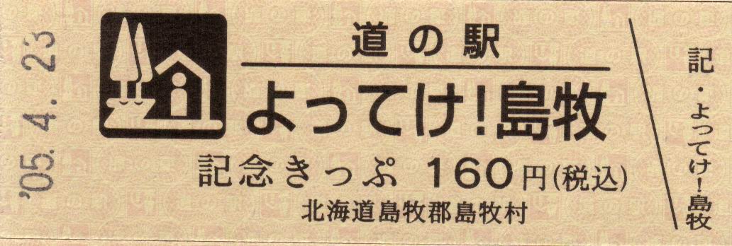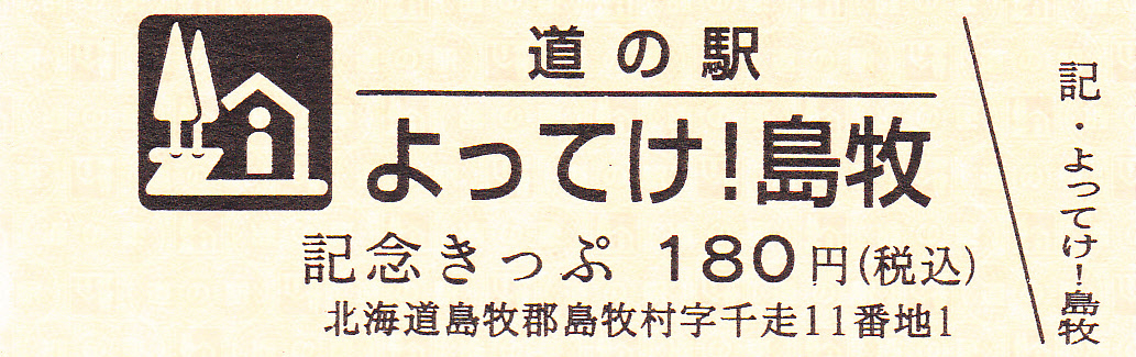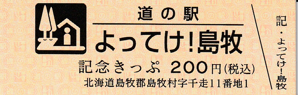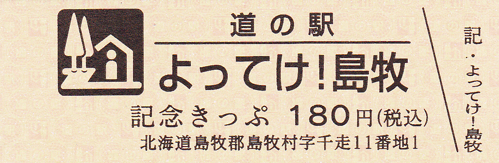 0001-0300:記念きっぷ(入) 0301-0600:記念きっぷ(記)<裏面文章のみ・住所左> 0601-1200:記念きっぷ(記)<裏面文章のみ・住所中央> 1201-1500:記念きっぷ(記)<裏面文章のみ・字番地入り> 1501-1800:デザインきっぷ(シマくんマキちゃん) 1801-2100:デザインきっぷ(賀老の滝) 2101-2600:デザインきっぷ(狩場山) 2601-2800:デザインきっぷ(温泉マキちゃん) 2801-3000:デザインきっぷ(温泉シマくん) 2801-3100:デザインきっぷ(温泉シマくんマキちゃん) 3101-3400:デザインきっぷ(あめますダービー) 3401-3600:デザインきっぷ(歌島高原・シマくん) 3601-3800:デザインきっぷ(歌島高原・マキちゃん) 3801-4100:デザインきっぷ(歌島高原・シマくんマキちゃん・左) 4101-4400:デザインきっぷ(歌島高原・シマくんマキちゃん・右) 4401-4700:デザインきっぷ(海の幸山の幸) 4701-5000:180円きっぷ(春の風物詩コウナゴ漁) 5001-5300:180円きっぷ(新鮮な魚介類) 5301-5600:180円きっぷ(コウナゴ漁) 5601-5900:180円きっぷ(島牧賀老米) 5901-6200:180円きっぷ(茂津多岬灯台) 6201-6500:180円きっぷ(狩場山CATスキー) 6501-6800:180円きっぷ(島牧村のなまこ漁) 6801-8000:180円きっぷ(ヒグマ) 8001- :200円きっぷ(ヒグマ)