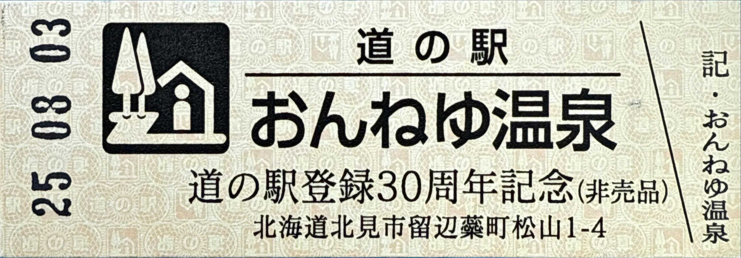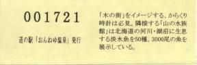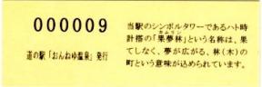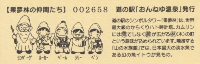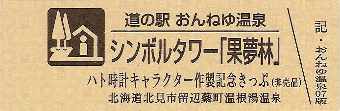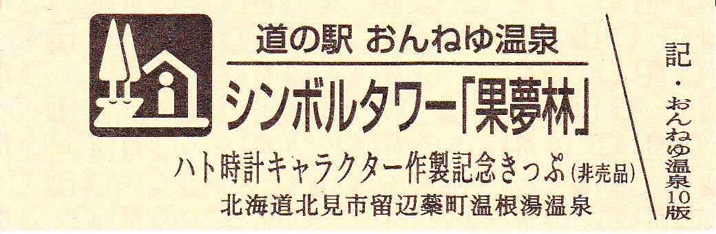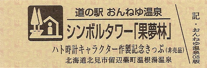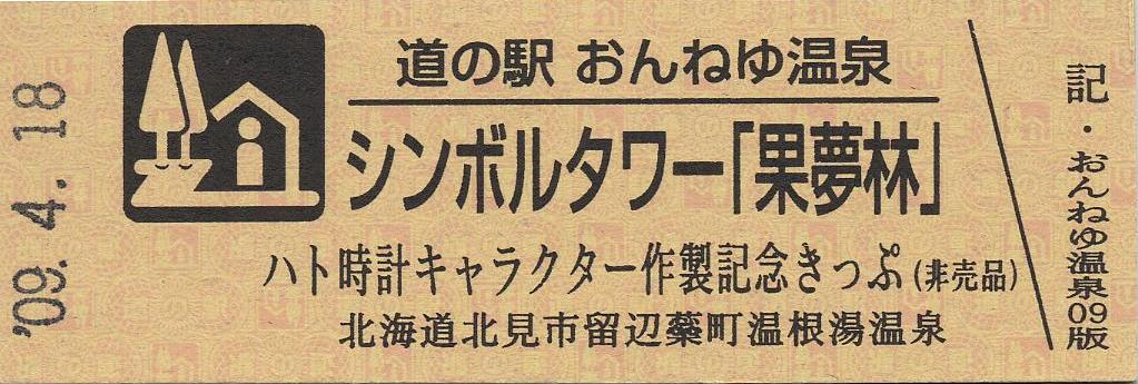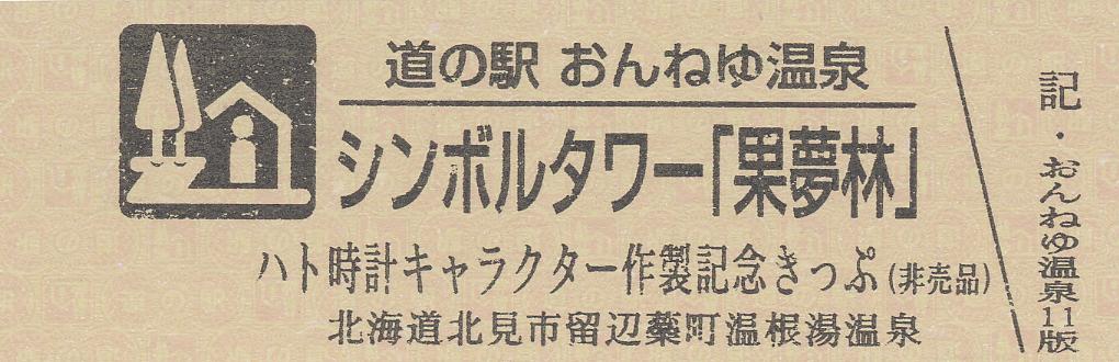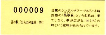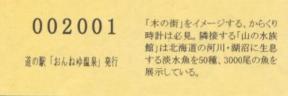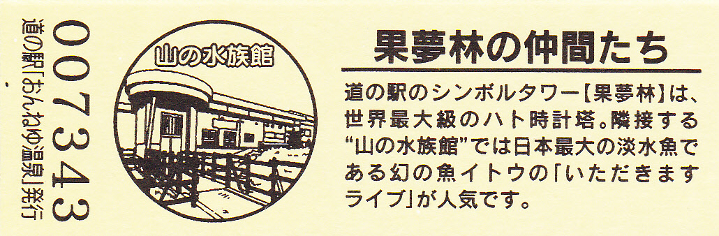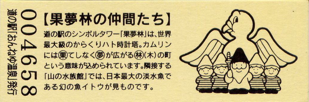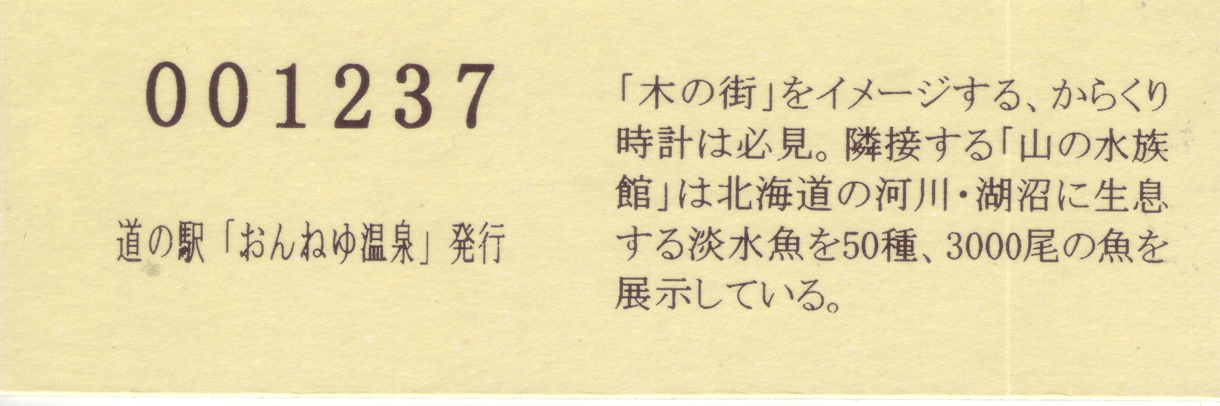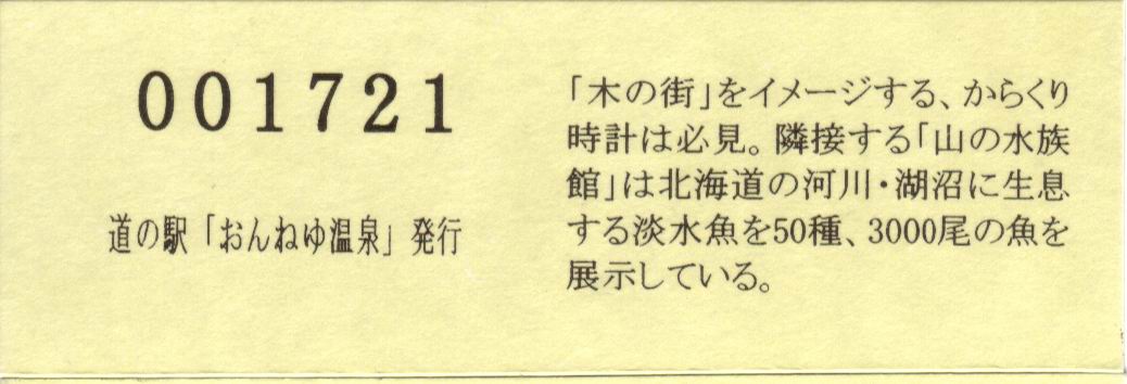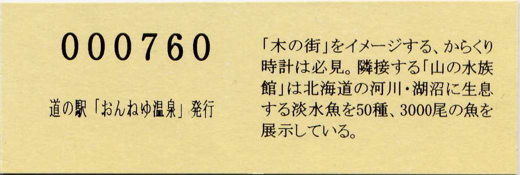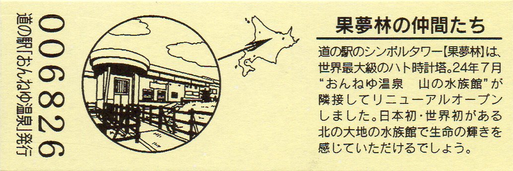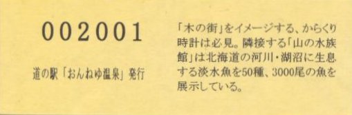 000001-000300:ハト時計塔「果夢林」入館記念きっぷ(配布終了) 000301-000600:1市3町合併記念きっぷ (配布終了) 000601-000900:ハト時計塔キャラクター作製記念きっぷ<ランパーグ>(配布終了) 000901-001200:ハト時計塔キャラクター作製記念きっぷ<ルーカー>(配布終了) 001201-001500:ハト時計塔キャラクター作製記念きっぷ<ベーム>(配布終了) 001501-001800:ハト時計塔キャラクター作製記念きっぷ<シリー>(配布終了) 001801-002100:ハト時計塔キャラクター作製記念きっぷ<ベン>(配布終了) 002101-002400:ハト時計塔キャラクター作製記念きっぷ<長者と4人の賢者>(配布終了) 002401-002700:山の水族館リニューアルオープン記念(配布終了) 002701-003000:山の水族館入館者20万人突破記念(配布終了) 003001-003300:北の大地の水族館(山の水族館)のお魚紹介切符(配布終了) 003301- :道の駅登録30周年記念(配布終了)