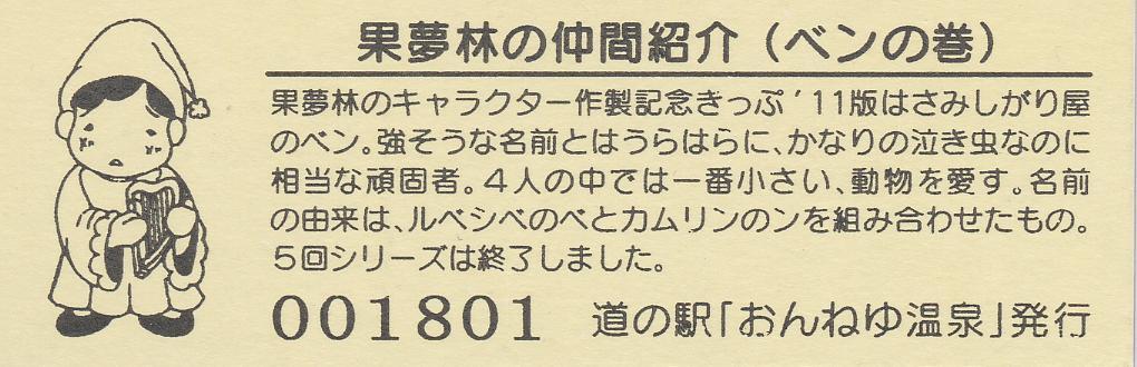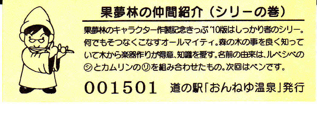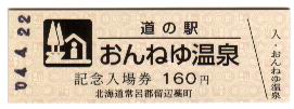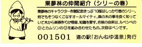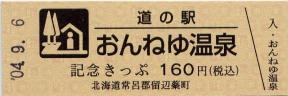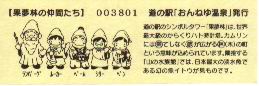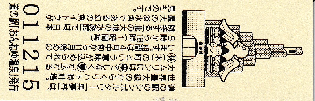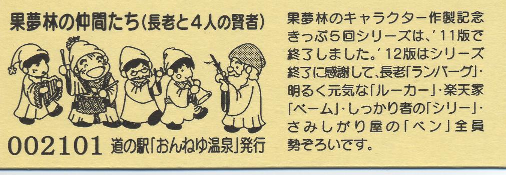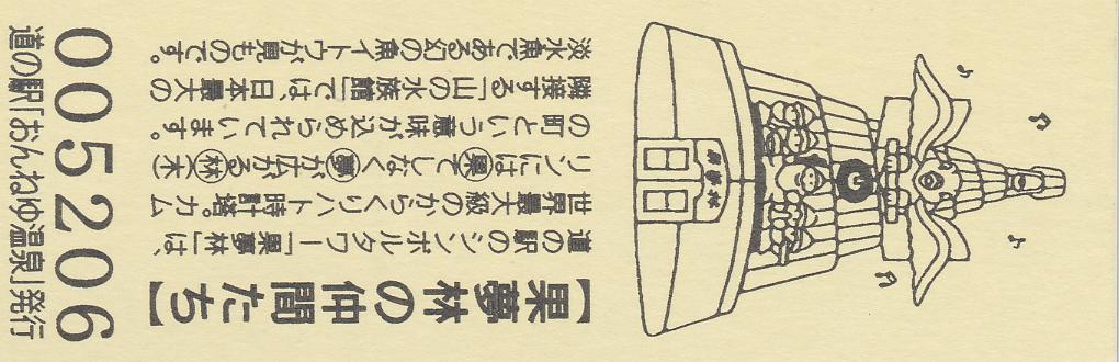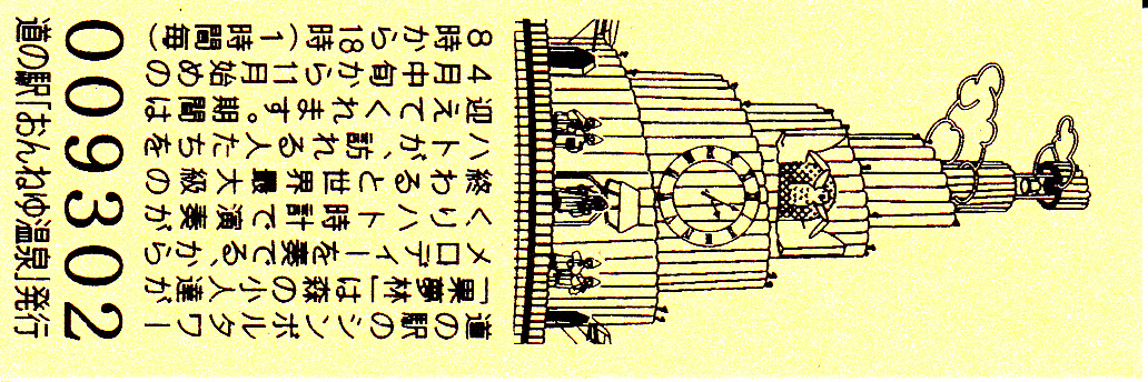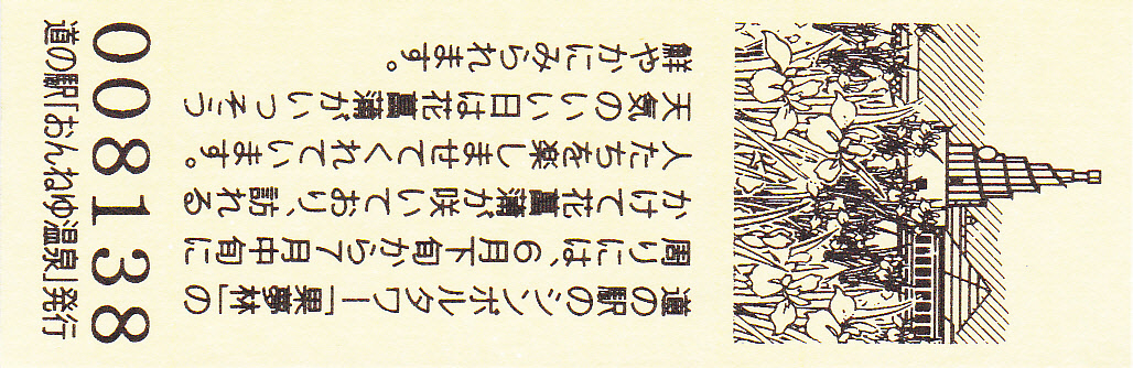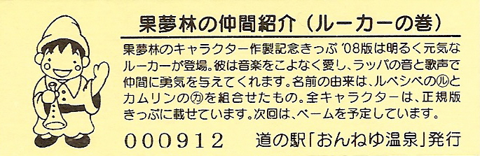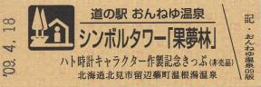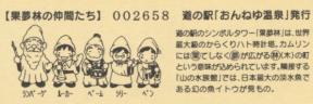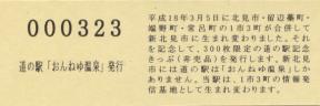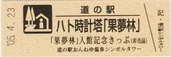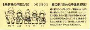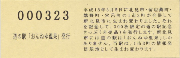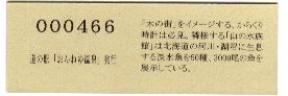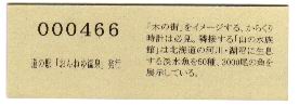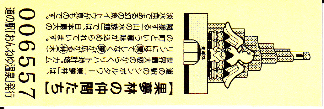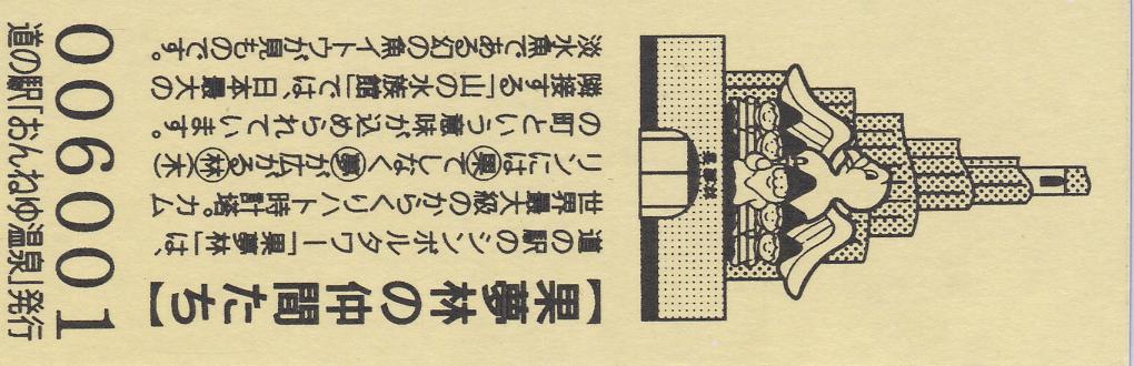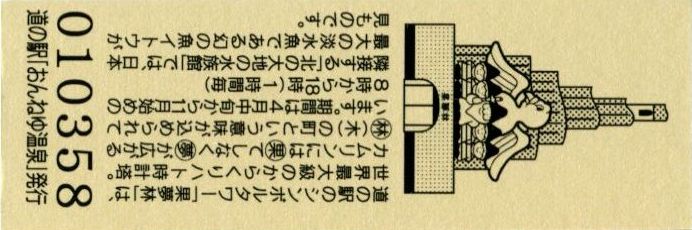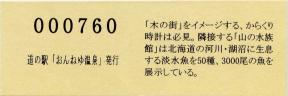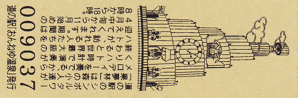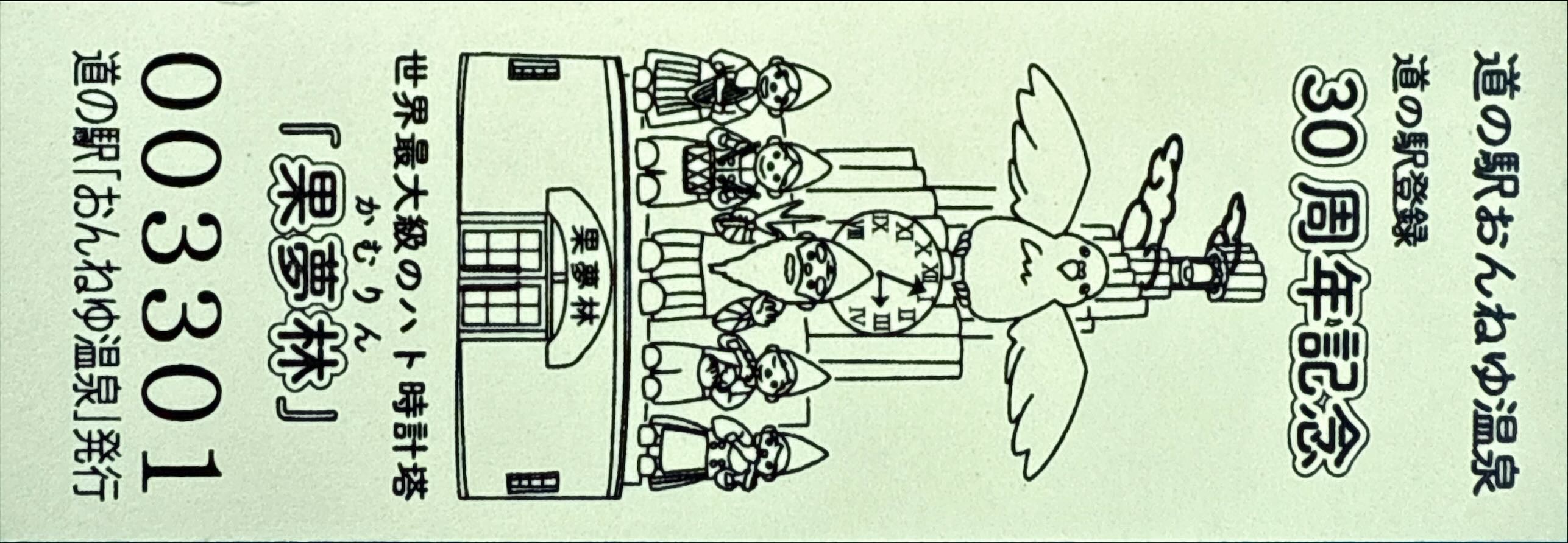 000001-000300:ハト時計塔「果夢林」入館記念きっぷ(配布終了) 000301-000600:1市3町合併記念きっぷ (配布終了) 000601-000900:ハト時計塔キャラクター作製記念きっぷ<ランパーグ>(配布終了) 000901-001200:ハト時計塔キャラクター作製記念きっぷ<ルーカー>(配布終了) 001201-001500:ハト時計塔キャラクター作製記念きっぷ<ベーム>(配布終了) 001501-001800:ハト時計塔キャラクター作製記念きっぷ<シリー>(配布終了) 001801-002100:ハト時計塔キャラクター作製記念きっぷ<ベン>(配布終了) 002101-002400:ハト時計塔キャラクター作製記念きっぷ<長者と4人の賢者>(配布終了) 002401-002700:山の水族館リニューアルオープン記念(配布終了) 002701-003000:山の水族館入館者20万人突破記念(配布終了) 003001-003300:北の大地の水族館(山の水族館)のお魚紹介切符(配布終了) 003301- :道の駅登録30周年記念(配布終了)