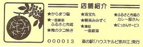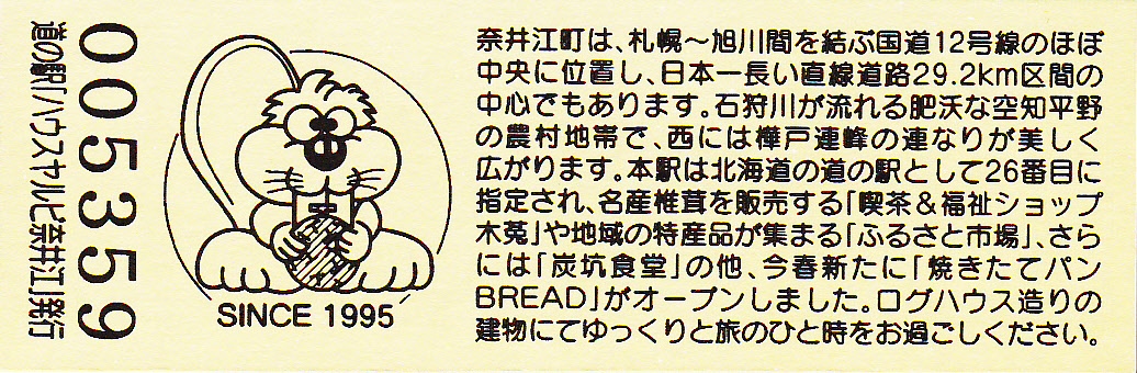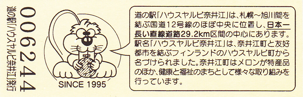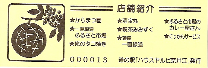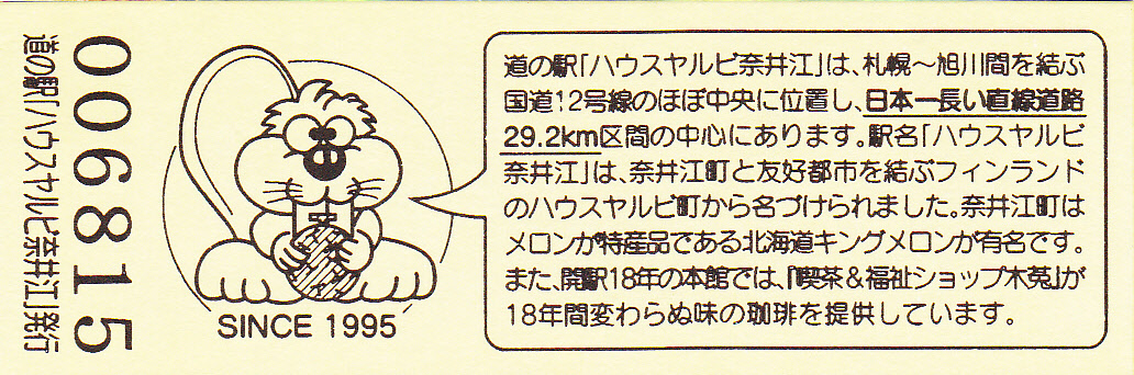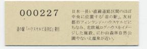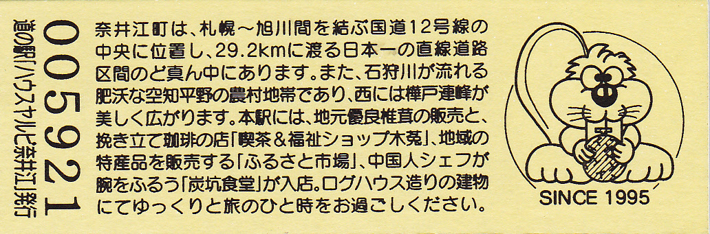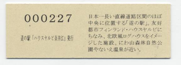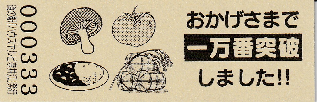 000001-000500:記念入場券(ピンク券) 000501-000800:記念入場券(通常券) 000801-001100:記念きっぷ(入) 001101-001700:記念きっぷ(記)<住所左> 001701-002600:記念きっぷ(記)<住所中央> 002601-003200:デザインきっぷ(ヤルビーくん・メロンなし・URLあり) 003201-003500:デザインきっぷ(ヤルビーくん・メロンなし・URLなし・SINCE1995なし) 003501-004100:デザインきっぷ(ヤルビーくん・メロンなし・URLなし・SINCE1995あり) 004101-004400:デザインきっぷ(道の駅スタンプ・からまつ園、喫茶木菟) 004401-004700:デザインきっぷ(道の駅スタンプ・からまつ園、木菟、ふるさと市場) 004701-005300:デザインきっぷ(道の駅スタンプ・「ハウスヤルビ」とは…) 005301-005900:デザインきっぷ(ヤルビーくん・メロンあり・左) 005901-006200:デザインきっぷ(ヤルビーくん・メロンあり・右) 006201-006800:180円きっぷ(健康と福祉のまち) 006801-010100:180円きっぷ(変わらぬ味の珈琲) 010101-010700:180円きっぷ(しいたけカレー) 010701- :200円きっぷ(しいたけカレー)