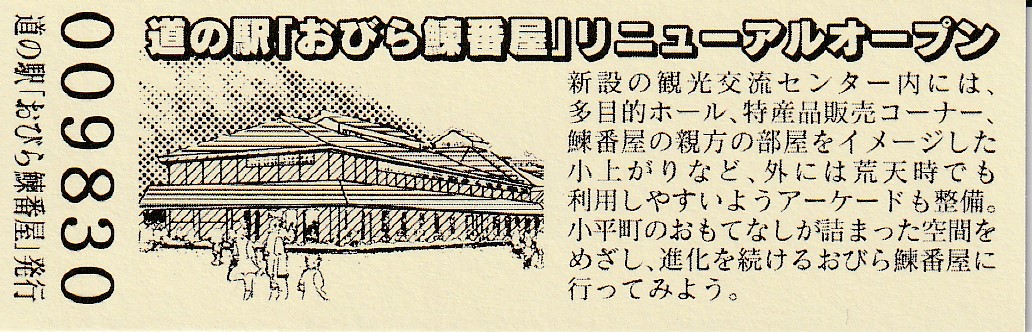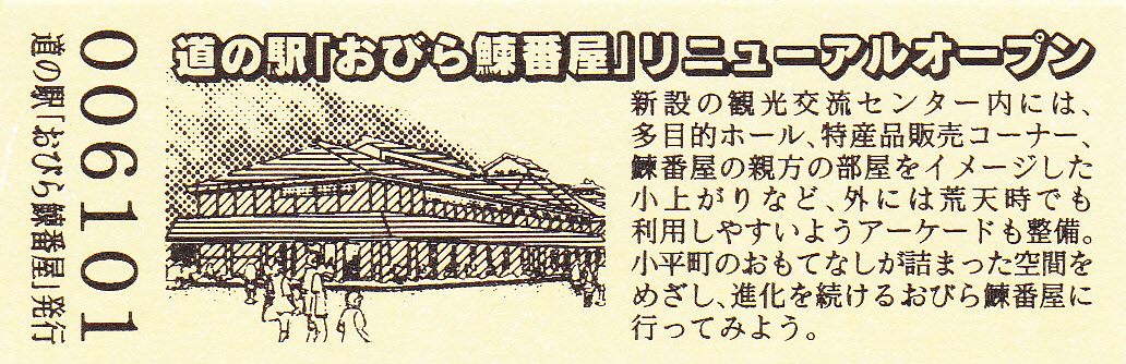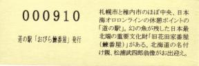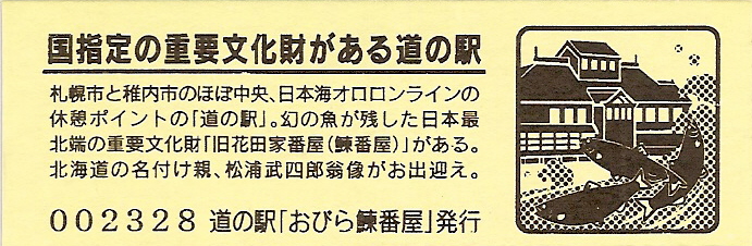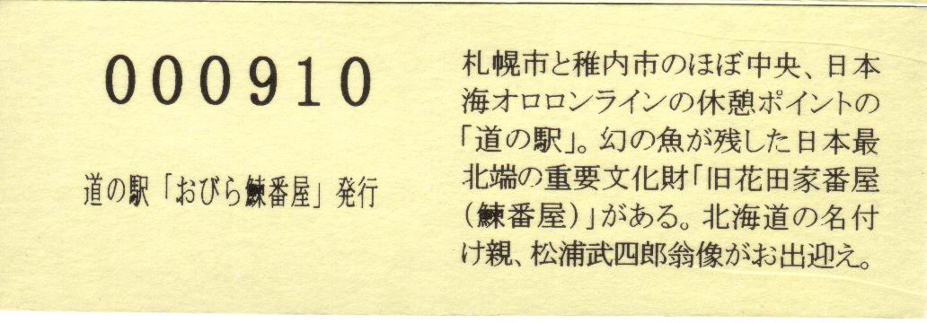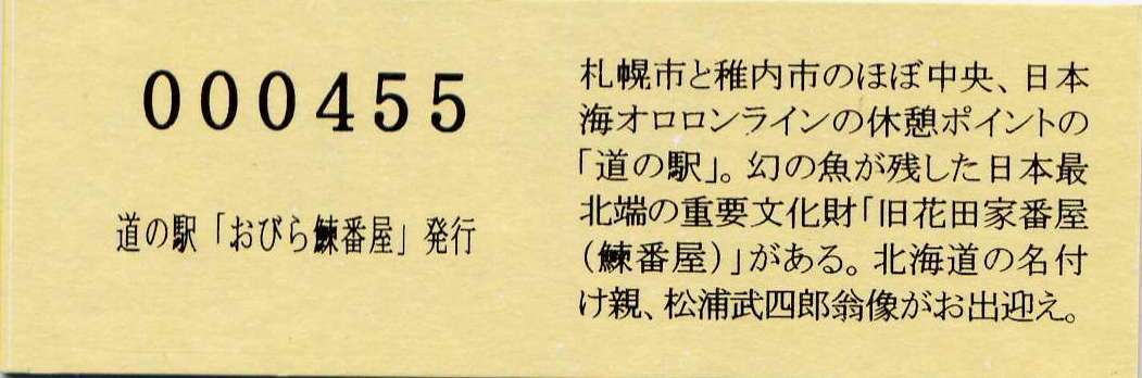 000001-000300:記念入場券 000301-000700:記念きっぷ(入) 000701-002000:記念きっぷ(記) 002001-002300:デザインきっぷ(カントリーサイン・左) 002301-003000:デザインきっぷ(カントリーサイン・右) 003001-003500:デザインきっぷ(鰊番屋・左・文章右・横書き) 003501-003700:デザインきっぷ(鰊番屋・中央) 003701-004000:デザインきっぷ(鰊番屋・左・文章右・縦書き) 004001-004300:デザインきっぷ(鰊番屋・縦) 004301-004800:デザインきっぷ(鰊番屋・左・文章中央) 004801-005400:180円きっぷ(旧花田家番屋・左・文章横書き) 005401-005700:180円きっぷ(旧花田家番屋・右) 005701-006100:180円きっぷ(旧花田家番屋・左・文章縦書き) 006101-009800:180円きっぷ(リニューアルオープン) 009801- :200円きっぷ(リニューアルオープン)