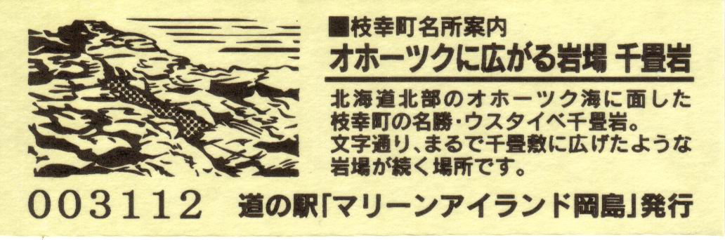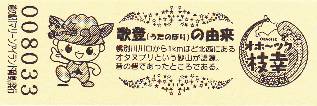 000001-000300:記念入場券 000301-000600:記念きっぷ(入) 000601-001600:記念きっぷ(記) 001601-002200:デザインきっぷ(カントリーサイン) 002201-002800:デザインきっぷ(目近鮭) 002801-003100:デザインきっぷ(カニ) 003101-003300:デザインきっぷ(千畳岩) 003301-003700:デザインきっぷ(三笠山展望台) 003701-003900:デザインきっぷ(オホーツクミュージアムえさし) 003901-004200:デザインきっぷ(うたのぼり健康回復村) 004201-004400:デザインきっぷ(よくばりフェスタ) 004401-004800:デザインきっぷ(枝幸町の由来) 004801-005200:デザインきっぷ(さるとカニ) 005201-005600:180円きっぷ(えさっしー) 005601-005900:180円きっぷ(枝幸天然ほたて) 005901-006200:180円きっぷ(枝幸町ソレフテオ市交流25周年) 006201-006500:180円きっぷ(はまなすのティータイム) 006501-006800:180円きっぷ(枝幸町町名の由来) 006801-007100:180円きっぷ(枝幸町の山と森) 007101-007400:180円きっぷ(オホーツクミュージアムえさし) 007401-007700:180円きっぷ(枝幸の語源) 007701-008000:180円きっぷ(道の駅全景) 008001-008300:180円きっぷ(歌登の由来) 008301-008600:180円きっぷ(幌別川ポロペツ) 008601-008900:180円きっぷ(「ウスタイベ」の語源) 008901-009200:180円きっぷ(「徳志別」の語源) 009201-009600:180円きっぷ(問牧) 009601-010200:200円きっぷ(目梨泊) 010201-010500:200円きっぷ(枝幸ほたて) 010501-010800:200円きっぷ(秋鮭) 010801-011100:200円きっぷ(かにめしの素) 011101- :200円きっぷ(帆立のり)
