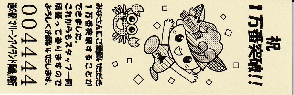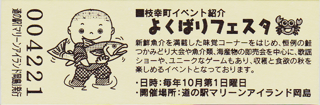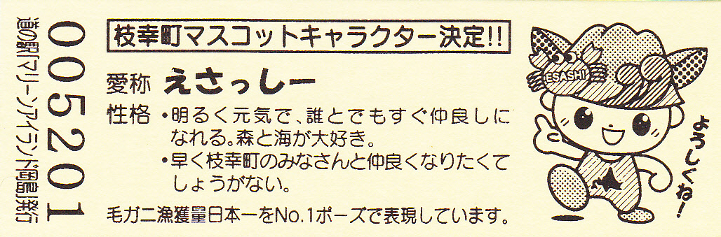 000001-000300:合併記念きっぷ(配布終了) 000301-000600:第40回かにまつり記念きっぷ(配布終了) 000601-000900:枝幸町開基130周年記念切符(配布終了) 000901-001200:オホーツク干貝柱塩ラーメン記念切符(配布終了) 001201-001500:夢想漣えさし」YOSAKOIソーラン大賞受賞記念(配布終了) 001501-001800:「夢想漣えさし」YOSAKOIソーラン大賞2連覇記念(配布終了) 001801-002000:15周年特別記念きっぷ(配布終了) 002001-002300:第45回かにまつり記念きっぷ(配布終了) 002301-002600:17周年特別記念きっぷ(配布終了) 002601-002900:三笠山展望閣OPEN30周年記念(配布終了) 002901-003200:開駅20周年特別記念きっぷ(配布終了) 003201-003500:枝幸かにまつり50周年記念きっぷ(配布終了) 003501-003800:オホーツクミュージアムえさしリニューアルOPEN3周年記念(配布終了) 003801-004100:マラソンin札幌記念きっぷ(配布終了) 004101-004400:第56回枝幸かにまつり記念切符(配布終了) 004401-004700:一万番突破特別記念きっぷ(配布終了) 004701-005000:第1回オホーツク枝幸うまいもん祭り記念切符(配布終了)