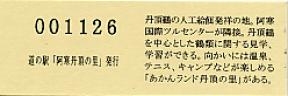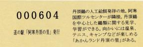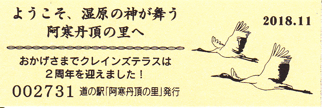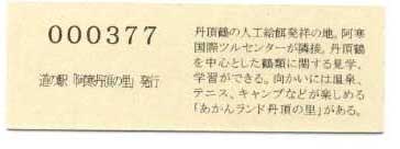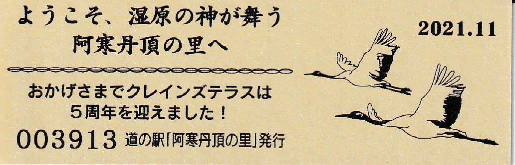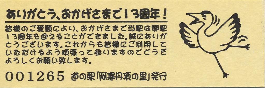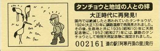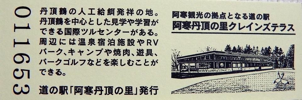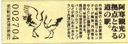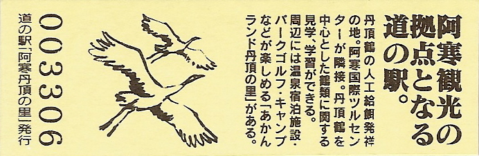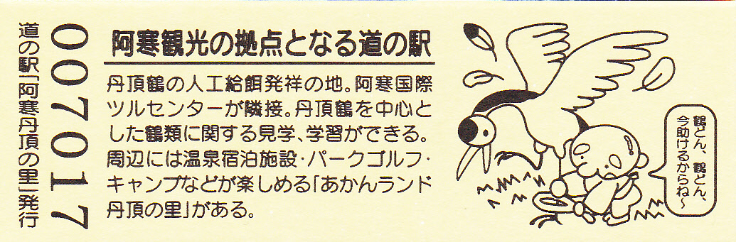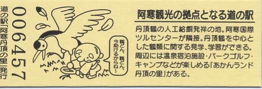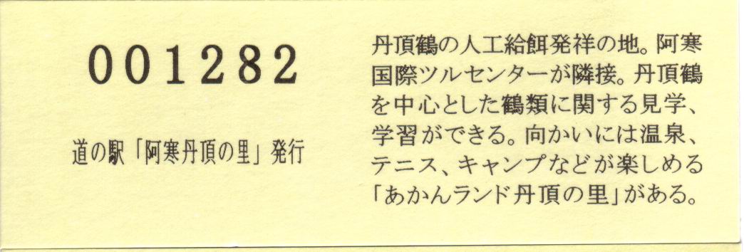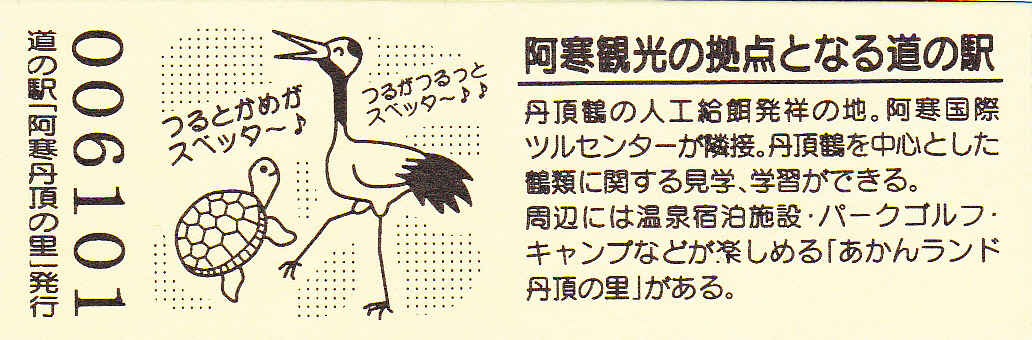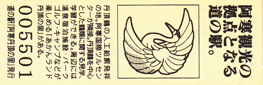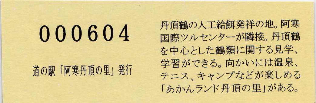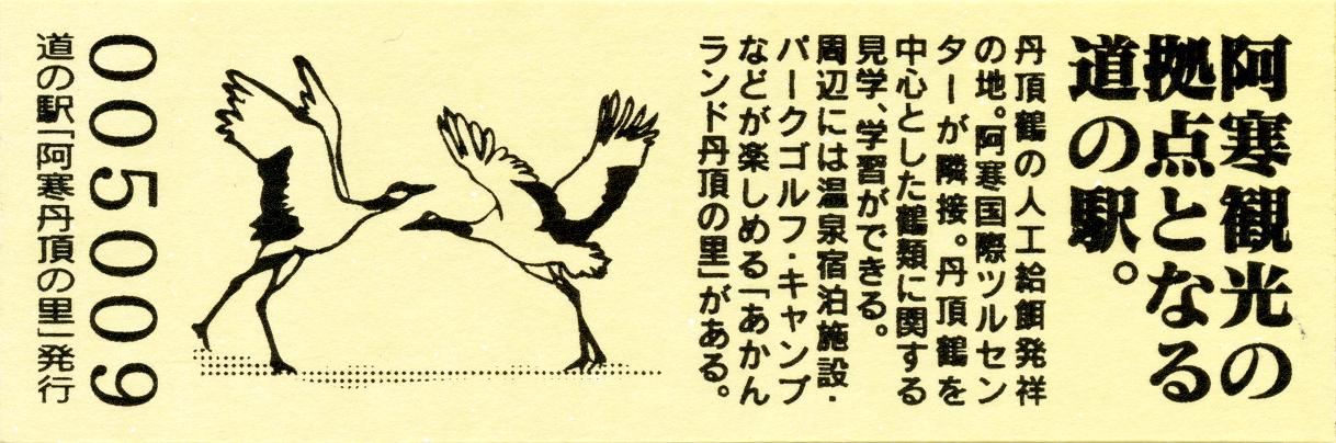 000001-000500:記念入場券(ピンク券) 000501-001100:記念きっぷ(入) 001101-001252:記念きっぷ(記・阿寒町) 001253-002100:記念きっぷ(記・釧路市)<裏面文章のみ> 002101-002400:デザインきっぷ(スタンプ・券番文字大) 002401-002700:デザインきっぷ(スタンプ・券番文字小) 002701-003300:デザインきっぷ(求愛ダンス) 003301-003900:デザインきっぷ(右向きに飛ぶ丹頂) 003901-004200:デザインきっぷ(飛び立つ丹頂) 004201-005000:デザインきっぷ(左向きに飛ぶ丹頂) 005001-005500:デザインきっぷ(求愛ダンス2・文章右) 005501-005800:デザインきっぷ(丹頂鶴・縦) 005801-006100:デザインきっぷ(求愛ダンス2・文章中央) 006101-006400:デザインきっぷ(つるとかめ) 006401-007000:180円きっぷ(つるとおじいさん・左) 007001-011600:180円きっぷ(つるとおじいさん・右) 011601- :200円きっぷ(阿寒丹頂の里クレインズテラス)