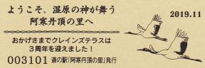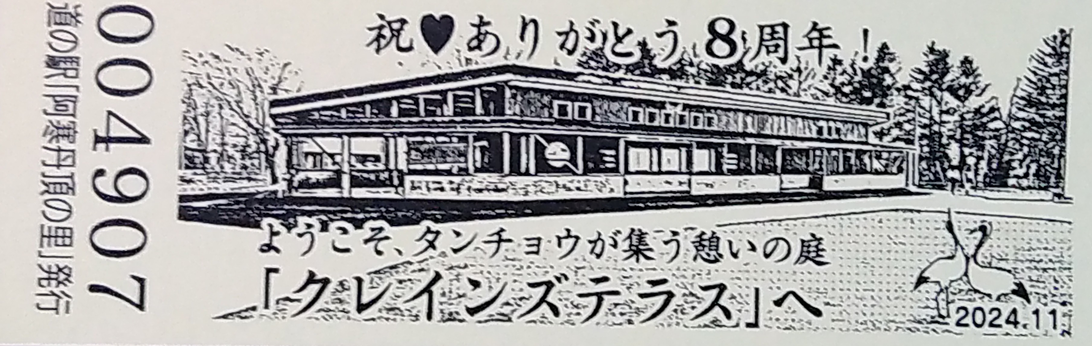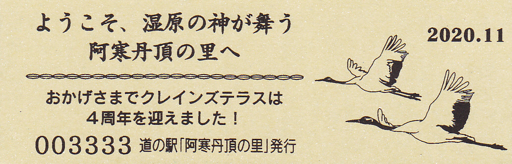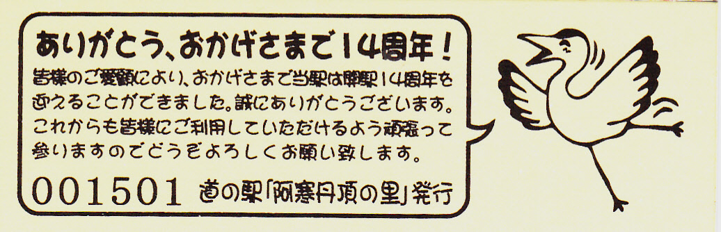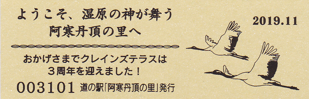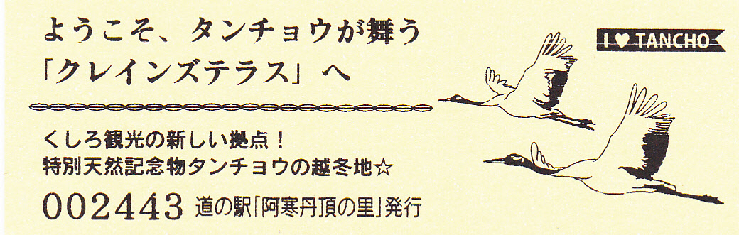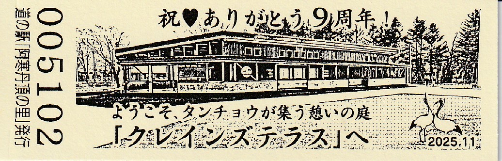 000001-000300:釧路市阿寒町音別町合併記念きっぷ(配布終了) 000301-000600:合併1周年記念きっぷ(配布終了) 000601-000900:11周年記念きっぷ(配布終了) 000901-001200:12周年記念きっぷ(配布終了) 001201-001500:13周年記念きっぷ(配布終了) 001501-001800:14周年記念きっぷ(配布終了) 001801-002100:15周年記念きっぷ(配布終了) 002101-002400:タンチョウ特別天然記念物指定60周年記念きっぷ(配布終了) 002401-002700:クレインズテラス1周年記念(配布終了) 002701-003000:クレインズテラス2周年記念(配布終了) 003001-003300:クレインズテラス3周年記念(配布終了) 003301-003600:クレインズテラス4周年記念(配布終了) 003601-003900:一万番突破特別記念きっぷ(配布終了) 003901-004200:クレインズテラス5周年記念(配布終了) 004201-004500:クレインズテラス6周年記念(配布終了) 004501-004800:クレインズテラス7周年記念(配布終了) 004801-005100:クレインズテラス8周年記念(配布終了) 005101-005400:クレインズテラス9周年記念(配布終了)