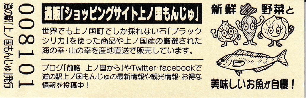 0001-0137?:記念入場券(通常券) 0138?-0400:記念きっぷ(入) 0401-0900:記念きっぷ(記)<住所左> 0901-1500:記念きっぷ(記)<住所中央> 1501-2200:デザインきっぷ(カントリーサイン) 2201-2500:デザインきっぷ(てっくい天丼) 2501-2800:デザインきっぷ(海のレストランもんじゅ・左) 2801-3000:デザインきっぷ(海のレストランもんじゅ・右) 3001-3200:デザインきっぷ(道の駅スタンプ・左) 3201-3600:デザインきっぷ(道の駅スタンプ・右) 3601-3900:デザインきっぷ(いちごジュース・右) 3901-4200:デザインきっぷ(いちごジュース・左) 4201-8100:180円きっぷ 8101- :200円きっぷ