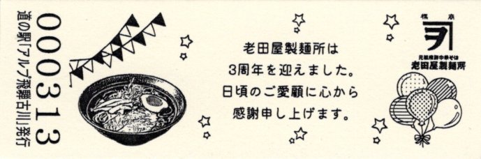 000001~000300 (特)老田屋製麺所・寄合所耕飛騨古川ショップオープン記念きっぷ