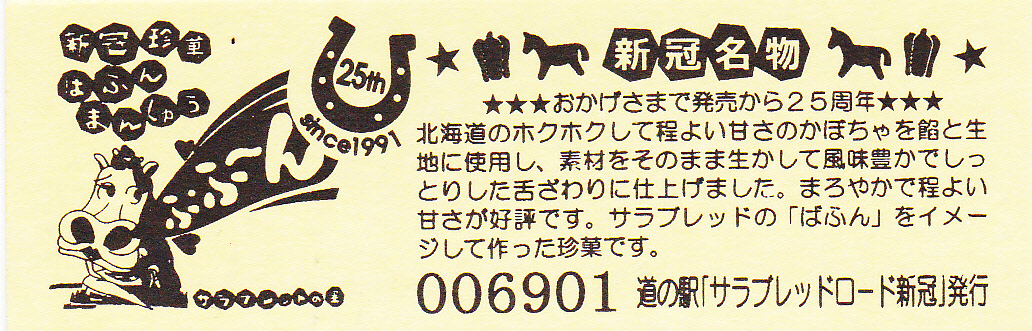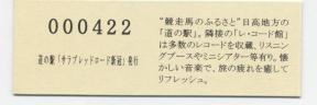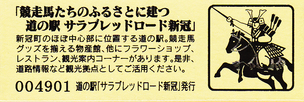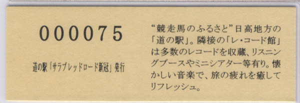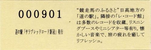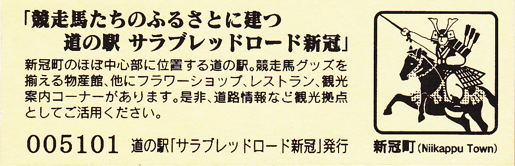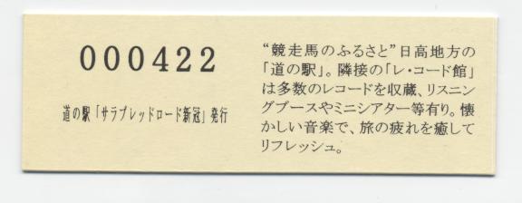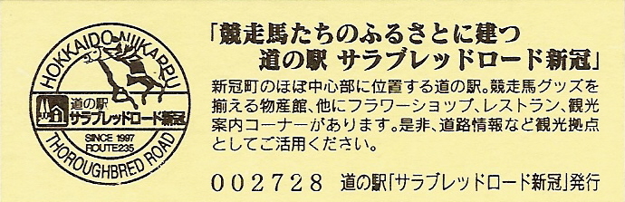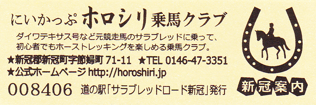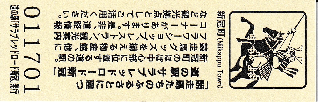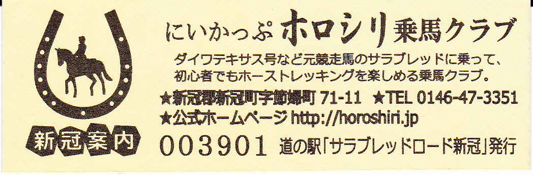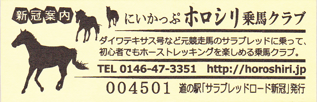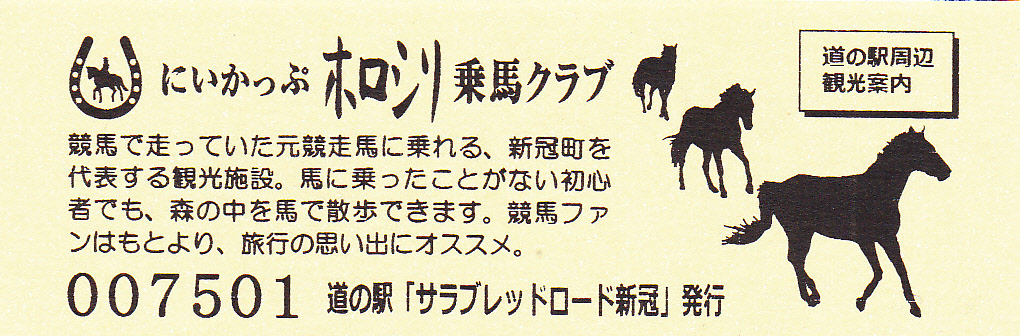 000001-000300:記念入場券(通常券) 000301-000900:記念きっぷ(入) 000901-001200:記念きっぷ(記)<住所左> 001201-001800:記念きっぷ(記)<最終行短・住所中央> 001801-002100:記念きっぷ(記)<最終行長・住所中央> 002101-002400:デザインきっぷ(カントリーサイン・町名なし・左) 002401-002700:デザインきっぷ(カントリーサイン・町名あり・左) 002701-003000:デザインきっぷ(スタンプ) 003001-003300:デザインきっぷ(馬・左) 003301-003600:デザインきっぷ(馬・右) 003601-003900:デザインきっぷ(ばふんまんじゅう・左) 003901-004200:デザインきっぷ(ホロシリ乗馬クラブ・蹄鉄) 004201-004500:デザインきっぷ(ホテルヒルズ) 004501-004800:デザインきっぷ(ホロシリ乗馬クラブ・馬3頭) 004801-005100:デザインきっぷ(カントリーサイン・町名なし・右) 005101-005400:デザインきっぷ(カントリーサイン・町名あり・右) 005401-005700:デザインきっぷ(手作り工房ミルト) 005701-006000:デザインきっぷ(ばふんまんじゅう・右) 006001-006300:180円きっぷ(レコード館) 006301-006600:180円きっぷ(ピーマンようかん・ピーマンチップス・縦) 006601-006900:180円きっぷ(ピーマンソフトクリーム・縦) 006901-007200:180円きっぷ(ばふんまんじゅう) 007201-007500:180円きっぷ(ピーマンアイス・縦) 007501-007800:180円きっぷ(馬3頭) 007801-008100:180円きっぷ(祝・20周年記念) 008101-008400:180円きっぷ(太陽の森ディマシオ美術館) 008401-008700:180円きっぷ(蹄鉄) 008701-009000:180円きっぷ(HOROSHIRIイラスト・馬後ろ姿) 009001-009300:180円きっぷ(スタンプ) 009301-009600:180円きっぷ(カントリーサイン・競走馬たちのふるさとに建つ) 009601-009900:180円きっぷ(ピーマンソフトクリーム・横) 009901-010200:180円きっぷ(HOROSHIRIイラスト・馬横顔) 010201-010500:180円きっぷ(ピーマンようかん・ピーマンチップス・横) 010501-010800:180円きっぷ(ピーマンアイス・横) 010801-011100:200円きっぷ(サラブレッドと森の中へ) 011101-011400:200円きっぷ(TSUNOO) 011401-011700:200円きっぷ(ピーマンみそ) 011701-012000:200円きっぷ(カントリーサイン) 012001-012300:200円きっぷ(ホロシリ牛乳) 012301- :200円きっぷ(サラブレッドと森の中へ♪)