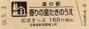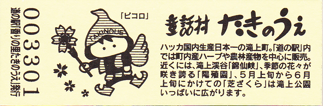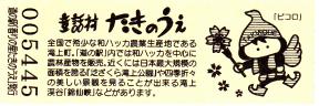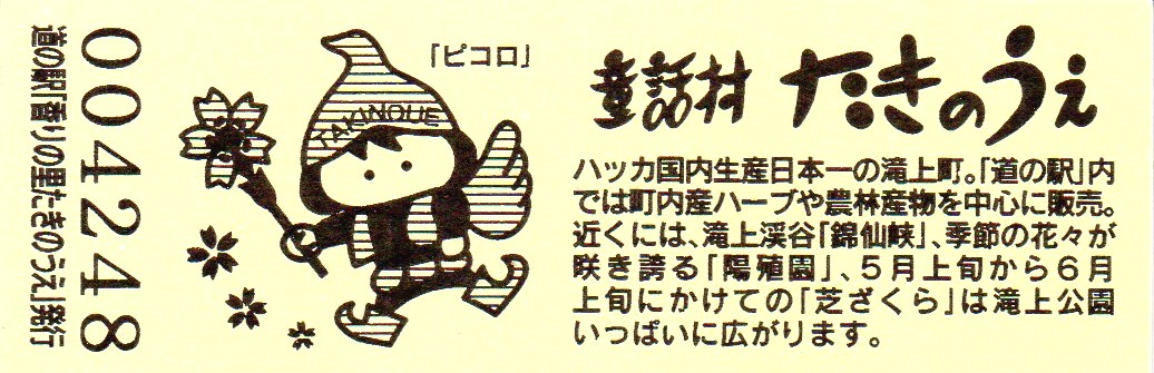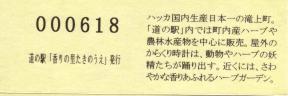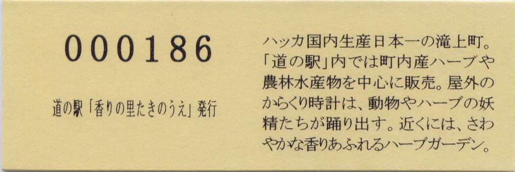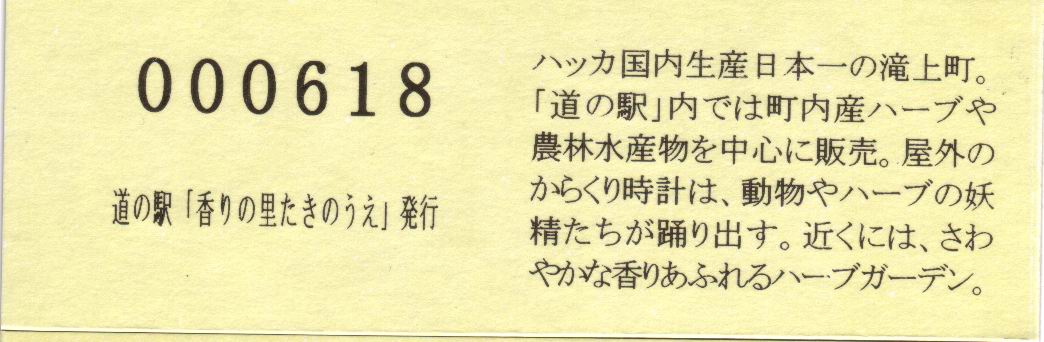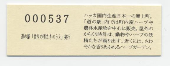 000001-000300:記念入場券(通常券) 000301-000600:記念きっぷ(入) 000601-000900:記念きっぷ(記)<住所左> 000901-001800:記念きっぷ(記)<住所中央> 001801-003300:デザインきっぷ(イラスト右) 003301-004200:デザインきっぷ(イラスト左) 004201-005400:180円きっぷ(ハッカの国内生産日本一左) 005401-007500:180円きっぷ(全国で希少な和ハッカ) 007501- :200円きっぷ