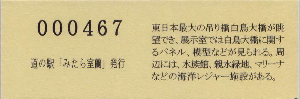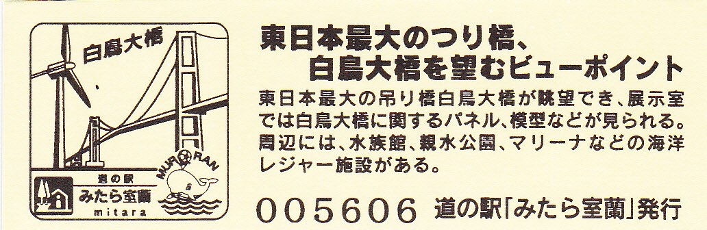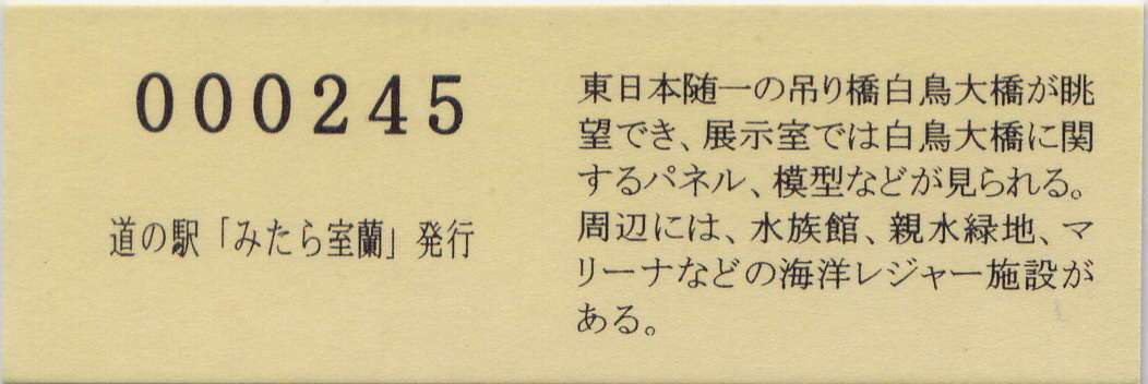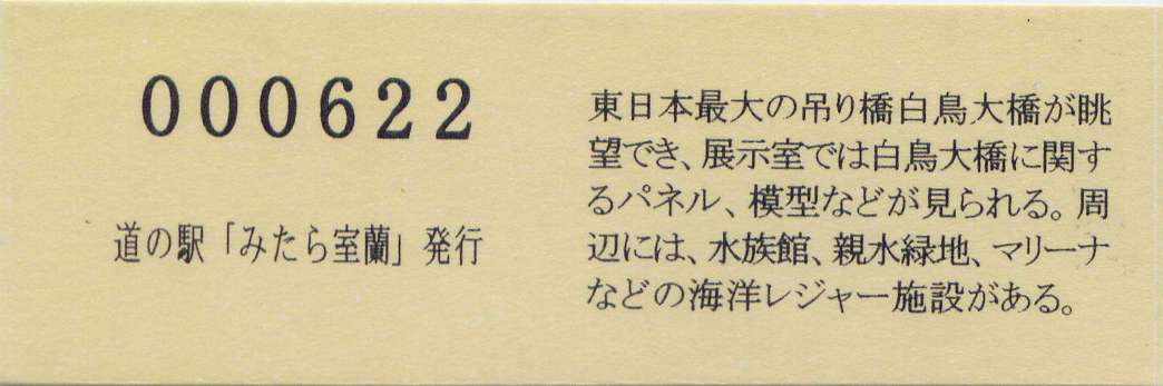 000001-000300:記念入場券(通常券) 000301-000600:記念きっぷ(入) 000601-000900:記念きっぷ(記)<住所左> 000901-001800:記念きっぷ(記)<住所中央> 001801-002700:記念きっぷ(記)<住所中央・最終行長> 002701-003300:デザインきっぷ(カントリーサイン) 003301-003600:デザインきっぷ(白鳥大橋・親水緑地) 003601-005400:デザインきっぷ(白鳥大橋・親水公園) 005401-010600:180円きっぷ 010601- :200円きっぷ