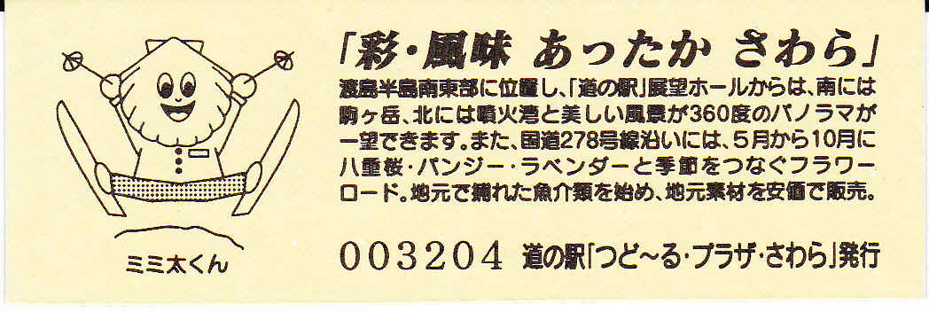 000001-000593:記念きっぷ(入) 000594-000900:記念きっぷ(記)<裏面文章のみ・住所左> 000901-001500:記念きっぷ(記)<裏面文章のみ・住所中央> 001501-001800:デザインきっぷ(ミミちゃん・歩き・左) 001801-002400:デザインきっぷ(ミミちゃん・歩き・右) 002401-002700:デザインきっぷ(ミミ太くんとミミちゃん) 002701-002900:デザインきっぷ(ミミちゃんスケート) 002901-003400:デザインきっぷ(ラベンダー・右) 003401-003600:デザインきっぷ(ミミちゃん・桜・右) 003601-003900:デザインきっぷ(ラベンダー・左) 003901-004100:デザインきっぷ(ミミちゃん・イチョウ) 004101-004500:デザインきっぷ(ミミ太くんと海の仲間たち) 004501-004700:デザインきっぷ(ゆきだるま) 004701-005000:デザインきっぷ(ミミちゃん・桜・左) 005001-005300:180円きっぷ(ミミちゃん・月見) 005301-005600:180円きっぷ(ミミ太くん・ひまわり) 005601-005900:180円きっぷ(桜) 005901-006200:180円きっぷ(ミミ太くん・雪だるま) 006201-006500:180円きっぷ(ミミちゃん・くだもの) 006501-006800:180円きっぷ(ミミ太くん・居眠り) 006801-007100:180円きっぷ(ミミ太くん・そり) 007101-007400:180円きっぷ(ミミ太くんミミちゃん・こたつ) 007401-007700:180円きっぷ(ミミ太くん・スケート) 007701-008000:180円きっぷ(ミミ太くん・さわら 008001-008300:180円きっぷ(ミミ太くん・魚介類) 008301-008600:180円きっぷ(ミミ太くん左・道プレラリーは62だよ) 008601-008900:180円きっぷ(ミミ太くん右・道プレラリーは62だよ) 008901-009200:180円きっぷ(アマビエ) 009201-009500:180円きっぷ(みんなで予防) 009501-009800:180円きっぷ(八重桜、ラベンダー) 009801-010100:180円きっぷ(ミミ太ミミちゃん・雪だるま) 010101-010400:180円きっぷ(地元の新鮮野菜・野菜) 010401-010700:180円きっぷ(地元の新鮮野菜・祭り神輿) 010701-011000:200円きっぷ(地元の新鮮野菜や魚貝・プルーン) 011001-011300:200円きっぷ(地元の新鮮野菜や魚貝・ミミちゃんミミ太) 011301-011600:200円きっぷ(地元の新鮮野菜や魚貝・ちよこおばちゃん・ミミちゃんミミ太) 011601-011900:200円きっぷ(地元の新鮮野菜や魚貝・シマエナガ・ミミちゃんミミ太・桜) 011901- :200円きっぷ(地元の新鮮野菜や魚貝・エゾモモンガ・ミミちゃんミミ太・すいか)