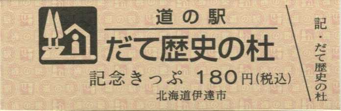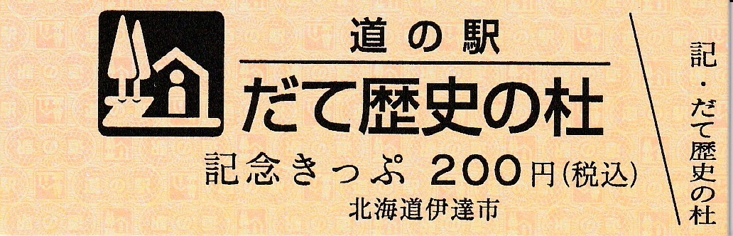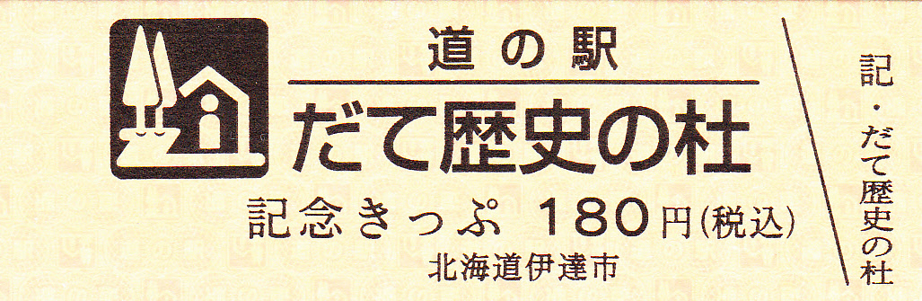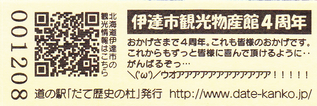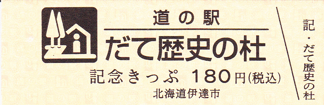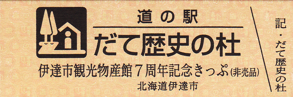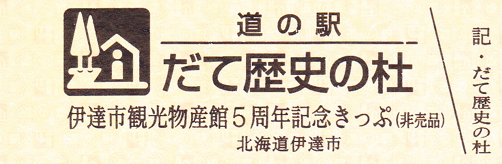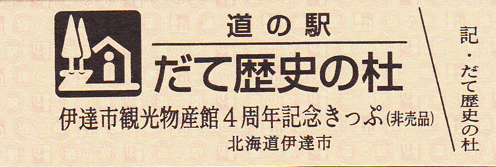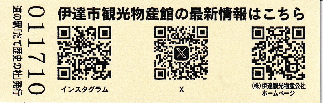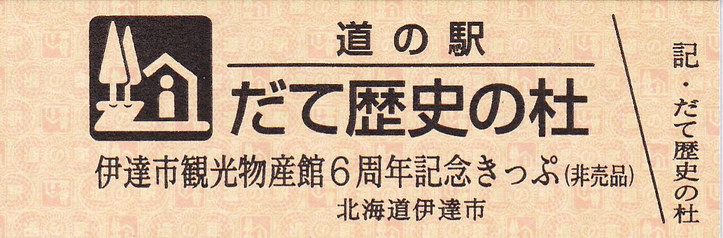 000001-000300:宮尾登美子文学記念館オープン記念きっぷ(配布終了) 000301-000600:伊達市観光物産館移転オープン記念きっぷ(配布終了) 000601-000900:伊達市観光物産館1周年記念きっぷ(配布終了) 000901-001200:伊達市観光物産館3周年記念きっぷ(配布終了) 001201-001500:伊達市観光物産館4周年記念きっぷ(2015)(配布終了) 001501-001800:伊達市観光物産館4周年記念きっぷ(2016)(配布終了) 001801-002100:伊達市観光物産館5周年記念きっぷ(配布終了) 002101-002400:伊達市観光物産館6周年記念きっぷ(配布終了) 002401-002700:伊達市観光物産館7周年記念きっぷ(配布終了)