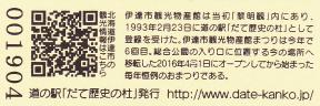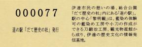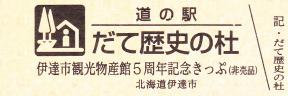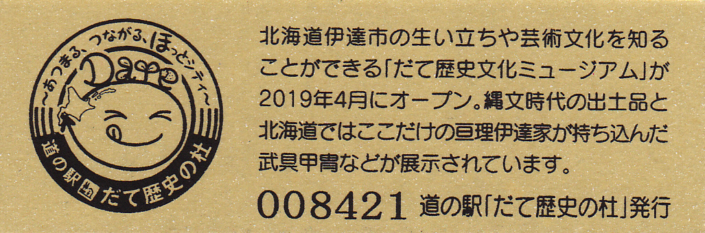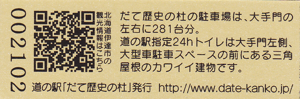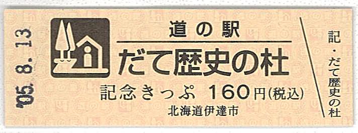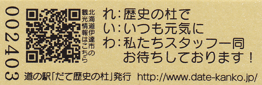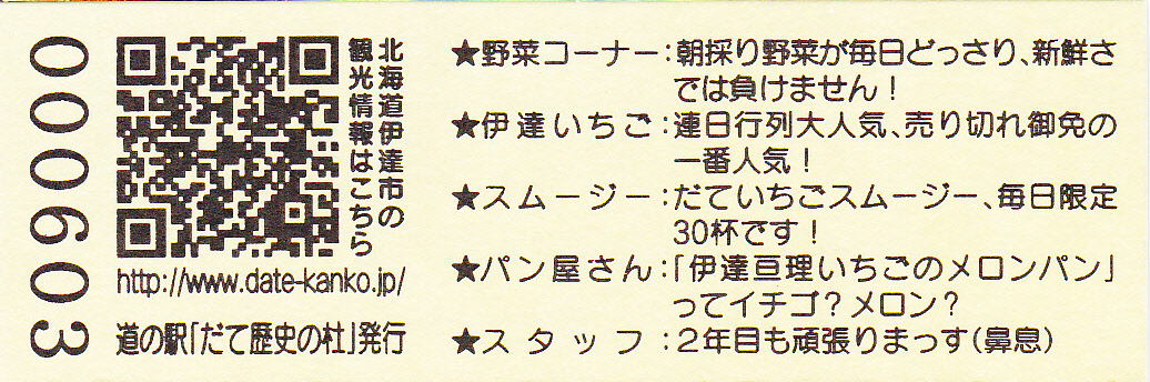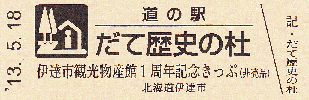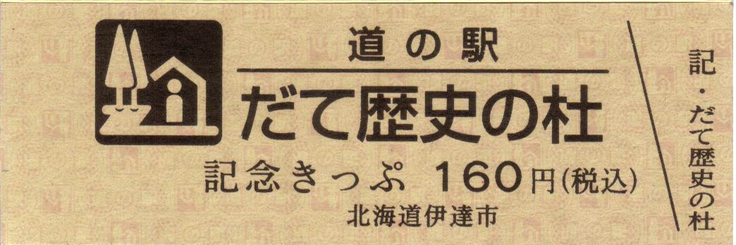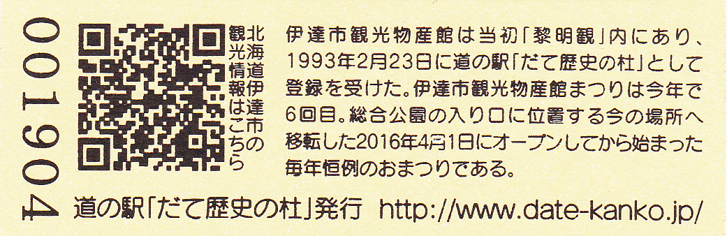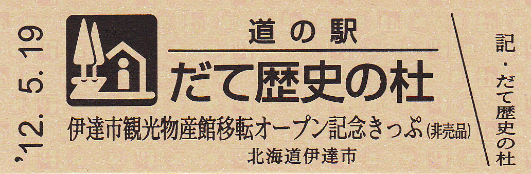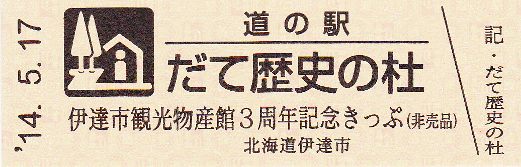 000001-000300:宮尾登美子文学記念館オープン記念きっぷ(配布終了) 000301-000600:伊達市観光物産館移転オープン記念きっぷ(配布終了) 000601-000900:伊達市観光物産館1周年記念きっぷ(配布終了) 000901-001200:伊達市観光物産館3周年記念きっぷ(配布終了) 001201-001500:伊達市観光物産館4周年記念きっぷ(2015)(配布終了) 001501-001800:伊達市観光物産館4周年記念きっぷ(2016)(配布終了) 001801-002100:伊達市観光物産館5周年記念きっぷ(配布終了) 002101-002400:伊達市観光物産館6周年記念きっぷ(配布終了) 002401-002700:伊達市観光物産館7周年記念きっぷ(配布終了)