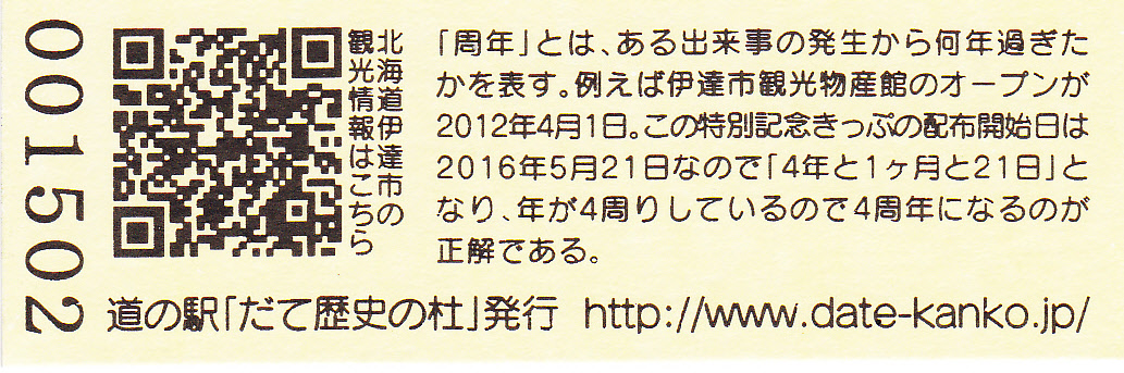 001501~001800 (特)伊達市観光物産館4周年記念きっぷ(2016)