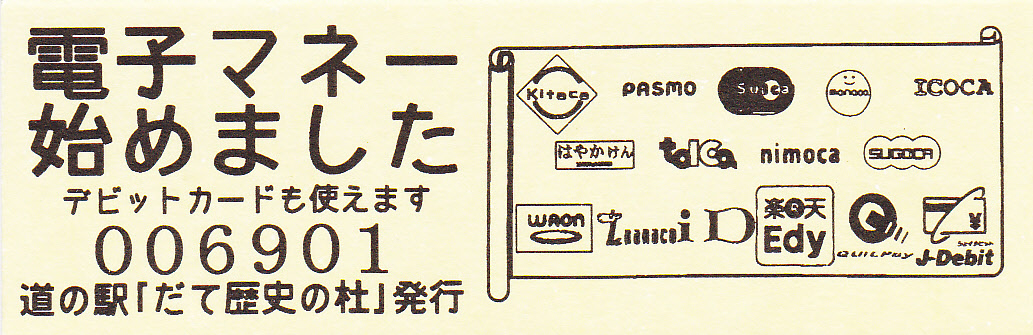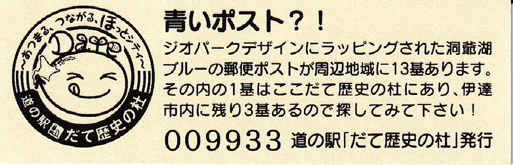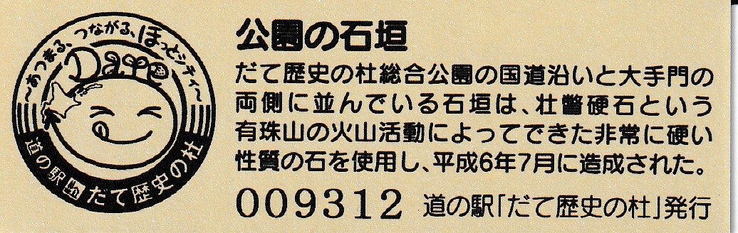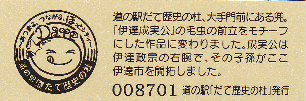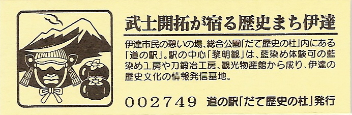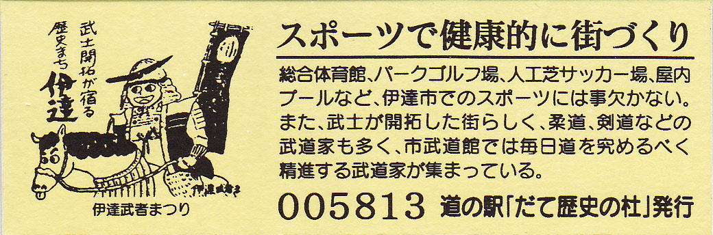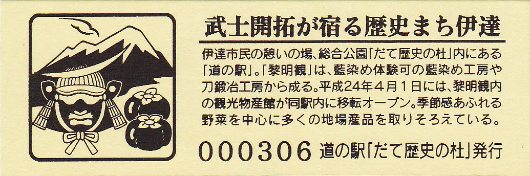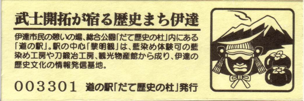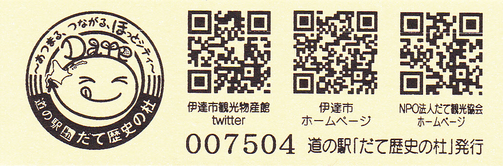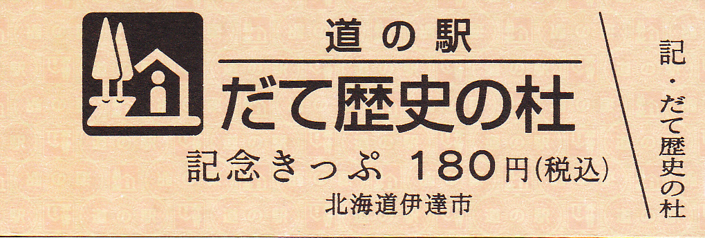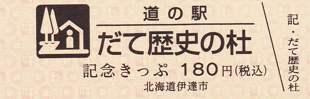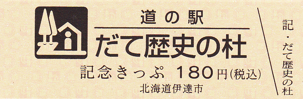 000001-000900:記念きっぷ(入) 000901-001200:記念きっぷ(記)<住所左> 001201-002100:記念きっぷ(記)<住所中央> 002101-002700:デザインきっぷ(オコンシベ君) 002701-003300:デザインきっぷ(カントリーサイン・左) 003301-004900:デザインきっぷ(カントリーサイン・右) 004901-005200:デザインきっぷ(伊達武者まつり) 005201-005800:180円きっぷ(伊達武者まつり・右) 005801-006600:180円きっぷ(伊達武者まつり・左・スポーツで…) 006601-006900:180円きっぷ(伊達武者まつり・左・大自然の…) 006901-007500:180円きっぷ(電子マネー始めました) 007501-007800:180円きっぷ(スタンプ・QRコード) 007801-008100:180円きっぷ(食べて学んで健康づくり) 008101-008400:180円きっぷ(スタンプ・大きな兜) 008401-008700:180円きっぷ(スタンプ・だて歴史文化ミュージアム) 008701-009000:180円きっぷ(スタンプ・伊達成実公) 009001-009300:180円きっぷ(歴史の杜の電子基準点を探せ) 009301-009600:180円きっぷ(公園の石垣) 009601-009900:180円きっぷ(縄文時代の生活を見に行こう!) 009901-010500:180円きっぷ(青いポスト?!) 010501-010800:200円きっぷ(縄文の風を感じて) 010801-011100:200円きっぷ(大手門をくぐって行くと) 011101-011700:200円きっぷ(伊達の藍に会いに来て) 011701- :200円きっぷ(伊達市観光物産館の最新情報はこちら)