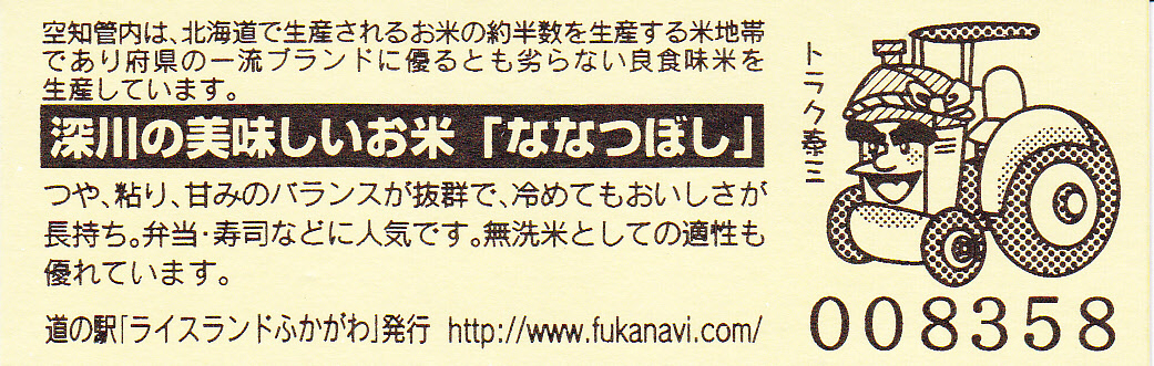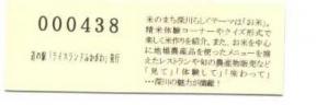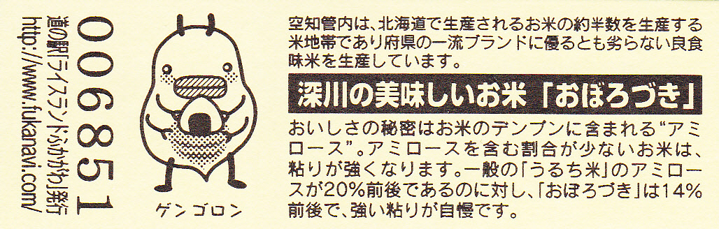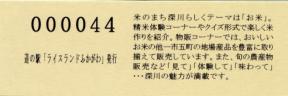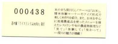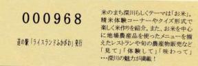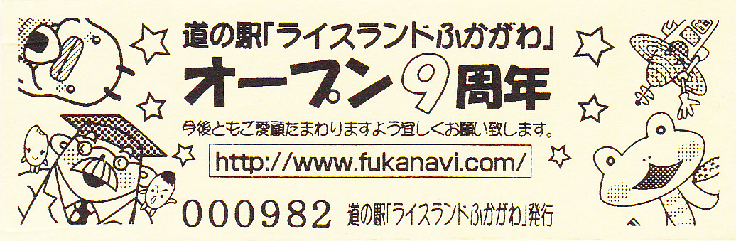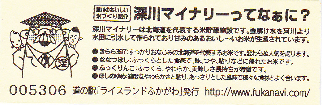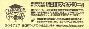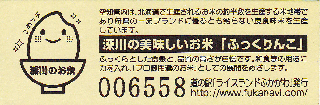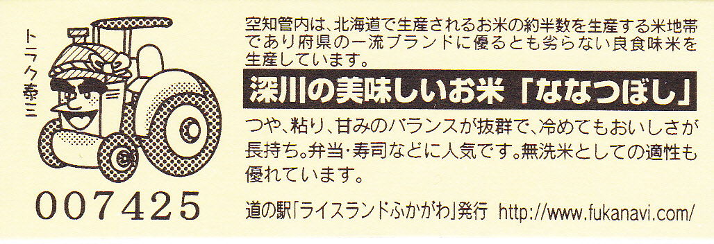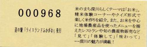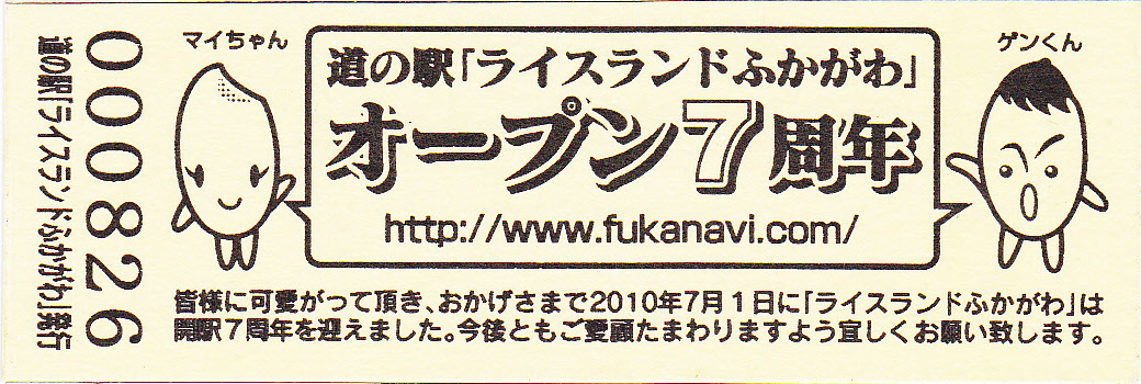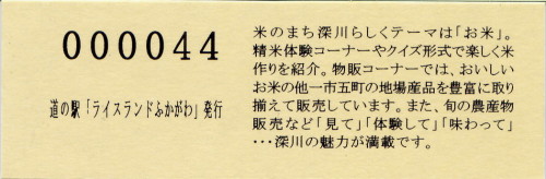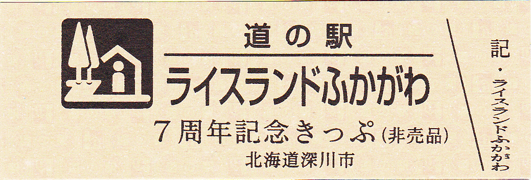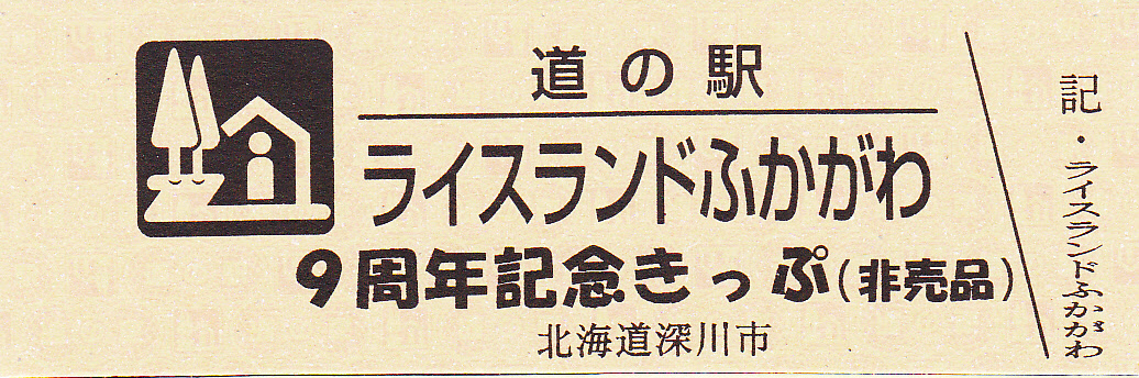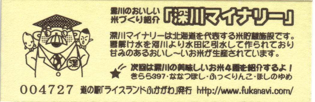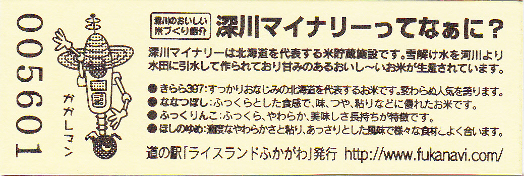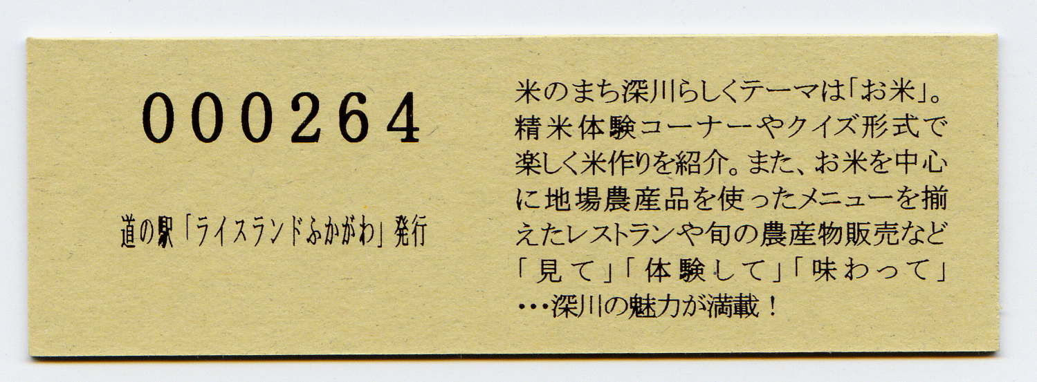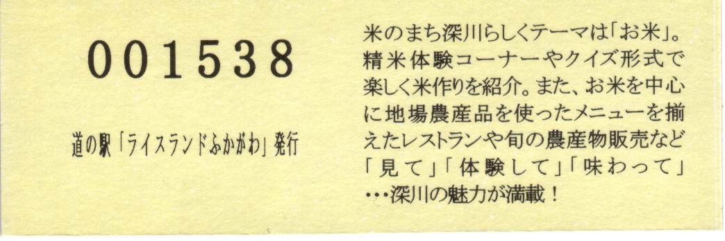 000001-000300:記念入場券(ピンク券) 000301-000600:記念入場券(通常券) 000601-001500:記念きっぷ(入) 001501-002900:記念きっぷ(記) 002901-003800:デザインきっぷ(育みゆく穂波の大地) 003801-004400:デザインきっぷ(スタンプ) 004401-004700:デザインきっぷ(マイちゃん、ゲンくん) 004701-005300:デザインきっぷ(深川マイナリー) 005301-005600:デザインきっぷ(深川マイナリーってなぁに?・博士) 005601-005900:デザインきっぷ(深川マイナリーってなぁに?・かかしマン) 005901-006500:デザインきっぷ(ゆめぴりか) 006501-006800:デザインきっぷ(ふっくりんこ) 006801-007100:デザインきっぷ(おぼろづき) 007101-007400:180円きっぷ(ゆめぴりか) 007401-007700:180円きっぷ(ななつぼし・イラスト左) 007701-008300:180円きっぷ(感謝!オープン10周年!!) 008301-012500:180円きっぷ(ななつぼし・イラスト右) 012501- :200円きっぷ