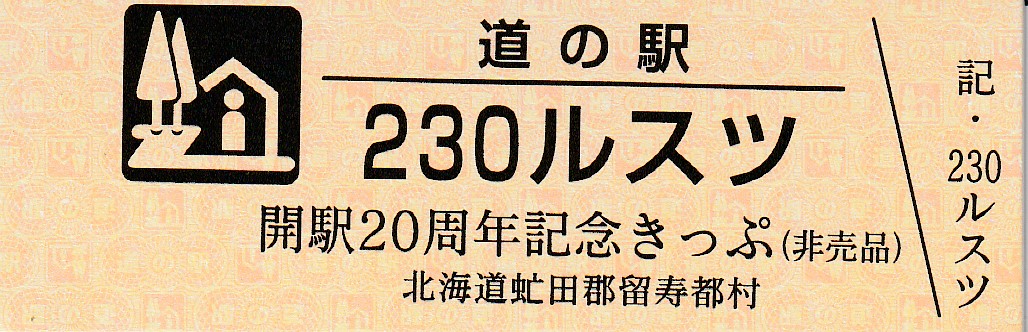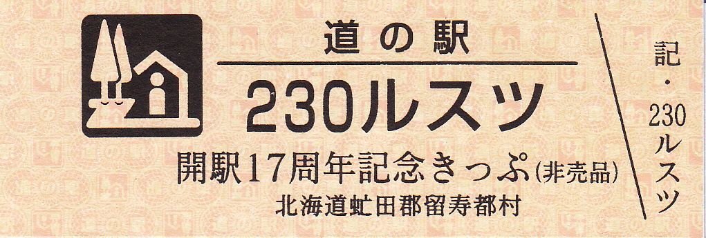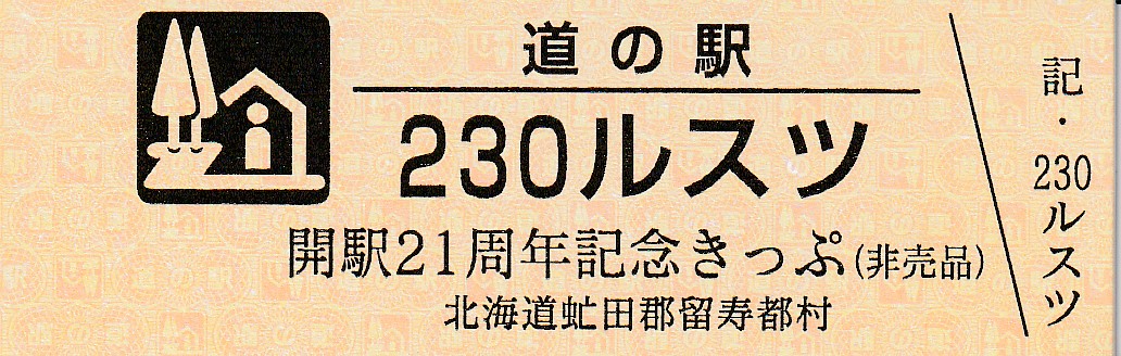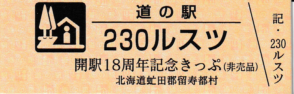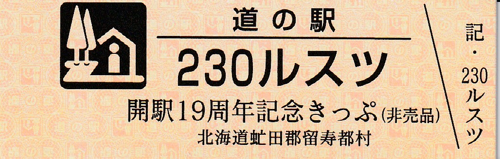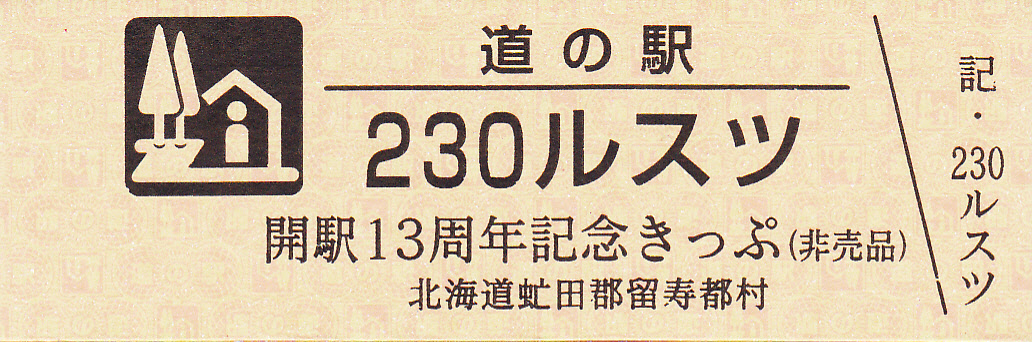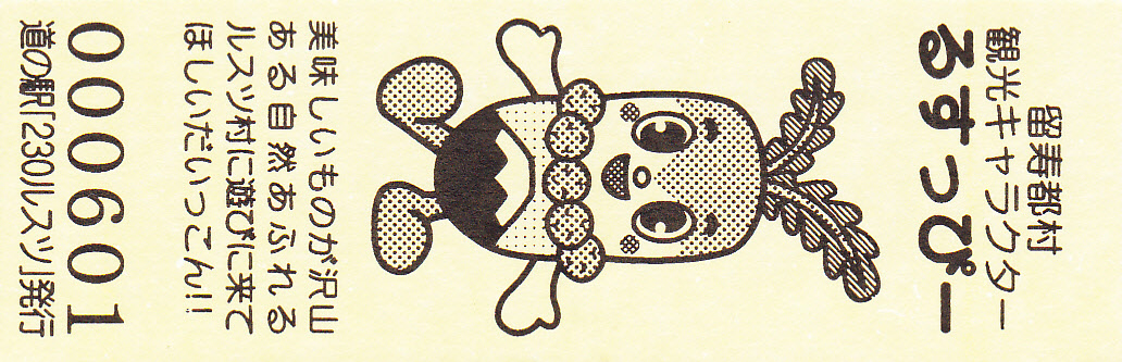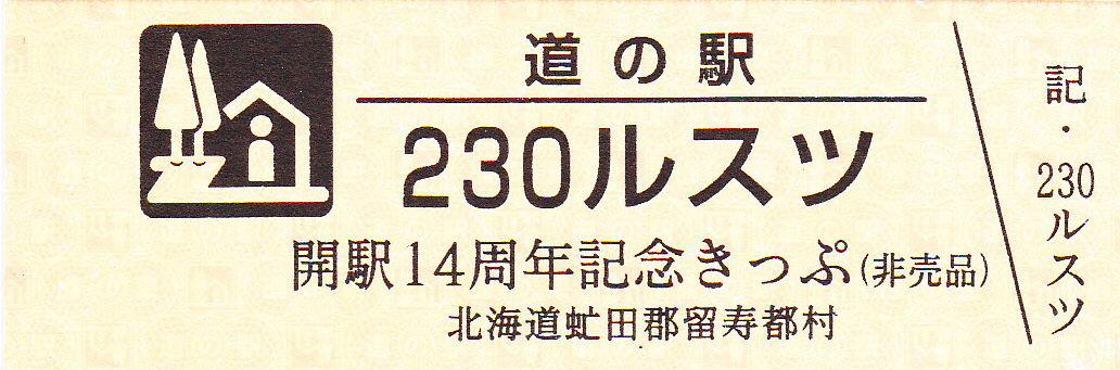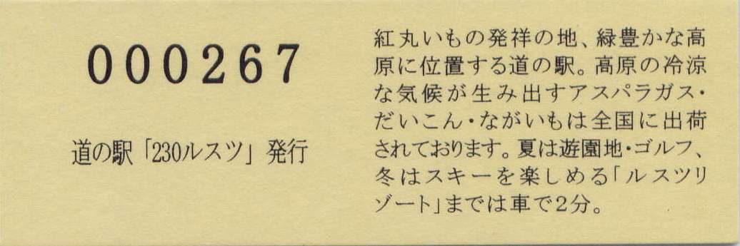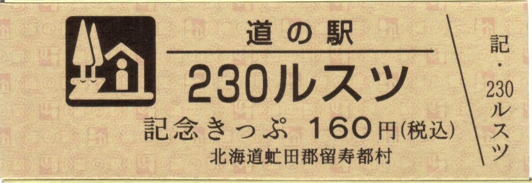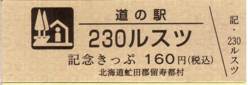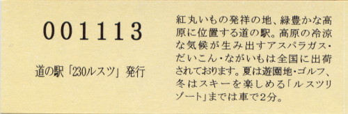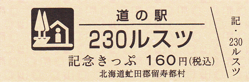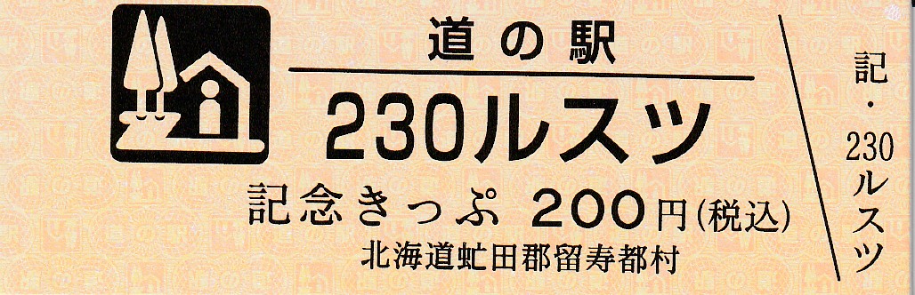 000001-000300:記念入場券(通常券) 000301-001100:記念きっぷ(入) 001101-002300:記念きっぷ(記) 002301-003200:デザインきっぷ(パラグライダー) 003201-003600:デザインきっぷ(母思像) 003601-003900:デザインきっぷ(カントリーサイン) 003901-004200:デザインきっぷ(スキー) 004201-004500:デザインきっぷ(少女) 004501-004800:デザインきっぷ(野菜) 004801-005200:デザインきっぷ(浪越徳次郎) 005201-005500:デザインきっぷ(ふれあい公園・のきみちゃん) 005501-005800:デザインきっぷ(雪だるま) 005801-006100:デザインきっぷ(ふれあい公園・ゴルフ) 006101-006400:デザインきっぷ(ジャガイモ・大根・きのこ採り) 006401-006700:デザインきっぷ(ジャガイモ・ビーチ) 006701-007000:180円きっぷ(ジャガイモ・大根・ゴルフ) 007101-007300:180円きっぷ(ジャガイモ・大根・駅舎) 007301-007600:180円きっぷ(スキー) 007601-007900:180円きっぷ(夜露のおりる留寿都村) 007901-008200:180円きっぷ(ルスツおんせん) 008201-008500:180円きっぷ(羊蹄山と野菜) 008501-008500:180円きっぷ(ジャガイモ・大根・ルスツリゾート) 008801-009100:180円きっぷ(ジャガイモ・大根・とうもろこし) 009101-009700:180円きっぷ(230ルスツ) 009701-010300:180円きっぷ(ありがとう15周年) 010301-010900:180円きっぷ(ルスツMICHINOEKI230) 010901-011500:180円きっぷ(るすっぴー両側・Rusutsu230) 011501-012400:180円きっぷ(るすっぴーRusutsu230・建物) 012401-013300:200円きっぷ(るすっぴー・バット・ボール) 013301-013600:200円きっぷ(るすっぴー・スキー・羊蹄山) 013601-014200:200円きっぷ(山麓留寿都・左) 014201- :200円きっぷ(山麓留寿都・右)