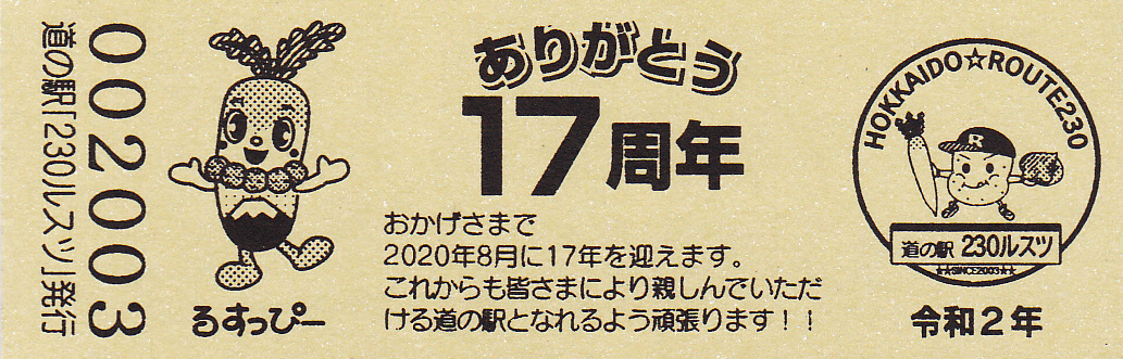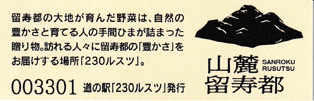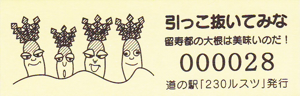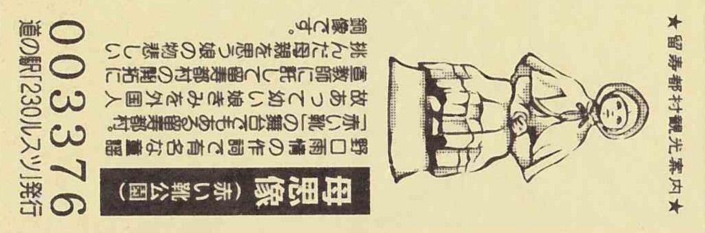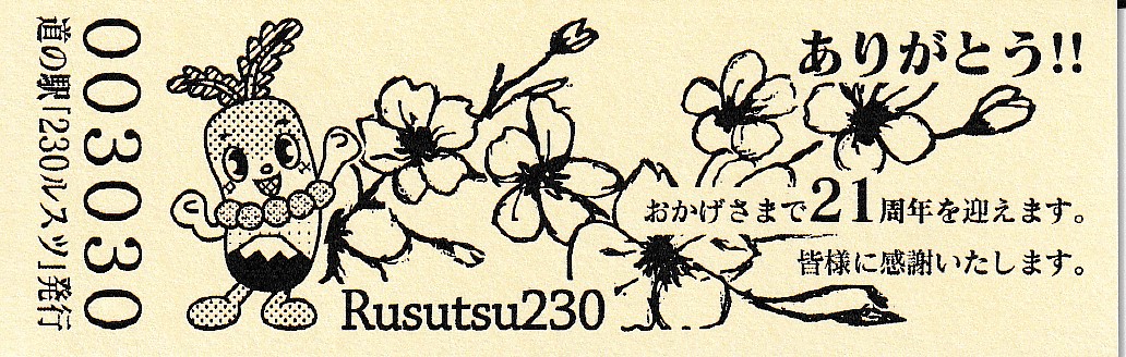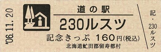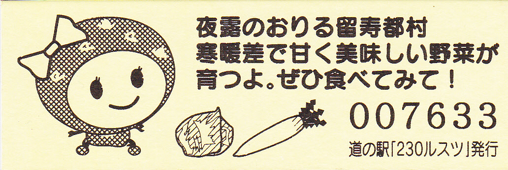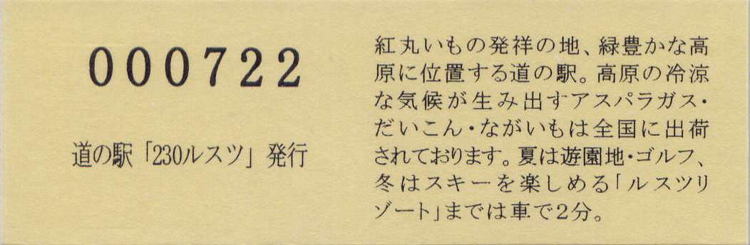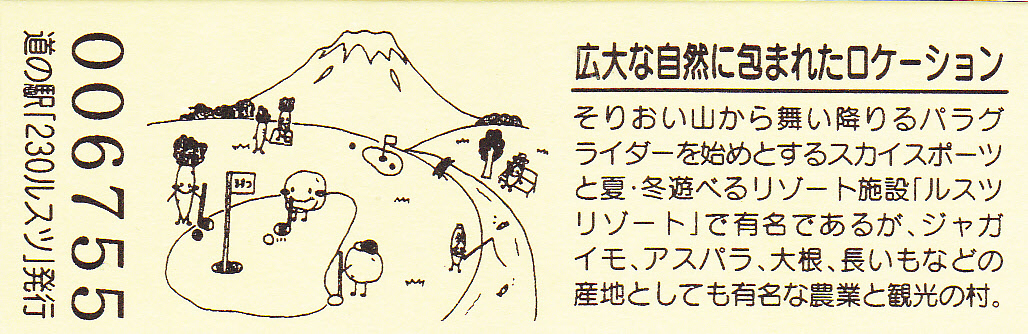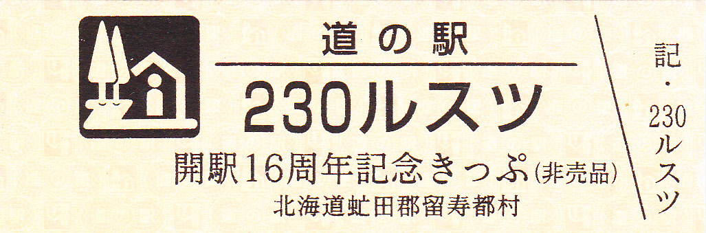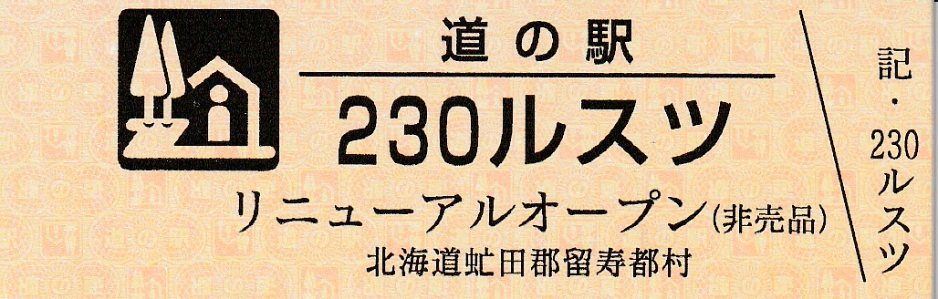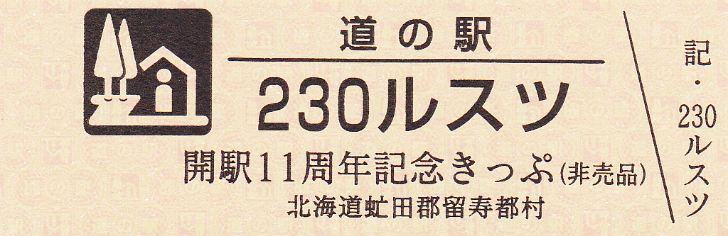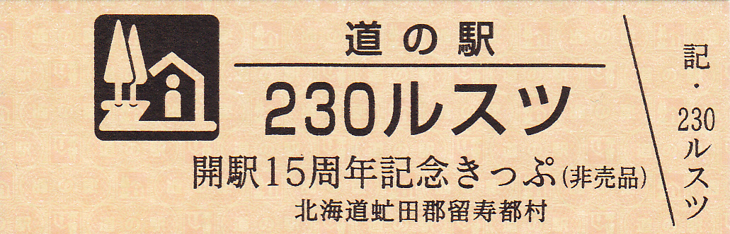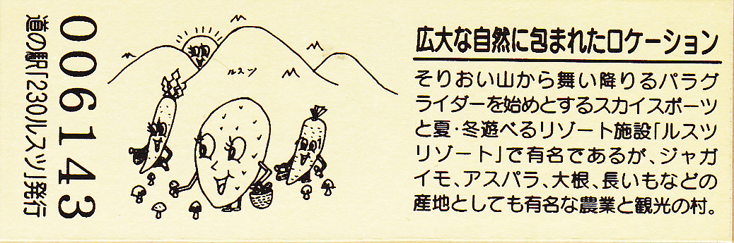 000001-000300:記念入場券(通常券) 000301-001100:記念きっぷ(入) 001101-002300:記念きっぷ(記) 002301-003200:デザインきっぷ(パラグライダー) 003201-003600:デザインきっぷ(母思像) 003601-003900:デザインきっぷ(カントリーサイン) 003901-004200:デザインきっぷ(スキー) 004201-004500:デザインきっぷ(少女) 004501-004800:デザインきっぷ(野菜) 004801-005200:デザインきっぷ(浪越徳次郎) 005201-005500:デザインきっぷ(ふれあい公園・のきみちゃん) 005501-005800:デザインきっぷ(雪だるま) 005801-006100:デザインきっぷ(ふれあい公園・ゴルフ) 006101-006400:デザインきっぷ(ジャガイモ・大根・きのこ採り) 006401-006700:デザインきっぷ(ジャガイモ・ビーチ) 006701-007000:180円きっぷ(ジャガイモ・大根・ゴルフ) 007101-007300:180円きっぷ(ジャガイモ・大根・駅舎) 007301-007600:180円きっぷ(スキー) 007601-007900:180円きっぷ(夜露のおりる留寿都村) 007901-008200:180円きっぷ(ルスツおんせん) 008201-008500:180円きっぷ(羊蹄山と野菜) 008501-008500:180円きっぷ(ジャガイモ・大根・ルスツリゾート) 008801-009100:180円きっぷ(ジャガイモ・大根・とうもろこし) 009101-009700:180円きっぷ(230ルスツ) 009701-010300:180円きっぷ(ありがとう15周年) 010301-010900:180円きっぷ(ルスツMICHINOEKI230) 010901-011500:180円きっぷ(るすっぴー両側・Rusutsu230) 011501-012400:180円きっぷ(るすっぴーRusutsu230・建物) 012401-013300:200円きっぷ(るすっぴー・バット・ボール) 013301-013600:200円きっぷ(るすっぴー・スキー・羊蹄山) 013601-014200:200円きっぷ(山麓留寿都・左) 014201- :200円きっぷ(山麓留寿都・右)