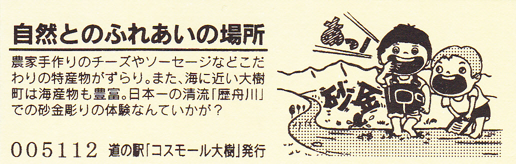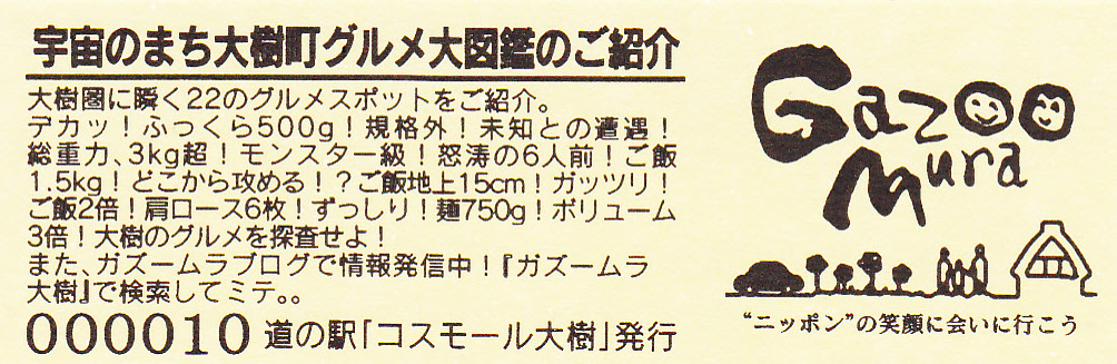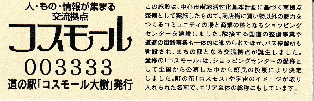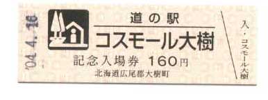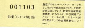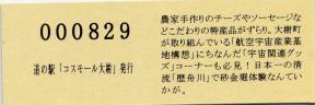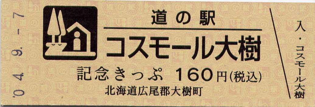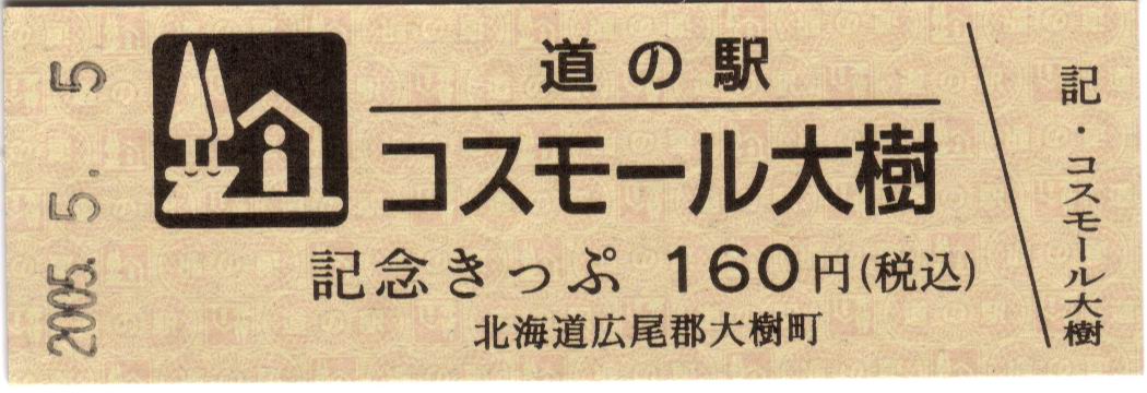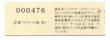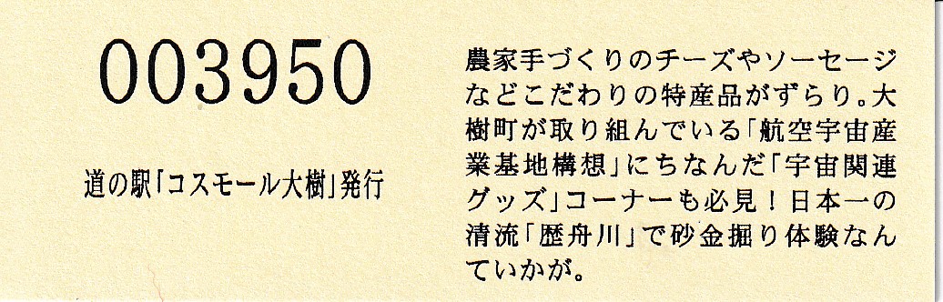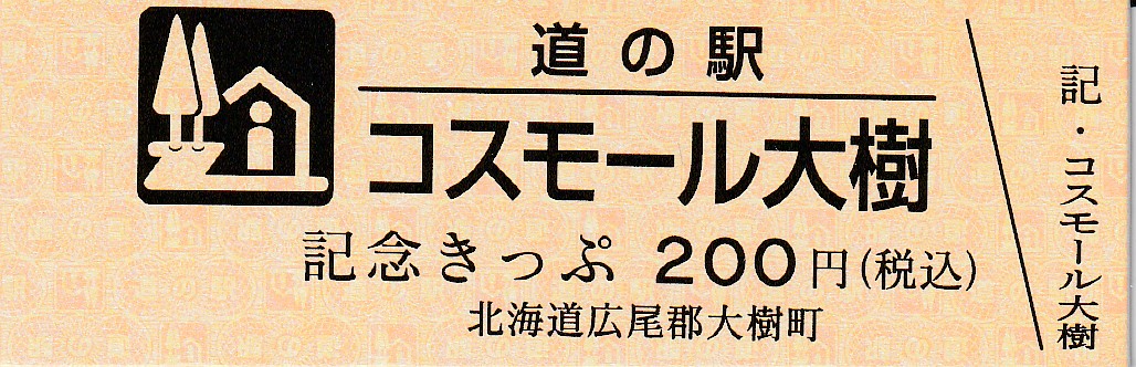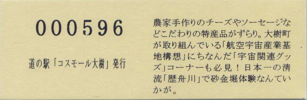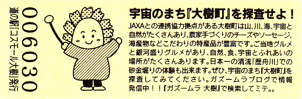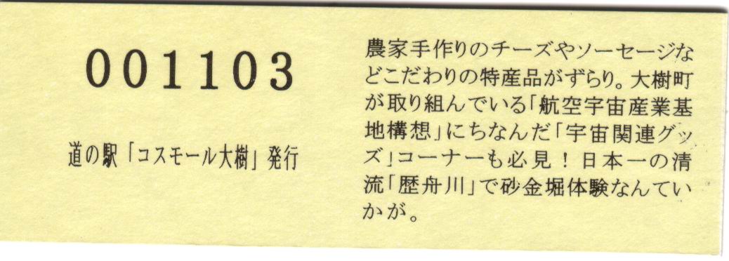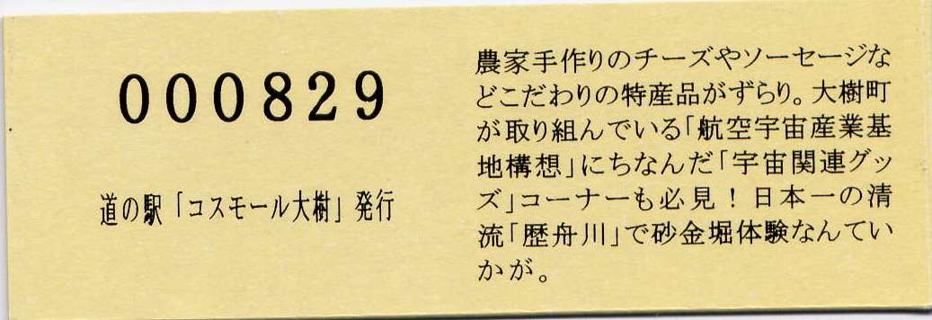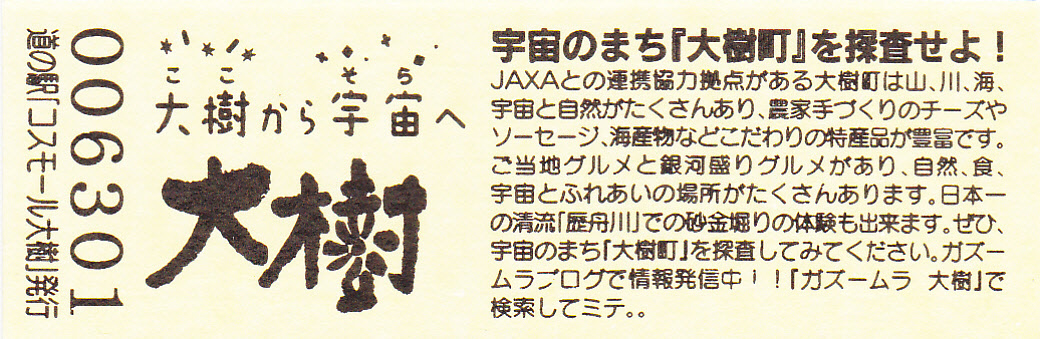 000001-000500:記念入場券(ピンク券) 000501-000700:記念入場券(通常券) 000701-001100:記念きっぷ(入) 001101-001400:記念きっぷ(記)<住所左> 001401-001700:記念きっぷ(記)<住所中央> 001701-002300:記念きっぷ(記)<住所中央その2> 002301-002600:記念きっぷ(記)<住所中央裏面文書印刷位置変更> 002601-002900:デザインきっぷ(イラスト左) 002901-005000:デザインきっぷ(イラスト右) 005001-006000:180円きっぷ(自然とのふれあいの場所) 006001-006300:180円きっぷ(宇宙のまち) 006301-008100:180円きっぷ(大樹から宇宙へ・ガズムーラプログで情報発信中) 008101-009300:180円きっぷ(大樹から宇宙へ・北の道の駅HPやFacebookで情報発信中) 009301- :200円きっぷ