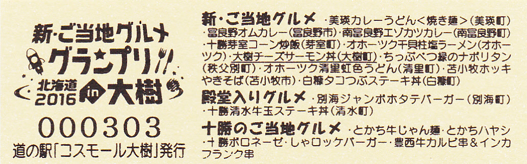 000301~000900 (特)新・ご当地グルメグランプリ北海道2016in大樹開催記念きっぷ