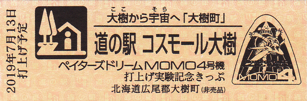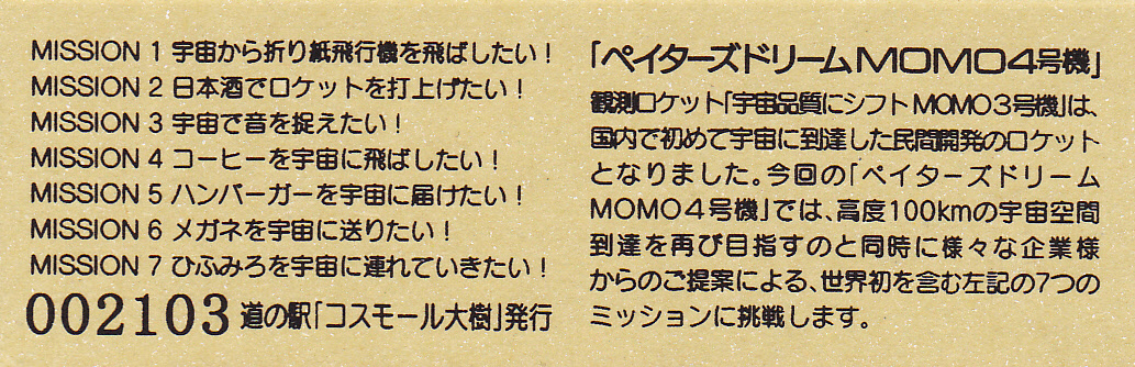 002101~002400 (特)ペイターズドリームMOMO4号機打上げ実験記念きっぷ