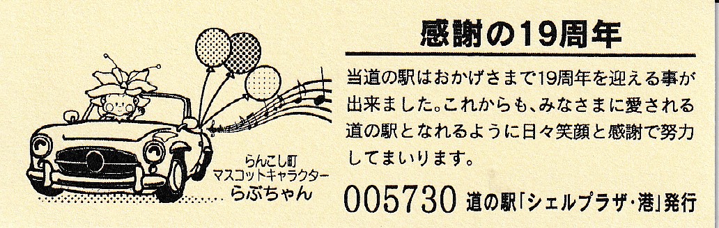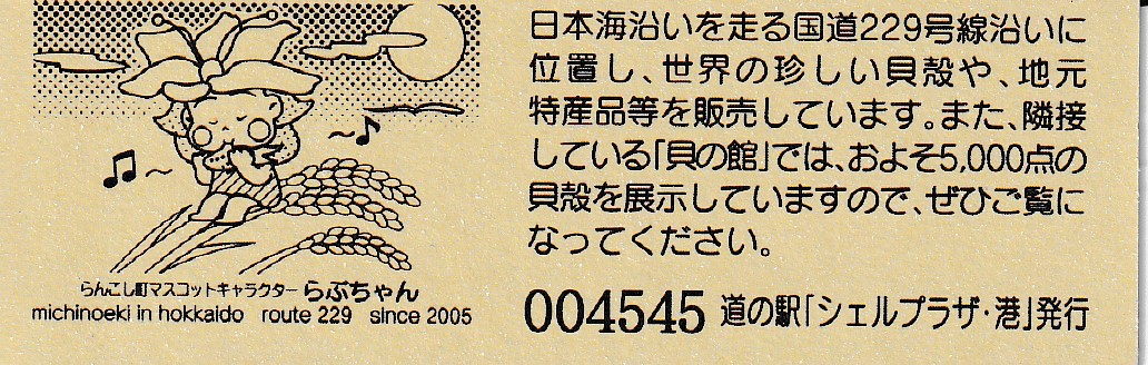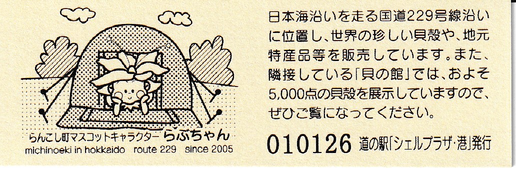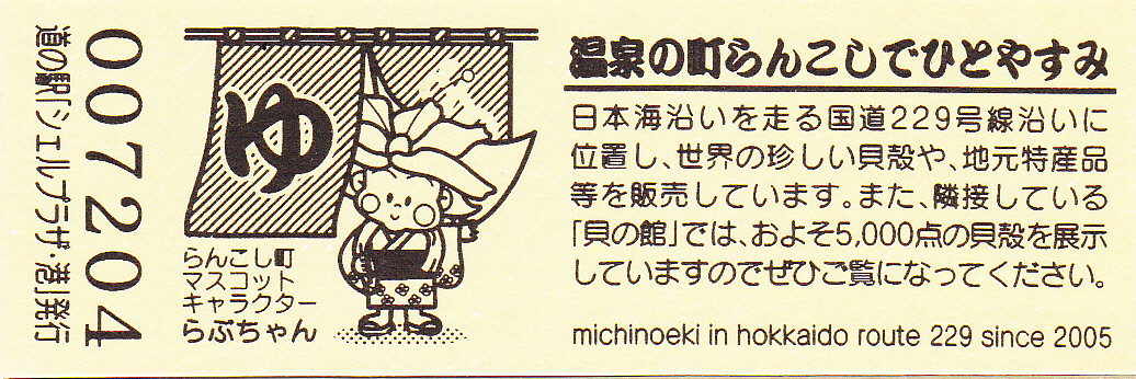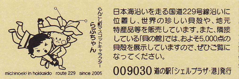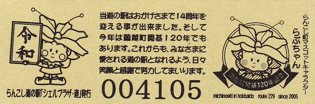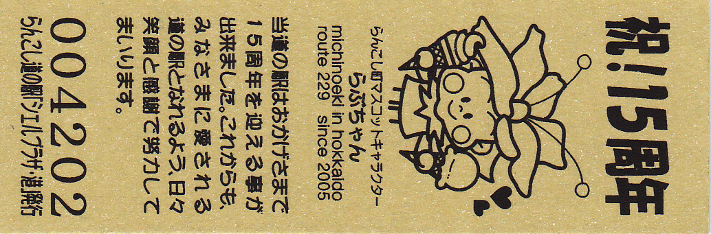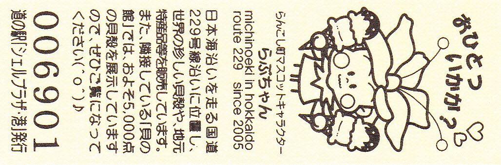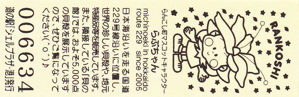 000001-001200:記念きっぷ(記) 001201-001500:デザインきっぷ(貝・右) 001501-001800:デザインきっぷ(船) 001801-002100:デザインきっぷ(貝・左) 002101-002600:デザインきっぷ(らぶちゃんと花) 002601-002900:デザインきっぷ(星) 002901-003200:デザインきっぷ(ハート) 003201-003500:デザインきっぷ(両端にらぶちゃん) 003501-003800:デザインきっぷ(北海道地図) 003801-004100:デザインきっぷ(北斗七星北極星) 004101-004400:デザインきっぷ(らぶちゃん漁) 004401-004600:デザインきっぷ(らぶちゃんとかかし) 004601-004800:デザインきっぷ(らぶちゃんとオリオン座) 004801-005000:デザインきっぷ(らぶちゃんゴルフ) 005001-005200:デザインきっぷ(らぶちゃんゆかた) 005201-005400:デザインきっぷ(らぶちゃんらんこし米おにぎり) 005401-005600:デザインきっぷ(らぶちゃん虫取り) 005601-005700:180円きっぷ(らぶちゃん虫取り) 005701-006000:180円きっぷ(らぶちゃんとホネ貝くん) 006001-006300:180円きっぷ(蘭越町貝の館) 006301-006600:180円きっぷ(らぶちゃんと雪だるま) 006601-006900:180円きっぷ(らぶちゃん・縦・RANKOSHI) 006901-007200:180円きっぷ(らぶちゃん・縦・おひとついかが) 007201-007500:180円きっぷ(らぶちゃん・温泉の町) 007501-007800:180円きっぷ(らぶちゃんとカエル) 007801-008100:180円きっぷ(らぶちゃんとらんこし米) 008101-008400:180円きっぷ(らぶちゃん・クリオネ) 008401-008700:180円きっぷ(らぶちゃん・令和) 008701-009000:180円きっぷ(らぶちゃん・蘭越町開基120年) 009001-009300:180円きっぷ(らぶちゃん・柔道) 009301-009600:180円きっぷ(らぶちゃん・花束) 009601-009900:180円きっぷ(らぶちゃん・らんこし米) 009901-010200:180円きっぷ(らぶちゃん・テント) 010201-010500:180円きっぷ(米-1グランプリ) 010501-010900:200円きっぷ(米-1グランプリ) 010901-011200:200円きっぷ(らぶちゃん・貝の館) 011201-011500:200円きっぷ(らぶちゃん・エッフェル塔) 011501-011800:200円きっぷ(サメのアゴとらぶちゃん) 011801-012100:200円きっぷ(らぶちゃん野球) 011201- :200円きっぷ(らぶちゃんとシマエナガ)