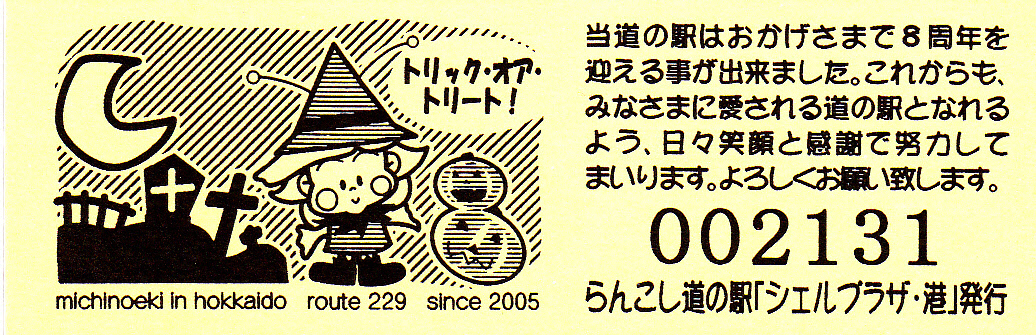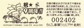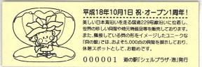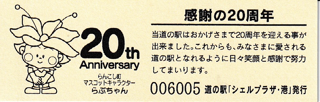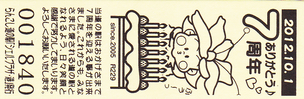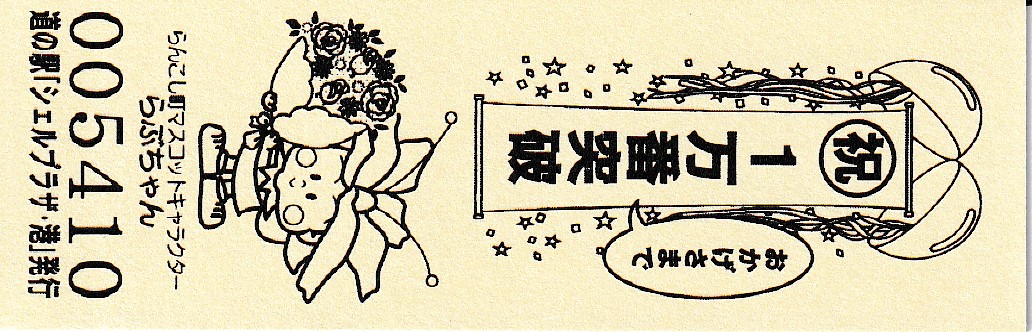 000001-000300:オープン1周年記念きっぷ(配布終了) 000301-000600:オープン2周年記念きっぷ(配布終了) 000601-000900:オープン3周年記念きっぷ(配布終了) 000901-001200:おかげさまで4周年記念きっぷ(配布終了) 001201-001500:ありがとう♪5周年記念きっぷ(配布終了) 001501-001800:開駅6周年記念きっぷ(配布終了) 001801-002100:ありがとう♪7周年記念きっぷ(配布終了) 002101-002400:ありがとう♪8周年記念きっぷ(配布終了) 002401-002700:ありがとう♪9周年記念きっぷ(配布終了) 002701-003000:ありがとう♪10周年記念きっぷ(配布終了) 003001-003300:ありがとう♪11周年記念きっぷ(配布終了) 003301-003600:ありがとう♪12周年記念きっぷ(配布終了) 003601-003900:ありがとう♪13周年記念きっぷ(配布終了) 003901-004200:ありがとう♪14周年記念きっぷ(配布終了) 004201-004500:ありがとう♪15周年記念きっぷ(配布終了) 004501-004800:祝 16周年記念きっぷ(配布終了) 004801-005100:ありがとう♪祝17周年記念きっぷ(配布終了) 005101-005400:ありがとう♪祝18周年記念きっぷ(配布終了) 005401-005700:一万番突破特別記念きっぷ(配布終了) 005701-006000:ありがとう♪祝19周年記念きっぷ(配布終了) 006001-006300:ありがとう♪祝20周年記念きっぷ(配布中)