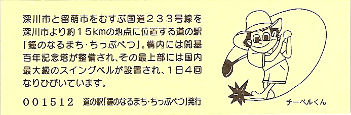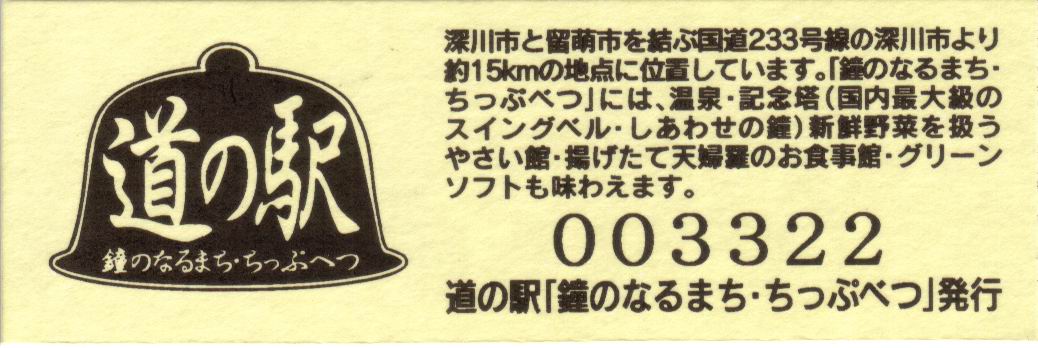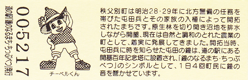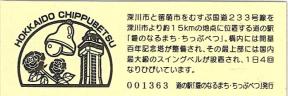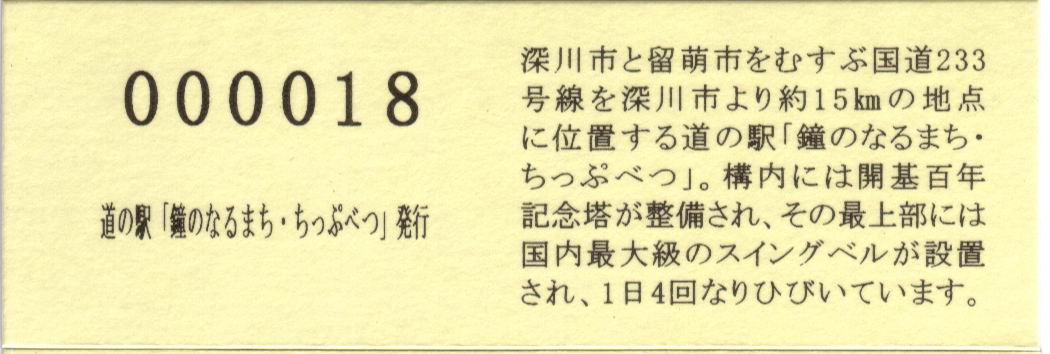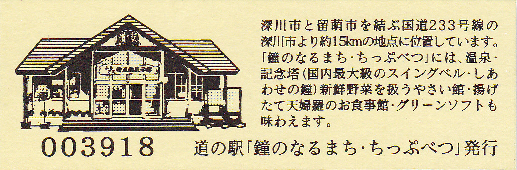 000001-001200:記念きっぷ(記) 001201-001500:デザインきっぷ(百年記念塔) 001501-001800:デザインきっぷ(チーベルくんゴルフ) 001801-002100:デザインきっぷ(ローズガーデン・バラ) 002101-002700:デザインきっぷ(しあわせの鐘) 002701-003300:デザインきっぷ(ローズガーデン・バラ顔あり) 003301-003600:デザインきっぷ(スイングベル) 003601-003900:デザインきっぷ(あかずきんちゃん) 003901-004200:デザインきっぷ(特産物展示館) 004201-004500:デザインきっぷ(ぽてとちっぷべつ) 004501-004800:デザインきっぷ(ちっぷゆう&ゆ) 004801-005100:デザインきっぷ(ブロッコリー) 005101-005400:180円きっぷ(チーベルくん) 005401-005700:180円きっぷ(ブロッコリー・ブロンソン) 005701-006000:180円きっぷ(ミドナポ) 006001-006300:180円きっぷ(からんころん) 006301-006600:180円きっぷ(ちっぷで快適生活) 006601-006900:180円きっぷ(カステラーナ日和) 006901-007200:180円きっぷ(キッズスクエアちっくる) 007201-007500:180円きっぷ(北海道地図) 007501-007900:180円きっぷ(ベルパークちっぷべつ3世代公園) 007901-008500:180円きっぷ(ゆう&ゆ・研修施設おおとり) 008501-009000:180円きっぷ(ゆう&ゆ・建物全景イラスト) 009001-009500:180円きっぷ(ゆう&ゆ・チーベルくん入浴) 009501-010000:180円きっぷ(ローズガーデン) 010001-010500:180円きっぷ(あかずきんちゃん) 010501-011000:200円きっぷ(おおかみ) 011001- :200円きっぷ(赤ずきんちゃん・おおかみ)