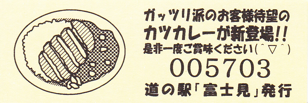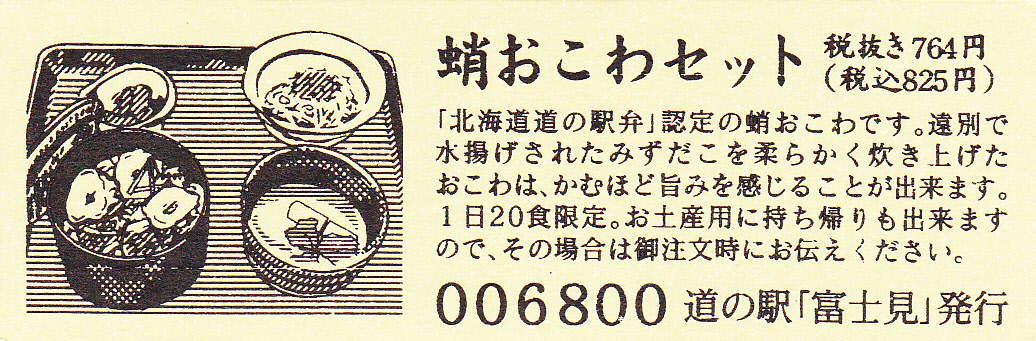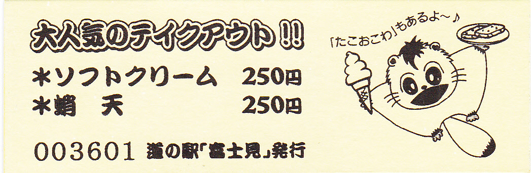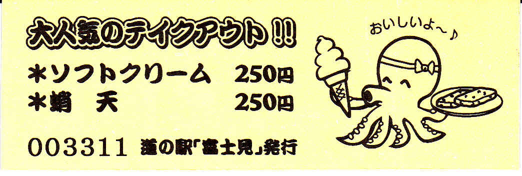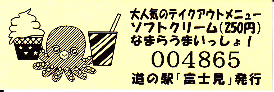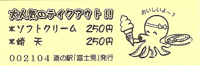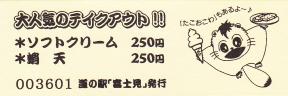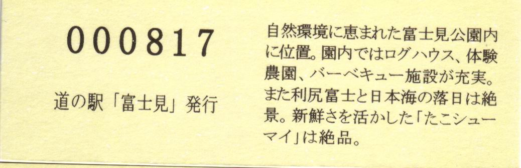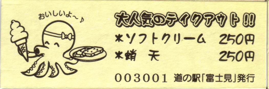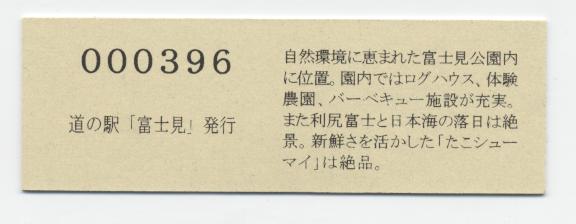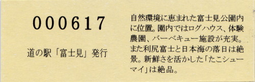 0001-0500:記念入場券(ピンク券) 0501-0800:記念きっぷ(入) 0801-1100:記念きっぷ(記)<住所左> 1101-1800:記念きっぷ(記)<住所中央> 1801-2100:デザインきっぷ(モモちん・道の駅紹介) 2101-3000:デザインきっぷ(タコ・右・細文字) 3001-3300:デザインきっぷ(タコ・左) 3301-3600:デザインきっぷ(タコ・右・太文字) 3601-4200:デザインきっぷ(モモちん・たこおこわ) 4201-4800:デザインきっぷ(とんがりかん) 4801-5700:180円きっぷ(ソフトクリーム) 5701-6600:180円きっぷ(カツカレー) 6601-7200:180円きっぷ(蛸おこわセット) 7201-7600:180円きっぷ(モモちん)
