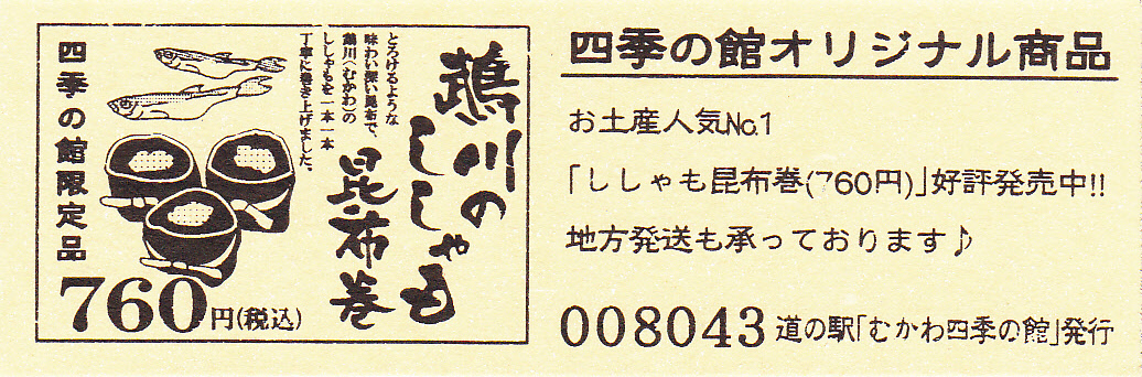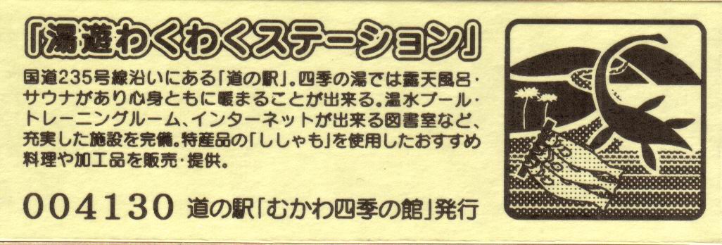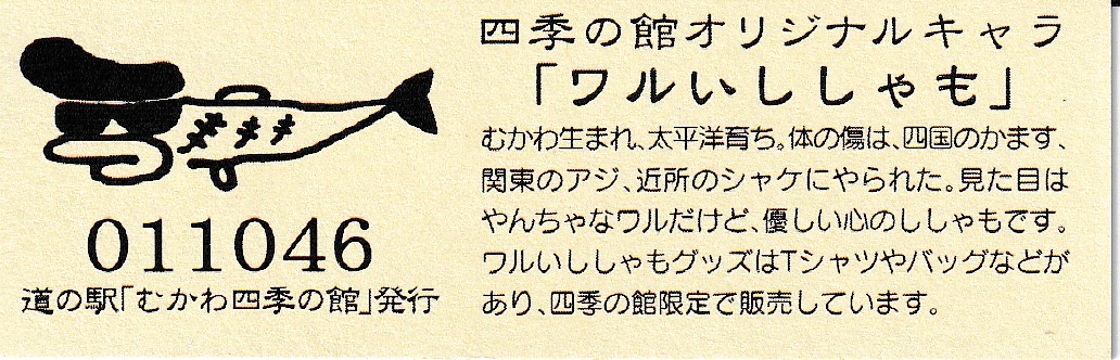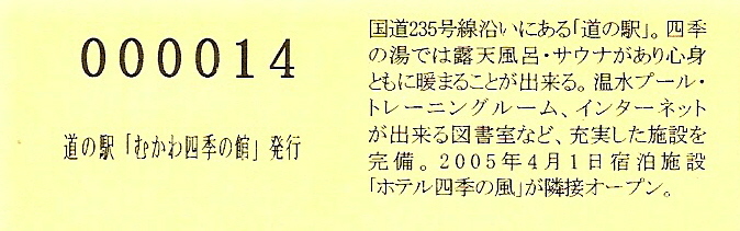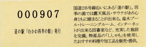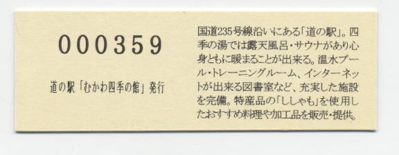 000001-000900:記念きっぷ(入) 000901-001200:記念きっぷ(記・鵡川町)<住所左> 001201-001500:記念きっぷ(記・鵡川町)<住所中央> 001501-002700:記念きっぷ(記・むかわ町) 002701-004100:デザインきっぷ(湯遊わくわくステーション・右) 004101-005000:デザインきっぷ(湯遊わくわくステーション・左) 005001-005900:デザインきっぷ(鵡川温泉四季の湯) 005901-006500:180円きっぷ(鵡川温泉四季の湯) 006501-006800:180円きっぷ(セゾンdeむかわ) 006801-007100:180円きっぷ(四季の館お勧めポイント・温泉…) 007101-007400:180円きっぷ(サービスデー) 007401-007700:180円きっぷ(四季の館お勧めポイント・四季の館…) 007701-008000:180円きっぷ(ししゃも醤油あいす) 008001-008300:180円きっぷ(鵡川のししゃも昆布巻) 008301-009200:180円きっぷ(昆布の佃煮) 009201-011000:180円きっぷ(ワルいししゃも) 011001- :200円きっぷ(ワルいししゃも)