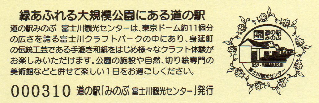 2013.03.20 販売中止(「富士川ふるさと工芸館」版・閉館) 2014.09.12 販売再開(「みのぶ 富士川観光センター」版・No.1〜) 2023.03.26 販売中止(富士川観光センター閉店・指定管理者変更)