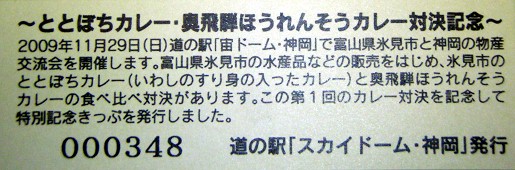 000301~000600 (特)ととぼちカレー・奥飛騨ほうれんそうカレー第1回対決記念きっぷ ![]() | |