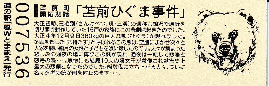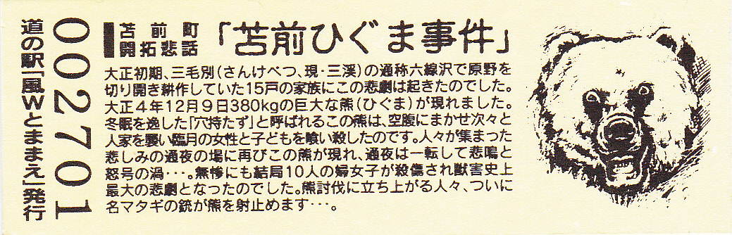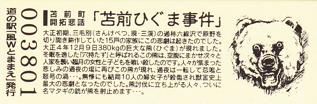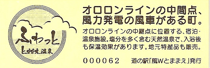 0001-0600:デザインきっぷ(オロロンライン) 0601-1500:デザインきっぷ(風がはこぶ苫前) 1501-1900:デザインきっぷ(古代の里) 1901-2700:デザインきっぷ(ひぐま・左) 2701-3800:デザインきっぷ(ひぐま・右) 3801-7500:180円きっぷ 7501- :200円きっぷ