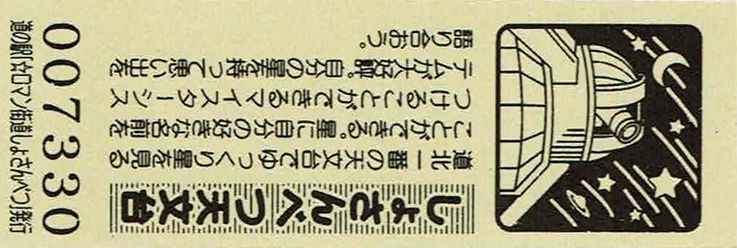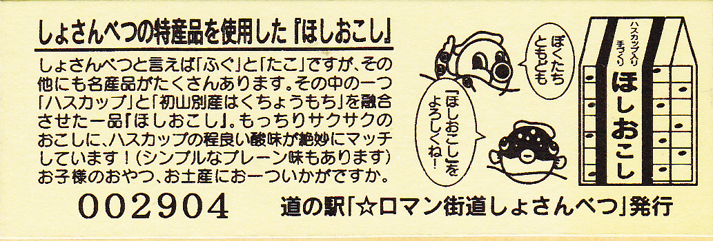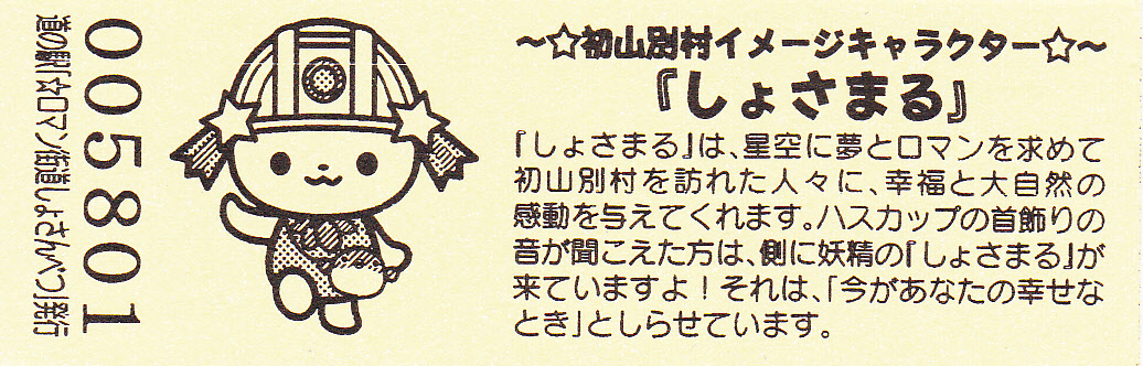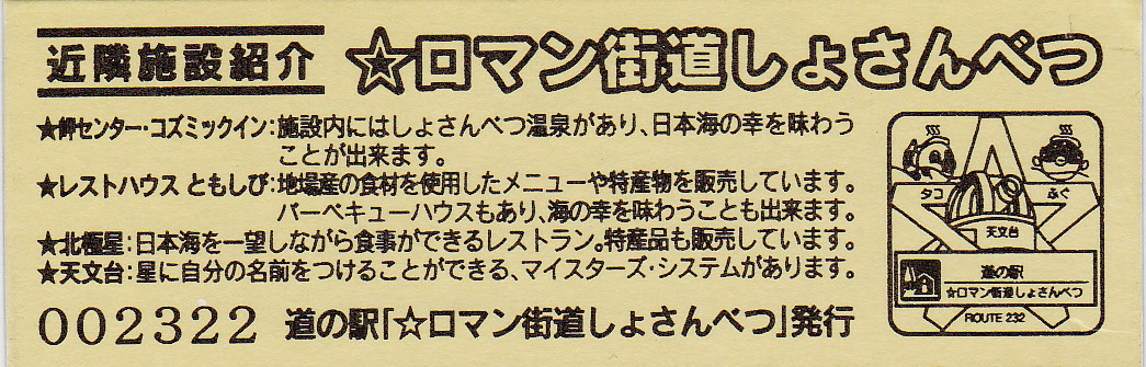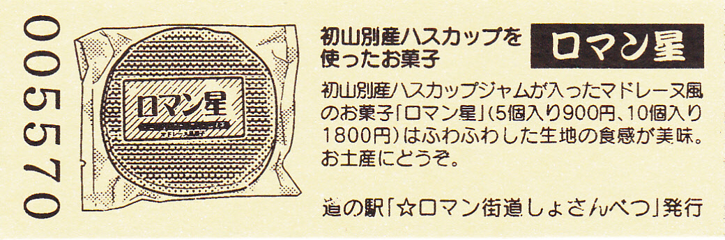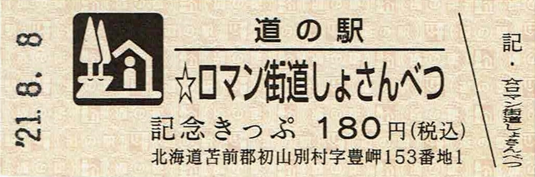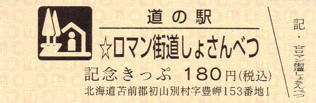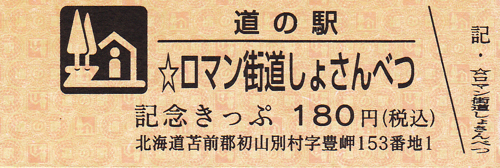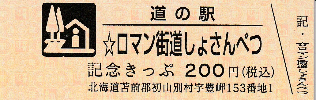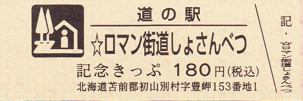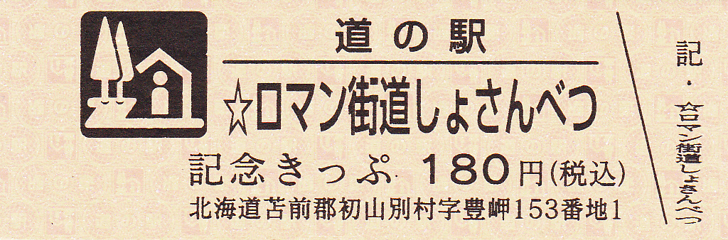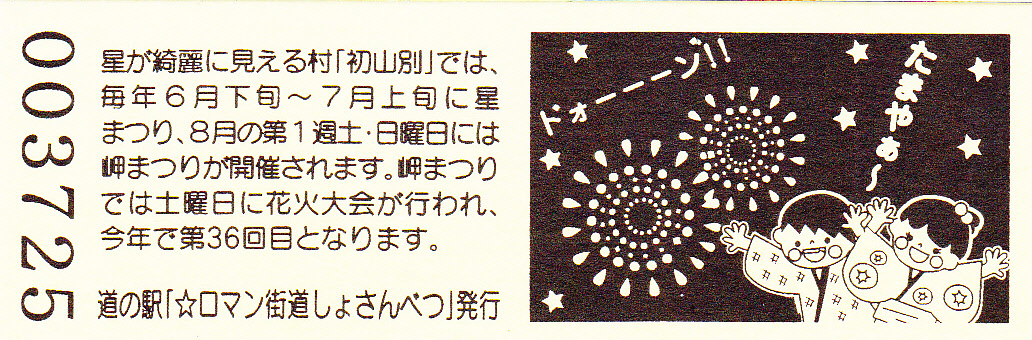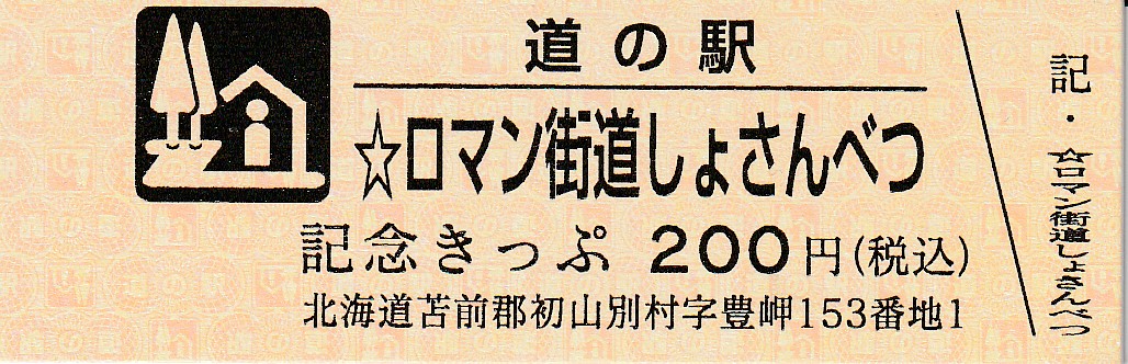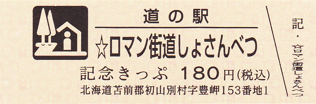 000001-000800:デザインきっぷ(その人・その星に) 000801-001100:デザインきっぷ(しょさんべつ天文台) 001101-001400:デザインきっぷ(岬台公園) 001401-001700:デザインきっぷ(ふぐ) 001701-002000:デザインきっぷ(ハスカップ) 002001-002300:デザインきっぷ(ふぐの人気メニュー) 002301-002600:デザインきっぷ(近隣施設紹介) 002601-002900:デザインきっぷ(初山別村といえば!) 002901-003500:デザインきっぷ(ほしおこし) 003501-003700:デザインきっぷ(天然真ふぐの照り焼き丼) 003701-004000:180円きっぷ(花火大会) 004001-004300:180円きっぷ(みさき台公園) 004301-004900:180円きっぷ(初山別村最大の観光スポット) 004901-005200:180円きっぷ(ふぐだしラーメン) 005201-005500:180円きっぷ(地元産搾りたて牛乳アイス) 005501-005800:180円きっぷ(ロマン星) 005801-006100:180円きっぷ(しょさまる) 006101-006400:180円きっぷ(岬の湯) 006401-006700:180円きっぷ(金比羅伝説) 006701-007000:180円きっぷ(有明獅子舞) 007001-007300:180円きっぷ(しょさんべつ温泉「岬の湯」) 007301-007600:180円きっぷ(しょさんべつ天文台)7601-007601-007900:180円きっぷ(金比羅神社) 007901-008200:180円きっぷ(北極星) 008201-008500:200円きっぷ(最大の観光スポット・初山別村) 008501-008800:200円きっぷ(地元産搾りたて牛乳アイス) 008801- 09300:200円きっぷ(ふぐだしラーメン) 009301- :200円きっぷ(しょさんべつの自然が育んだハスカップ)