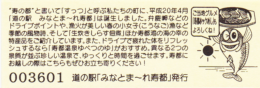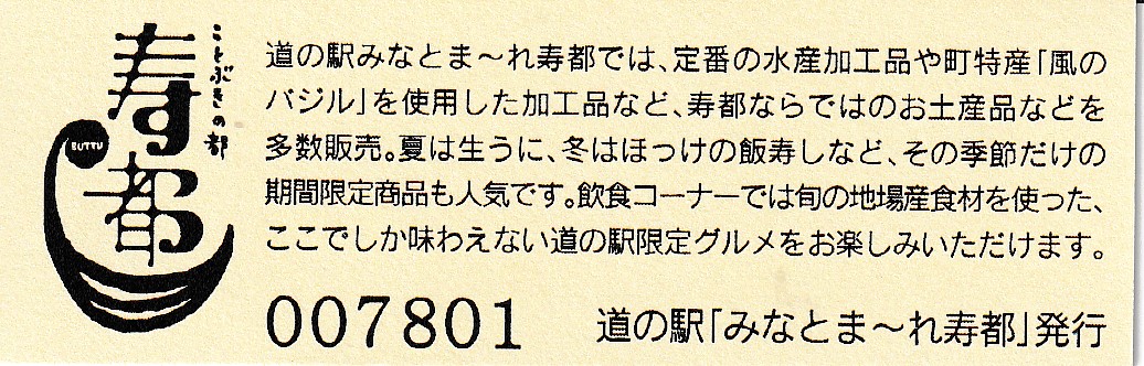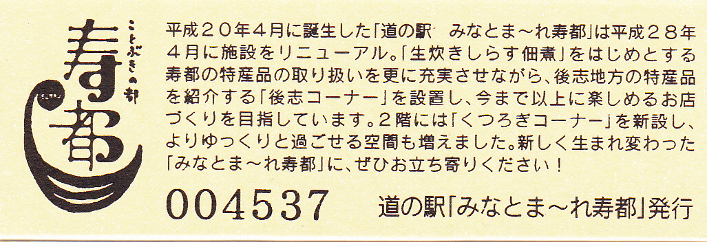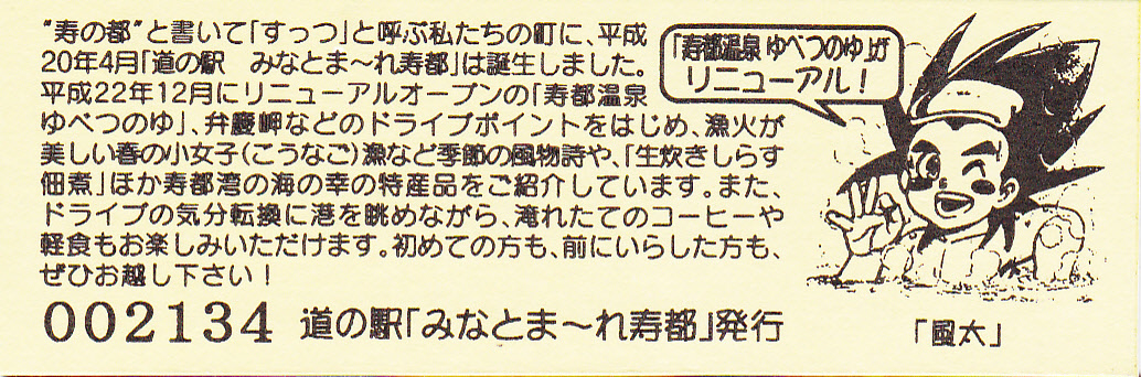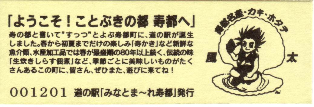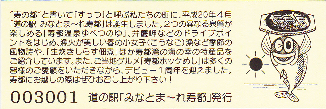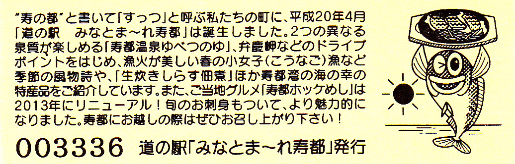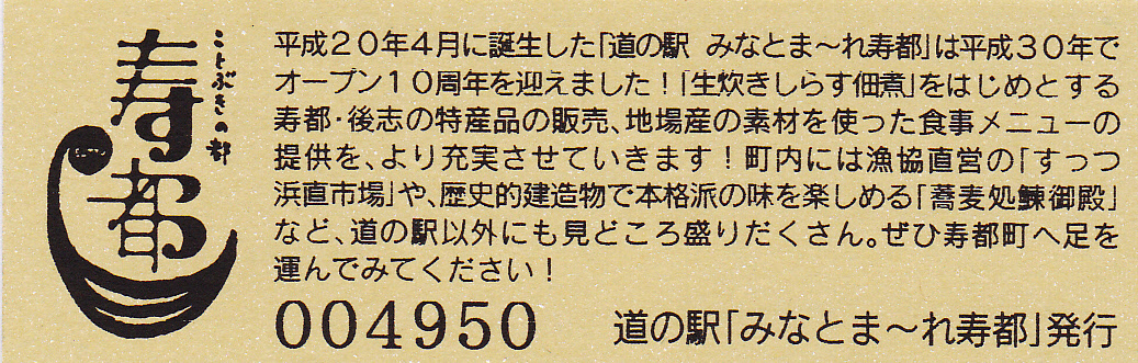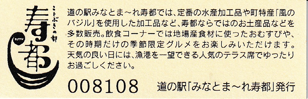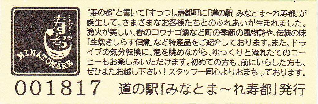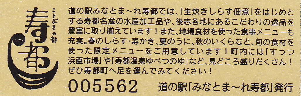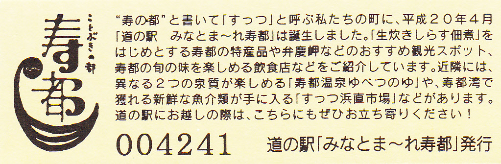 000001-000600:デザインきっぷ(寿都ロゴのみ) 000601-000900:デザインきっぷ(飛ぶ風太) 000901-001200:デザインきっぷ(寿都ロゴ・四角・表題あり) 001201-001500:デザインきっぷ(寿都名産カキホタテ) 001501-001800:デザインきっぷ(風太・弁慶) 001801-002100:デザインきっぷ(寿都ロゴ・四角・表題なし) 002101-002400:デザインきっぷ(風太・寿都温泉) 002401-003000:デザインきっぷ(ゆべつのゆ) 003001-003300:180円きっぷ(寿都ホッケめし・デビュー1周年) 003301-003600:180円きっぷ(寿都ホッケめし・2013年にリニューアル) 003601-003900:180円きっぷ(寿都ホッケめし・ふきだしあり) 003901-004200:180円きっぷ(寿都ロゴ・寿都温泉ゆべつのゆ) 004201-004500:180円きっぷ(寿都ロゴ・生炊きしらす佃煮) 004501-004900:180円きっぷ(寿都ロゴ・後志コーナー) 004901-005200:180円きっぷ(寿都ロゴ・すっつ浜直市場) 005201-005500:180円きっぷ(寿都ロゴ・季節限定メニュー) 005501-005900:180円きっぷ(寿都ロゴ・春のしらす・寿かき・夏のうに・秋のいくら) 005901-006200:180円きっぷ(寿都ロゴ・寿都の新たな特産品「風のバジル」) 006201-006500:180円きっぷ(寿都ロゴ・バジル焼酎などのお土産品) 006501-006900:180円きっぷ(寿都ロゴ・ここでしか食べられないメニュー) 006901-007200:200円きっぷ(寿都ロゴ・各種水産加工品や地場産の天然はちみつ) 007201-007500:200円きっぷ(寿都ロゴ・定番の水産加工品や町特産「風のバジル」) 007501-007800:200円きっぷ(寿都ロゴ・ご朱印巡り) 007801- 008100:200円きっぷ(寿都ロゴ・期間限定商品) 008101- :200円きっぷ(寿都ロゴ・夏はうに、冬はほっけ)