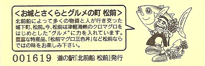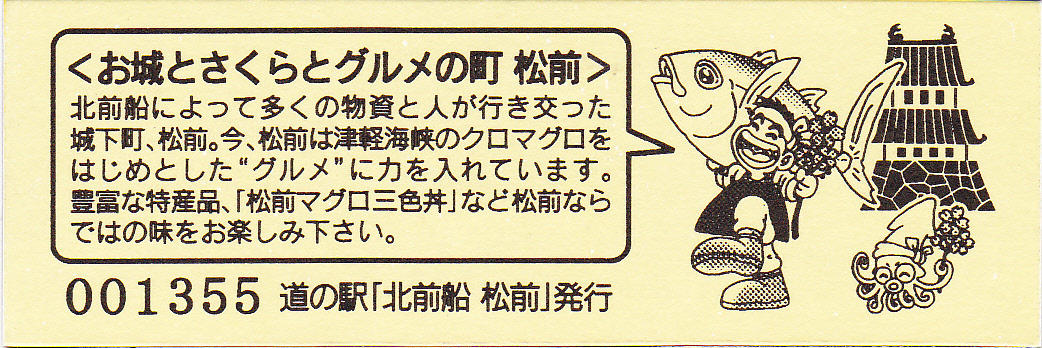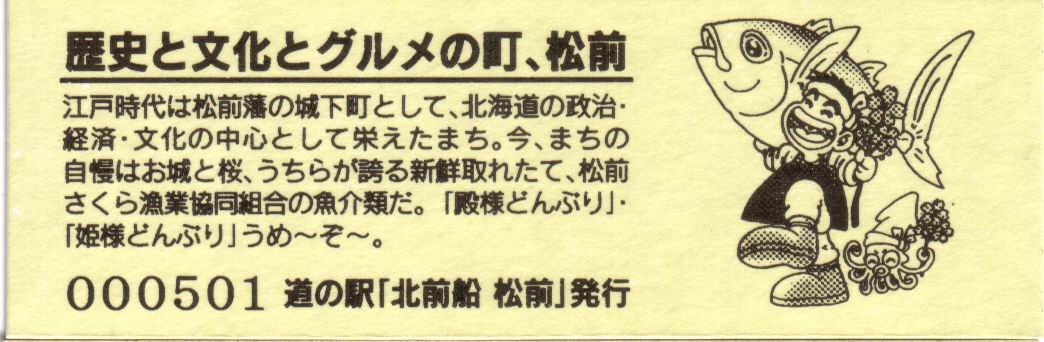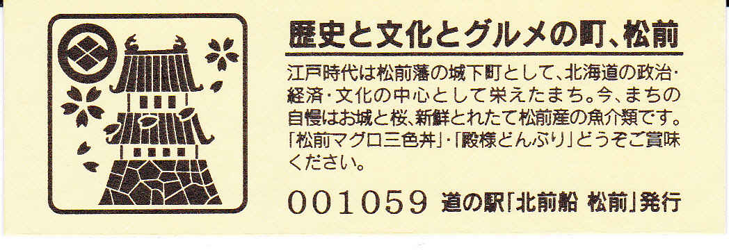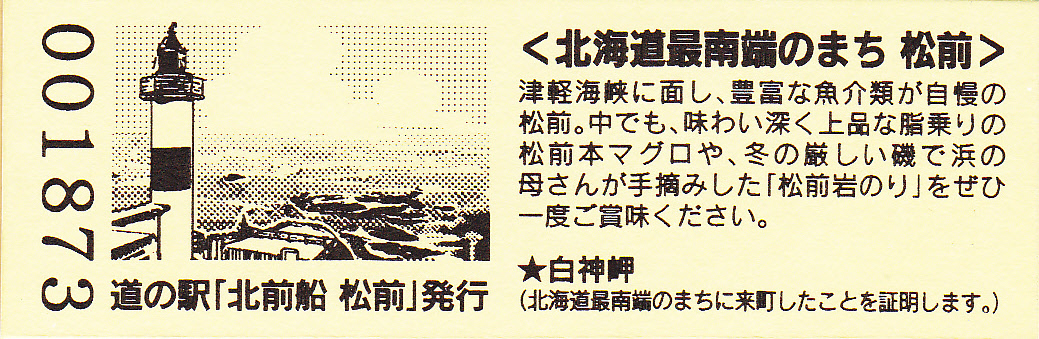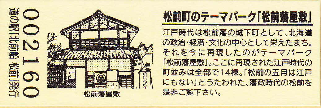 0001-0500:デザインきっぷ(スタンプ) 0501-1000:デザインきっぷ(少年、魚、いか・文章枠なし) 1001-1300:デザインきっぷ(松前城) 1301-1600:デザインきっぷ(少年、魚、いか、松前城) 1601-1800:デザインきっぷ(少年、魚、いか・文章枠あり) 1801-2100:デザインきっぷ(北海道最南端のまち松前) 2101-2600:デザインきっぷ(松前藩屋敷) 2601-2900:デザインきっぷ(北鴎碑林) 2901-7400:180円きっぷ 7401- :200円きっぷ