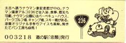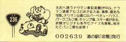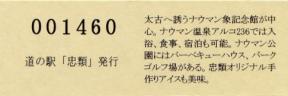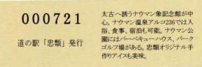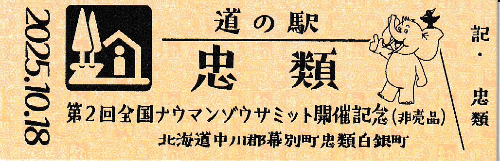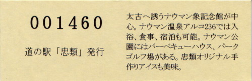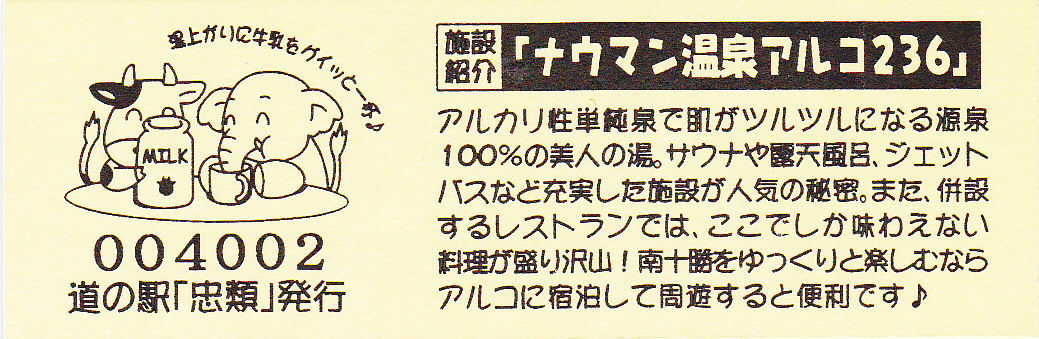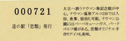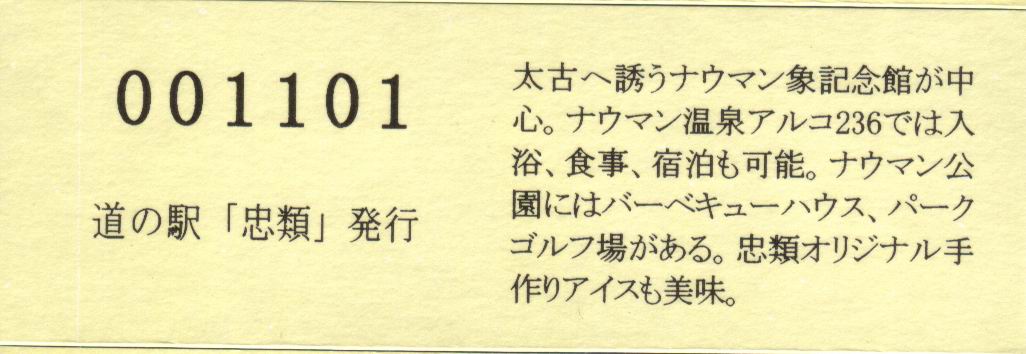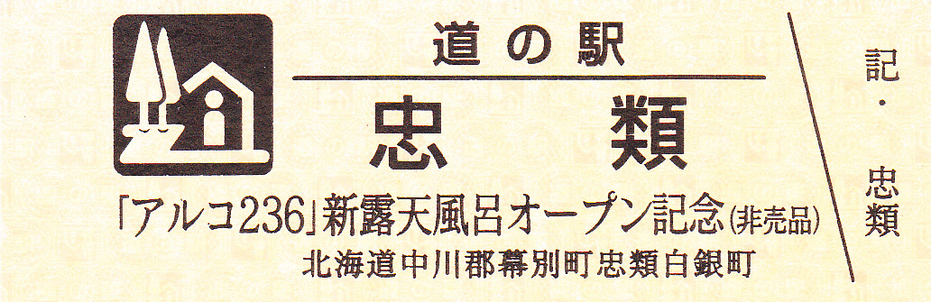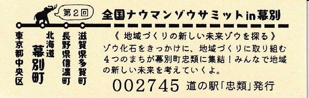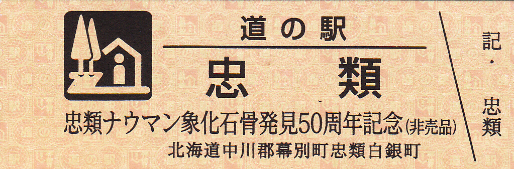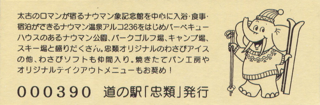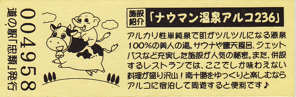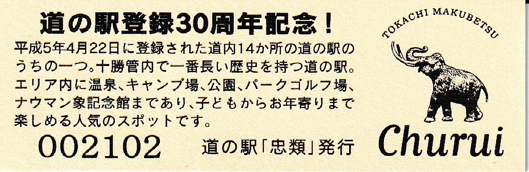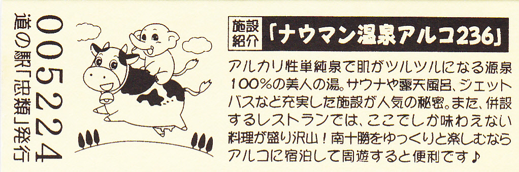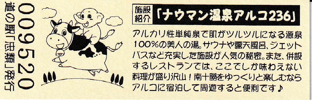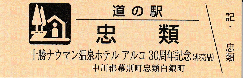 000001-000300:幕別町・忠類村合併記念きっぷ(配布終了) 000301-000800:新築移転オープン記念きっぷ(配布終了) 000801-001200:帯広・広尾自動車道忠類大樹IC開通記念きっぷ(配布終了) 001201-001500:新・ご当地グルメグランプリ北海道2016in大樹開催記念きっぷ(配布終了) 001501-001800:「アルコ236」新露天風呂オープン記念(配布終了) 001801-002100:忠類ナウマン象化石骨発見50周年記念(配布終了) 002101-002400:道の駅登録30周年記念(配布終了) 002401-002700:十勝ナウマン温泉ホテル アルコ30周年記念(配布終了) 002701-003000:第2回全国ナウマンゾウサミット開催記念(配布終了)