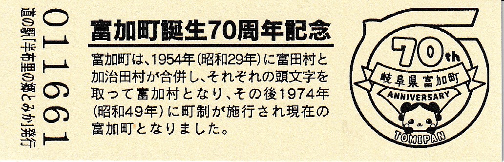 004301~004600 180円きっぷ(富加町誕生60周年)