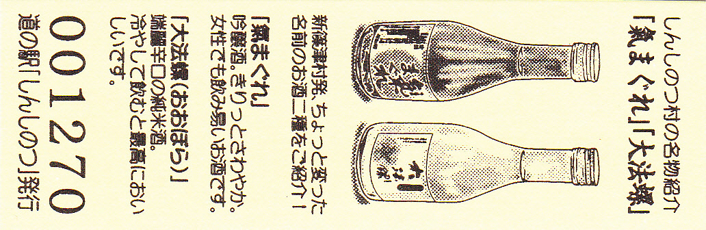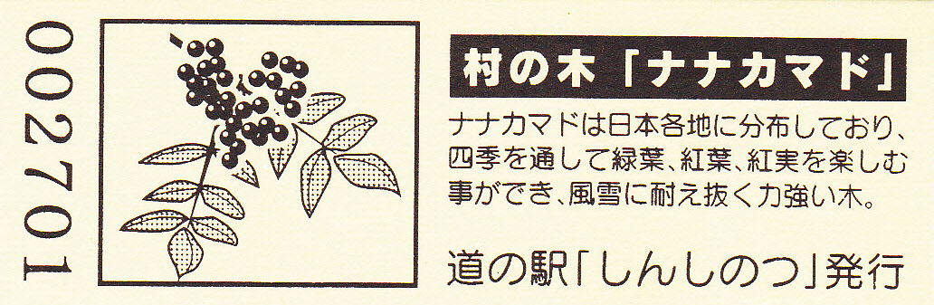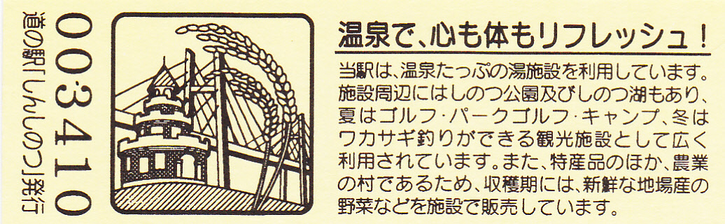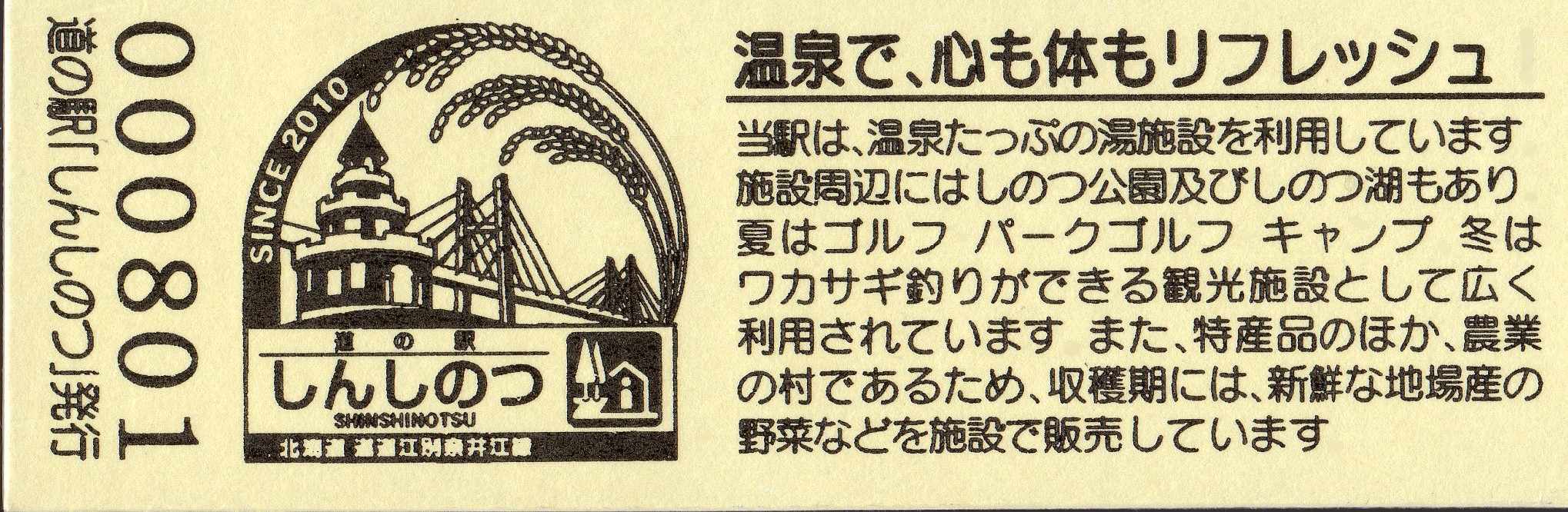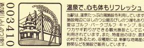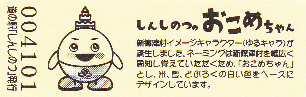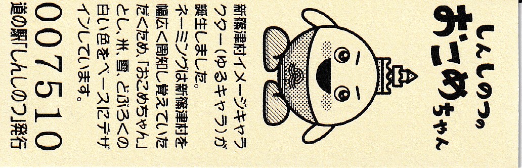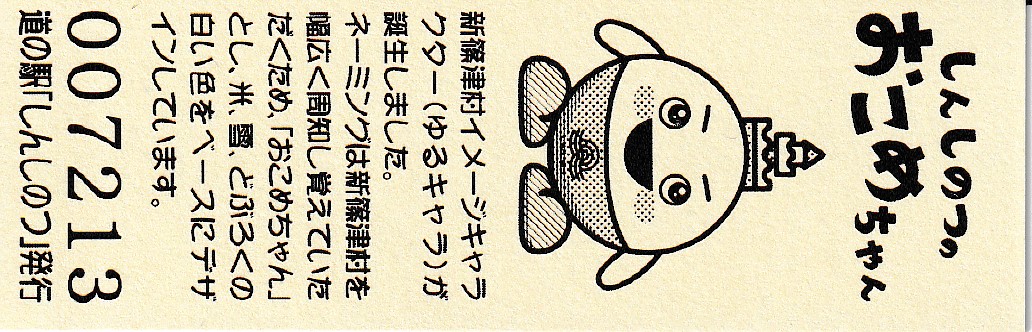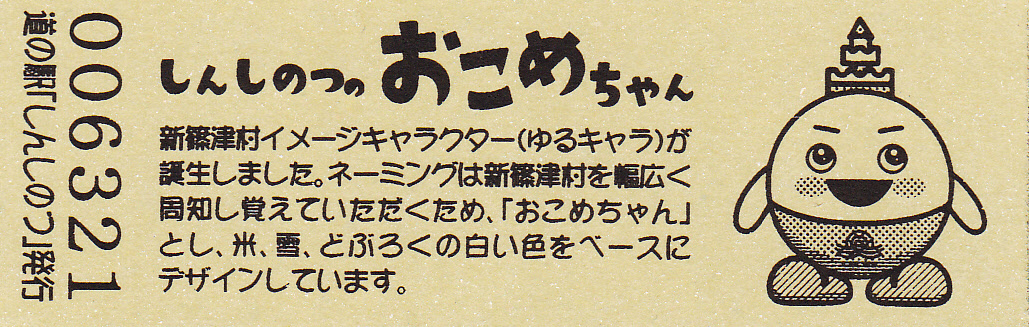 000001-000800:デザインきっぷ(たっぷの湯) 000801-001200:デザインきっぷ(スタンプ) 001201-002000:デザインきっぷ(氣まぐれ・大法螺) 002001-002400:デザインきっぷ(新しのつ麦酒) 002401-002700:デザインきっぷ(ナナカマド) 002701-003400:180円きっぷ(ナナカマド) 003401-004100:180円きっぷ(カントリーサイン) 004101-006300:180円きっぷ(おこめちゃん・左) 006301-007200:180円きっぷ(おこめちゃん・右) 007201-007500:180円きっぷ(おこめちゃん・縦) 007501-008100:200円きっぷ(おこめちゃん・縦) 008101- :200円きっぷ(おこめちゃん・稲穂)