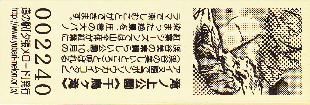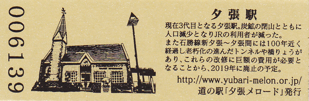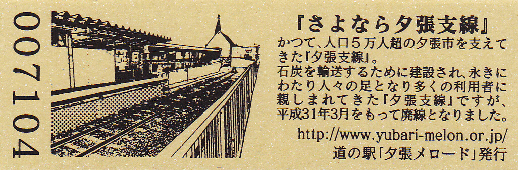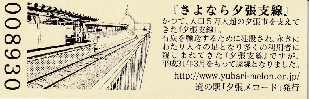 0001-0300:デザインきっぷ(ユメロン) 0301-0600:デザインきっぶ(メロリーナ) 0601-1000:デザインきっぶ(夕張鹿鳴館) 1001-1500:デザインきっぶ(幻の三弦橋) 1501-2200:デザインきっぶ(夕張岳) 2201-3100:デザインきっぶ(滝ノ上公園) 3101-3400:180円きっぶ(滝ノ上公園) 3401-4000:180円きっぶ(夕張温泉) 4001-4600:180円きっぶ(幻の三弦橋・文章6行) 4601-6100:180円きっぶ(幻の三弦橋・文章7行) 6101-7100:180円きっぶ(夕張駅) 7101-8900:180円きっぶ(さよなら夕張支線) 8901- :200円きっぶ(さよなら夕張支線)